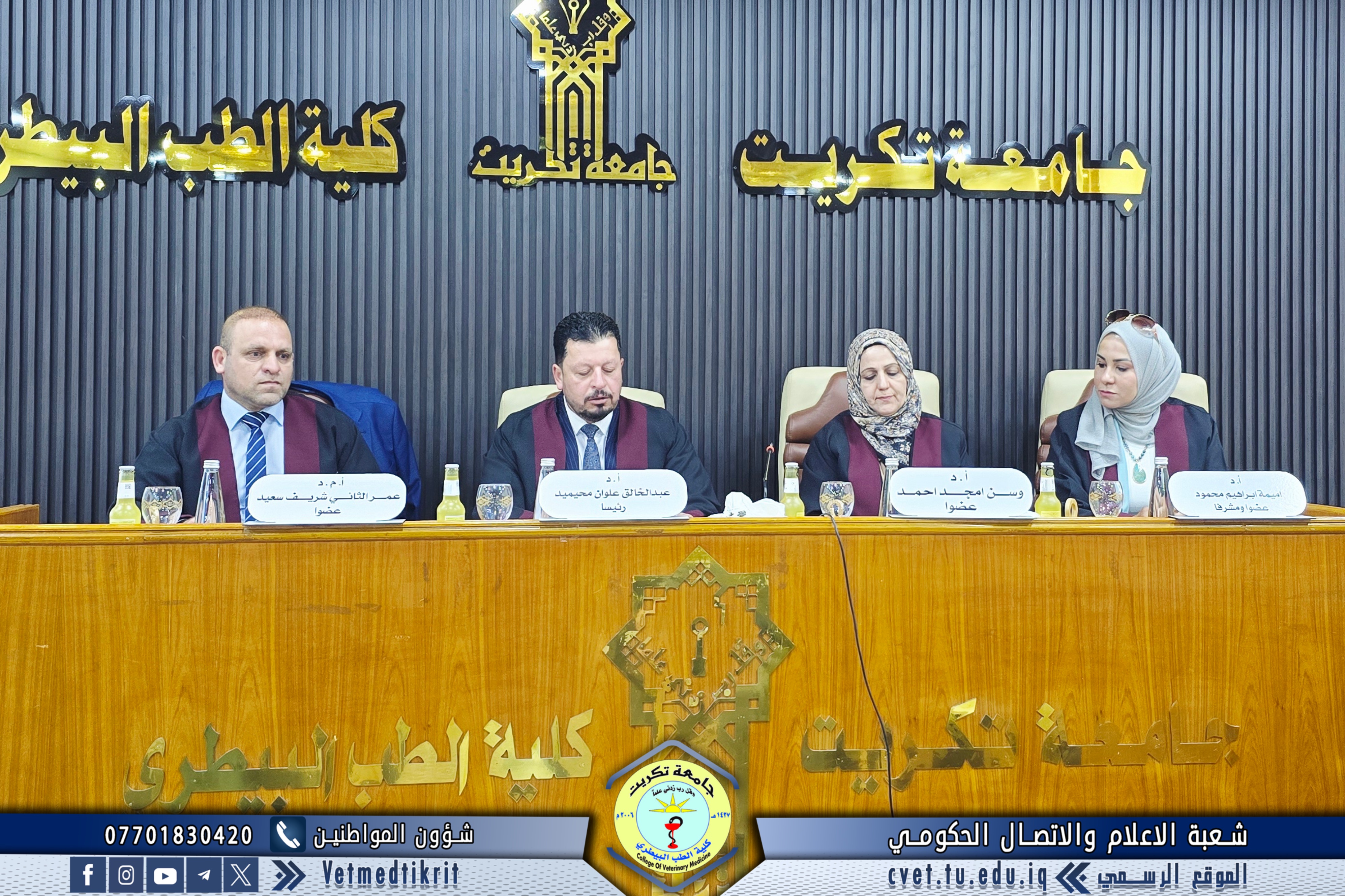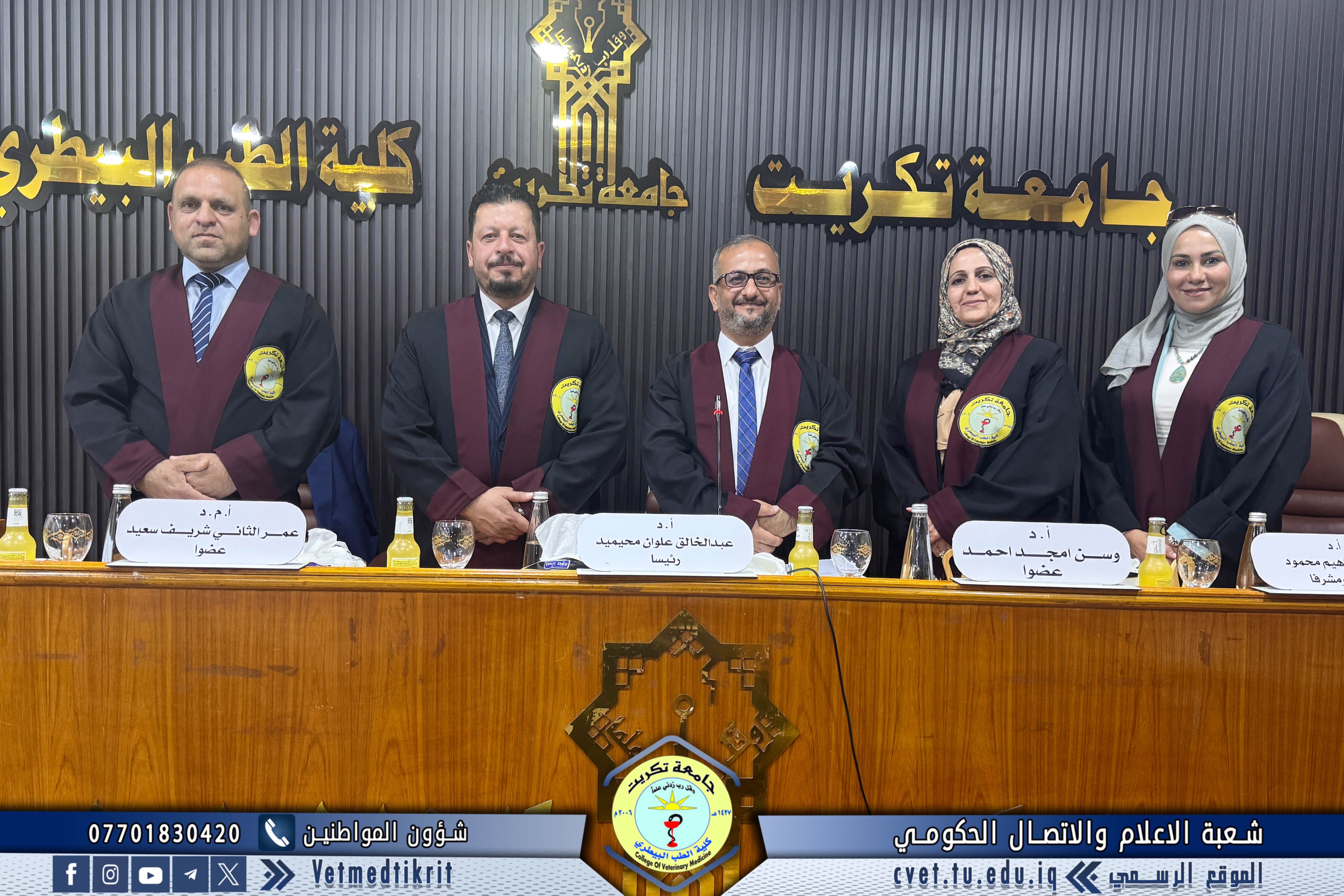 تم بعون الله تعالى في كلية الطب البيطري في جامعة تكريت وبحضور الاستاذ الدكتور بشار صادق نومي عميد الكلية مناقشة رسالة الماجستير الموسومة (التوصيف الجزيئي لانواع طفيلي التريبانوسوما في الابقار وقياس بعض المعايير المناعية في محافظة ديالى) للطالب (خلدون خليل عبد صالح) في تخصص (الاحياء المجهرية). حيث تألفت لجنة المناقشة من كل من: