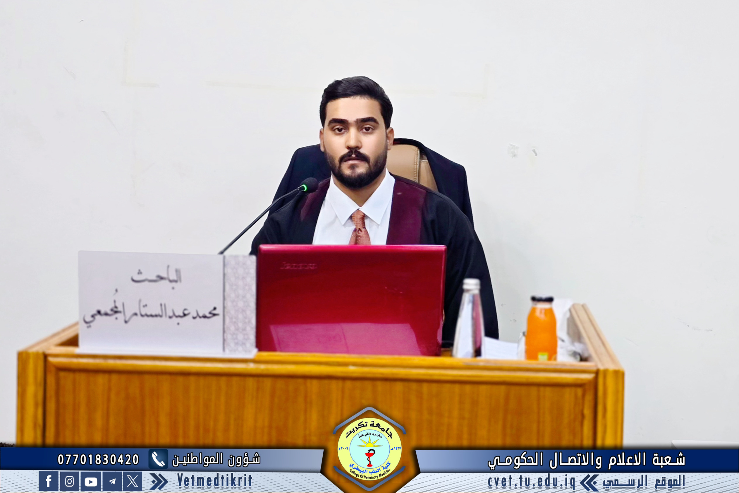 تم بعون الله تعالى في كلية الطب البيطري في جامعة تكريت وبحضور الاستاذ الدكتور بشار صادق نومي عميد الكلية مناقشة رسالة الماجستير الموسومة (دراسة مقارنة مظهرية, نسجية ونسجية كيميائية للمنفحة في الحملان الرضع في الاغنام والماعز المحلية) للطالب (محمد عبدالستار رشيد محمد) في تخصص (الانسجة البيطرية). حيث تألفت لجنة المناقشة من كل من: