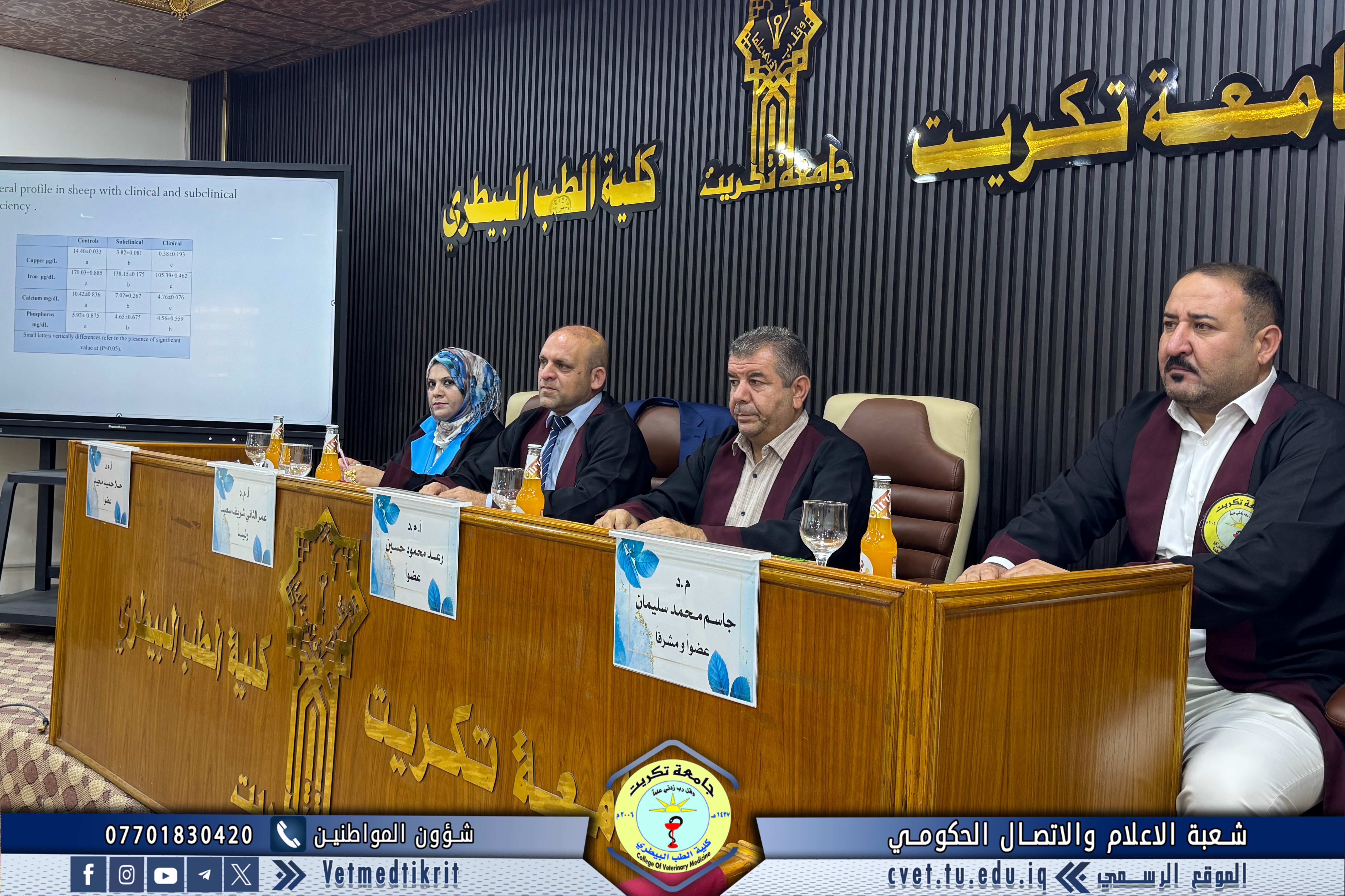 تم بعون الله تعالى في كلية الطب البيطري بجامعة تكريت مناقشة رسالة الماجستير الموسومة (دراسة تشخيصية لمرض نقص النحاس في الأغنام) للطالبة (امتثال ابراهيم نصيف) في تخصص (التشخيصات المرضية). حيث تألفت لجنة المناقشة من كل من: