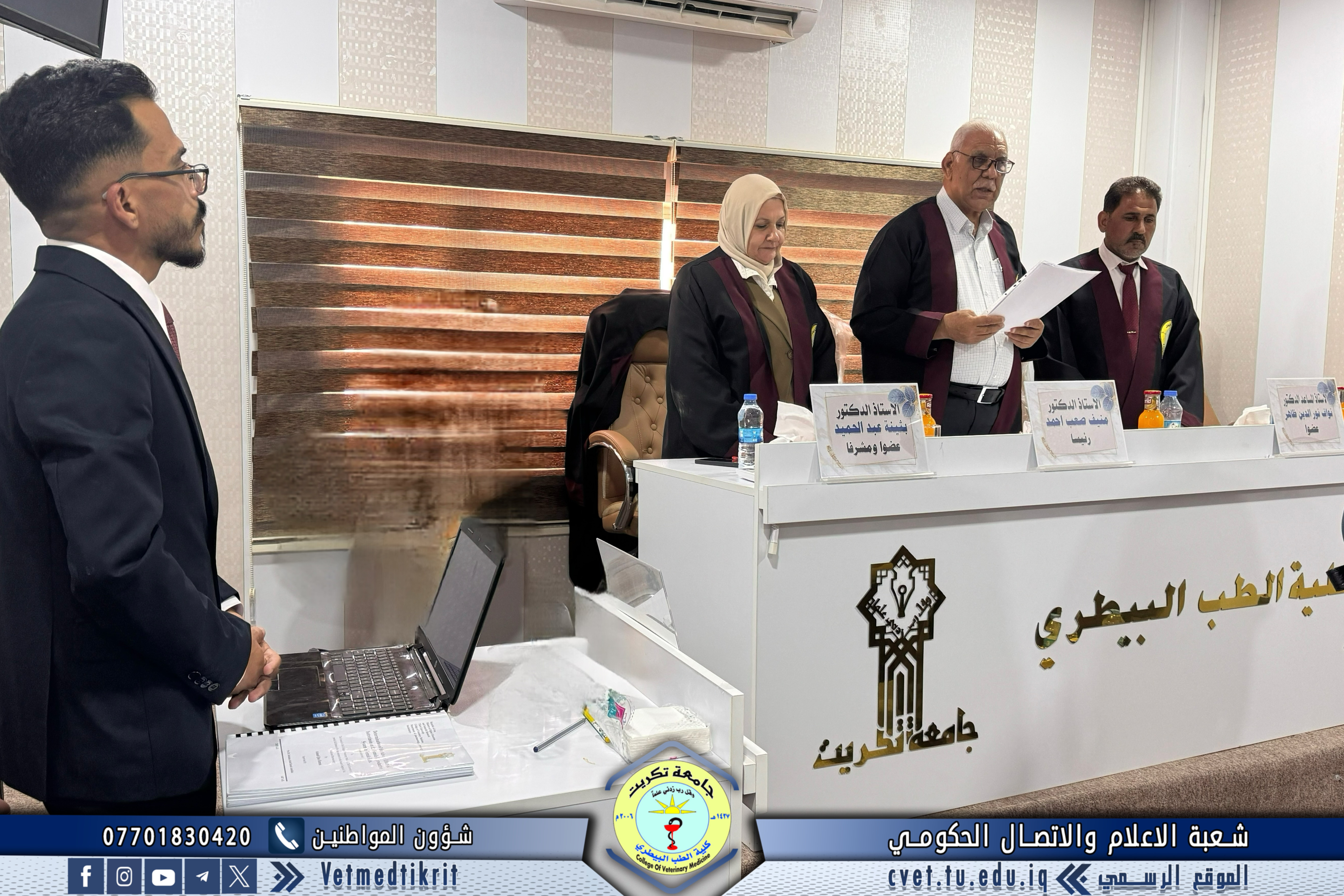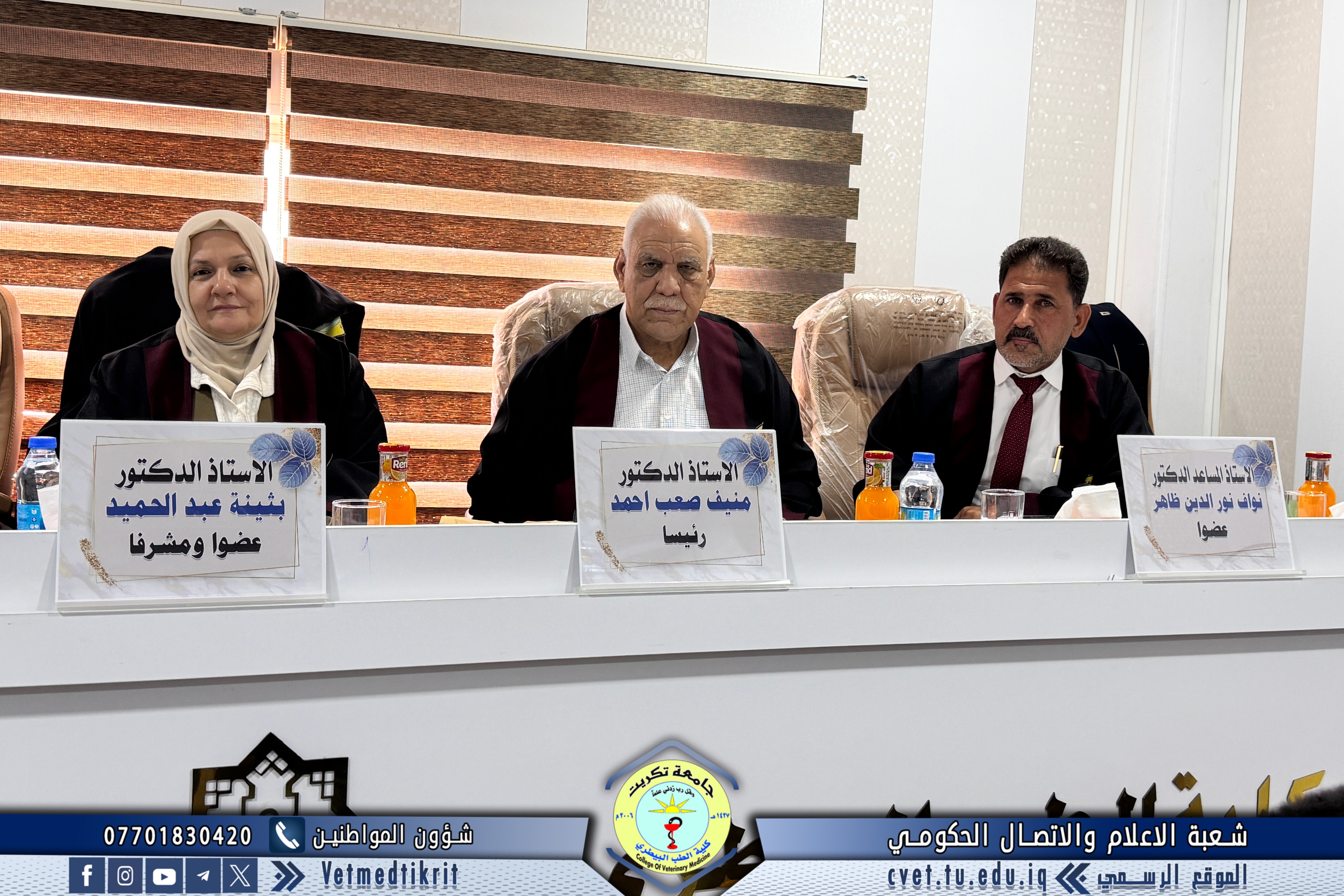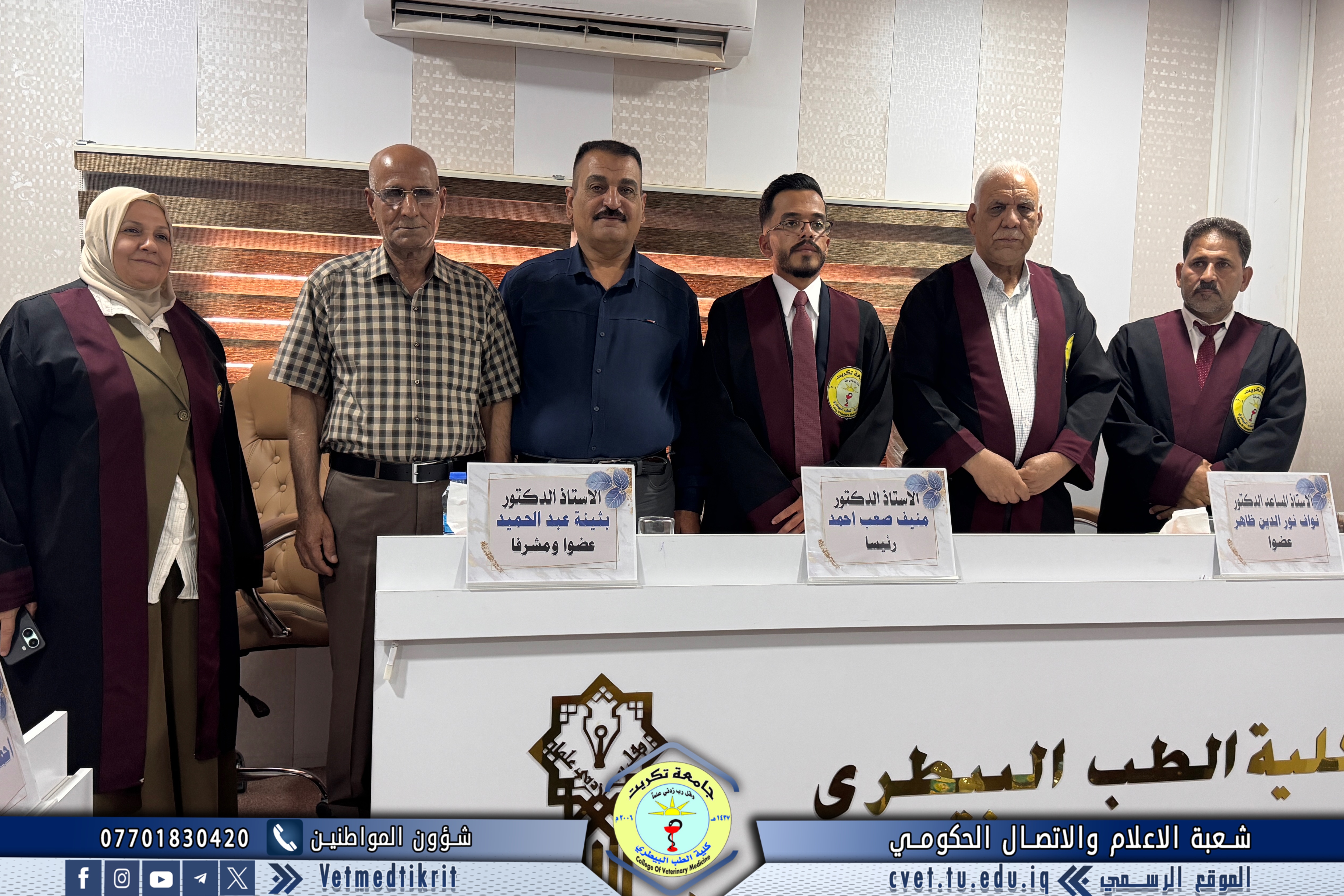 تم بعون الله تعالى وبحضور الاستاذ الدكتور بشار صادق نومي عميد كلية الطب البيطري بجامعة تكريت مناقشة رسالة الماجستير الموسومة (تحديد التاثيرات الضاره لعقار الايزوريتينيون على الجهاز الانثوي في اناث الجرذان) للطالب (احمد قيس حمزة) في تخصص (الادوية الطبية البيطرية). حيث تألفت لجنة المناقشة من كل من: