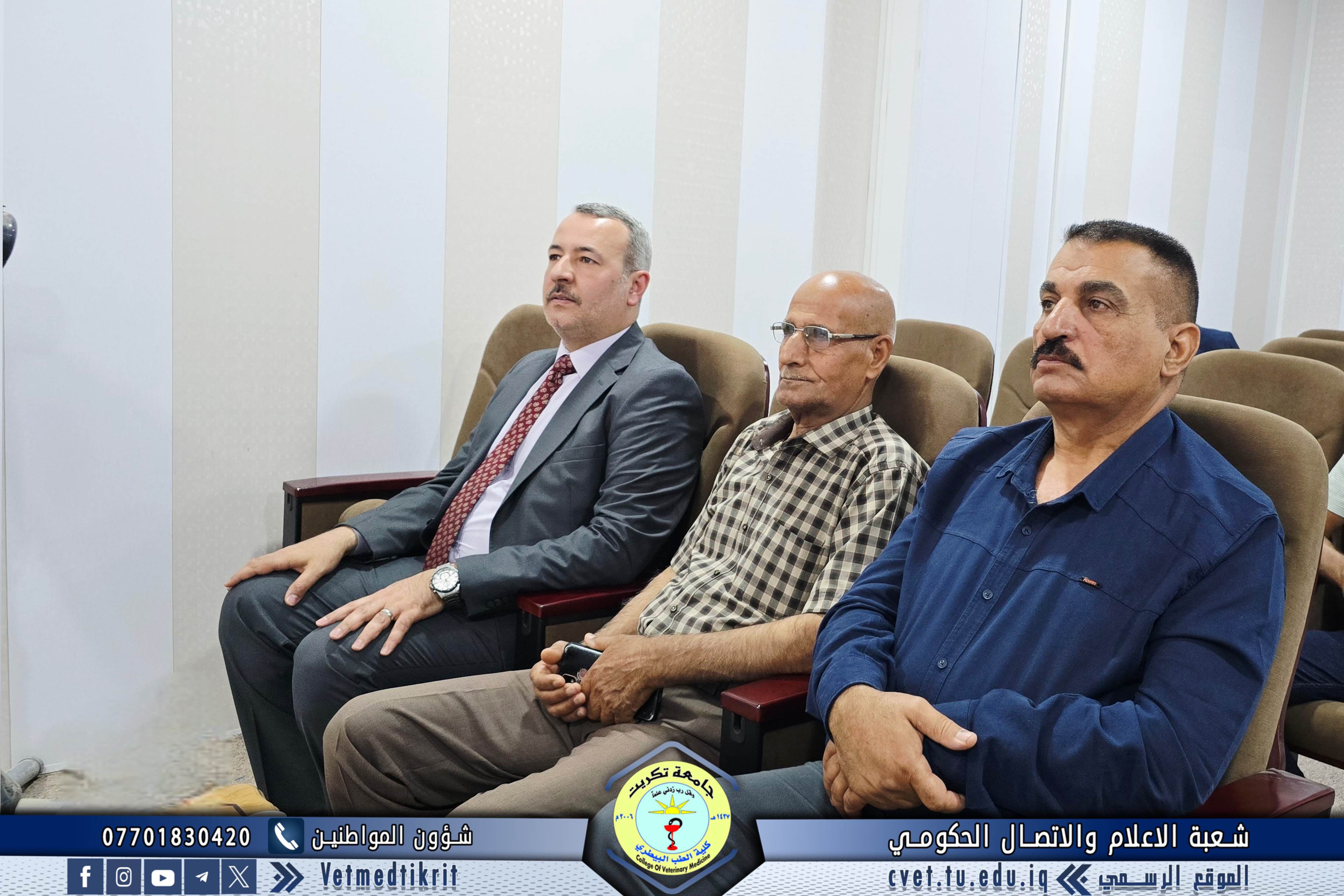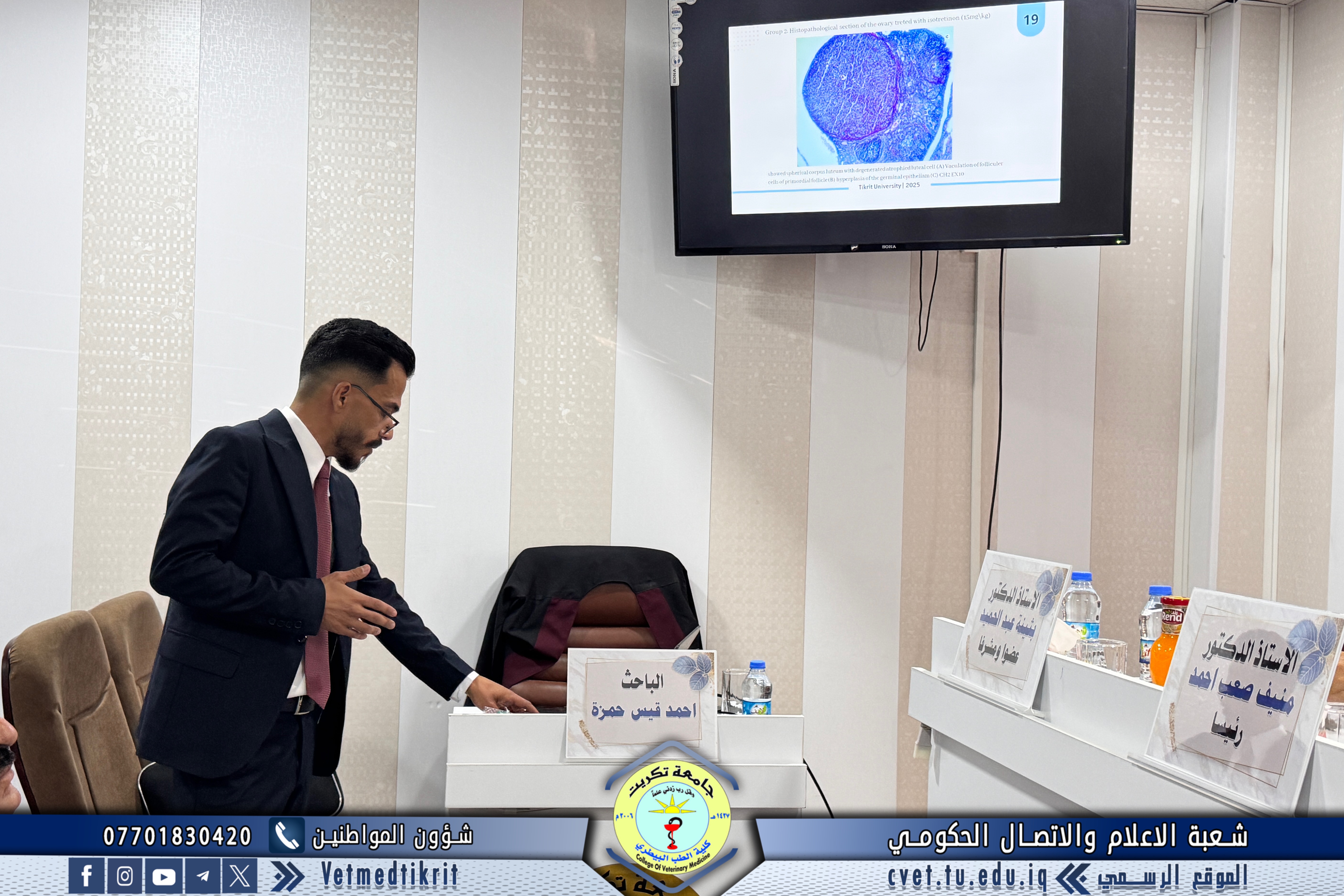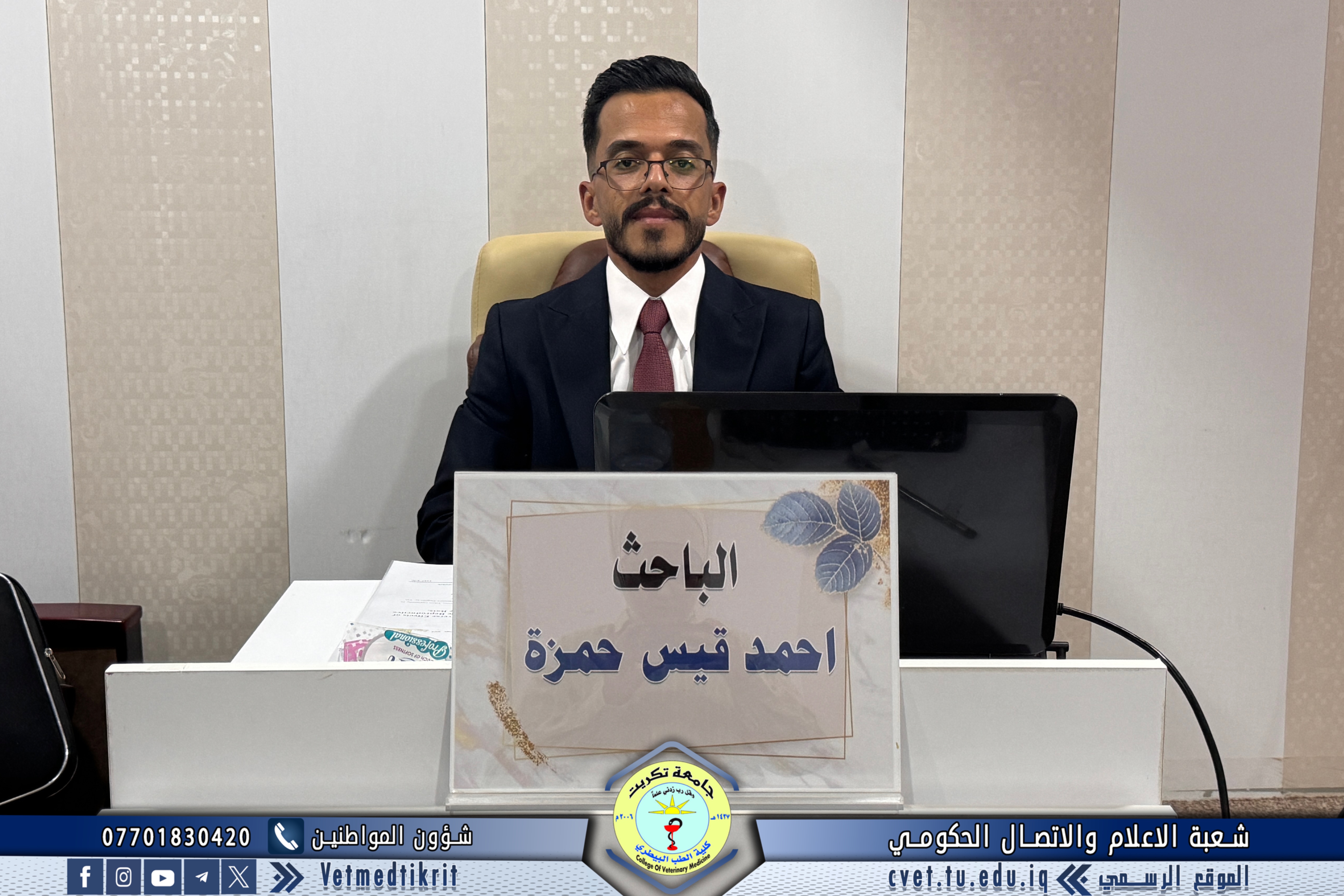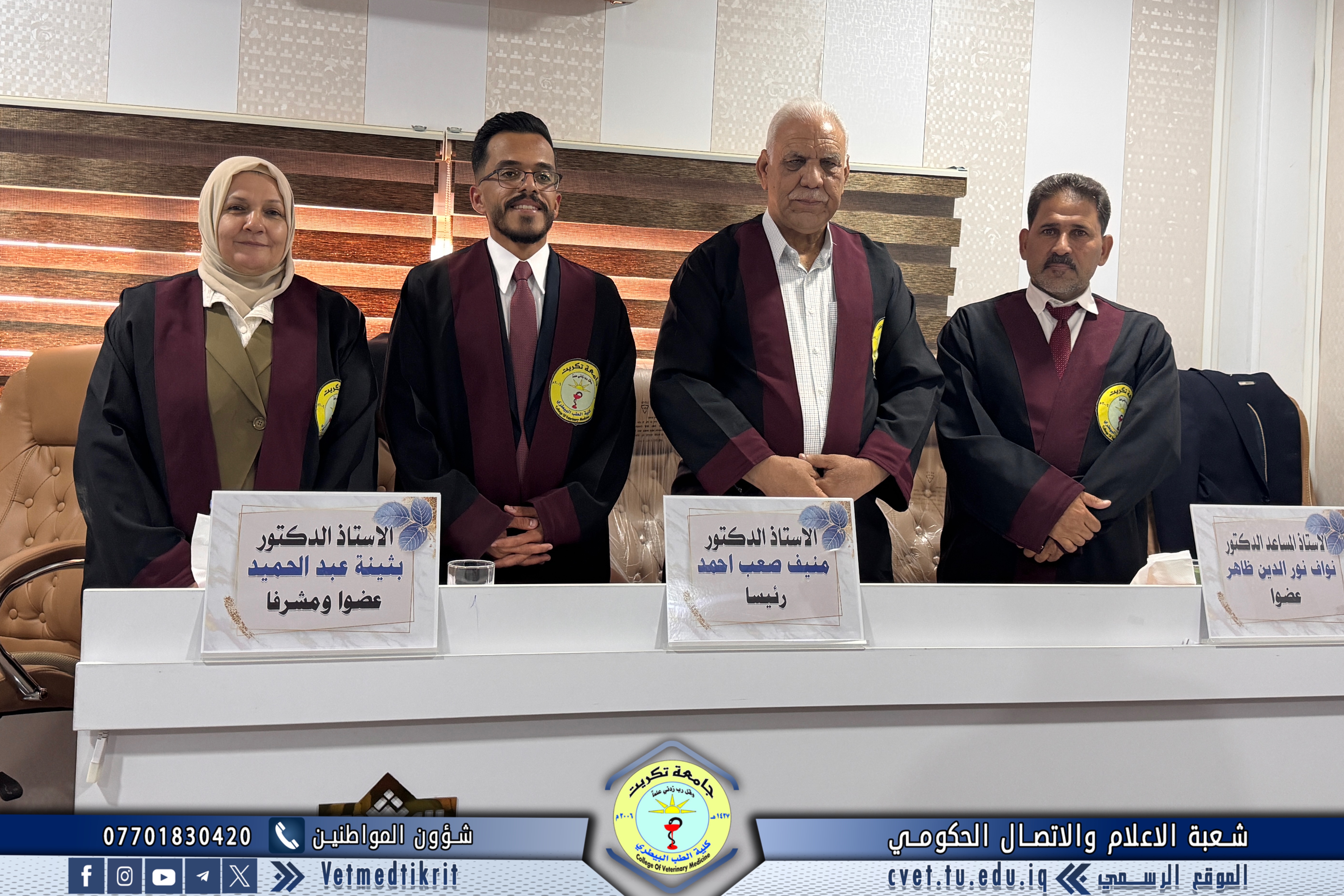 تم بعون الله تعالى وبحضور الاستاذ الدكتور بشار صادق نومي عميد كلية الطب البيطري بجامعة تكريت مناقشة رسالة الماجستير الموسومة (تحديد التاثيرات الضاره لعقار الايزوريتينيون على الجهاز الانثوي في اناث الجرذان) للطالب (احمد قيس حمزة) في تخصص (الادوية الطبية البيطرية). حيث تألفت لجنة المناقشة من كل من: