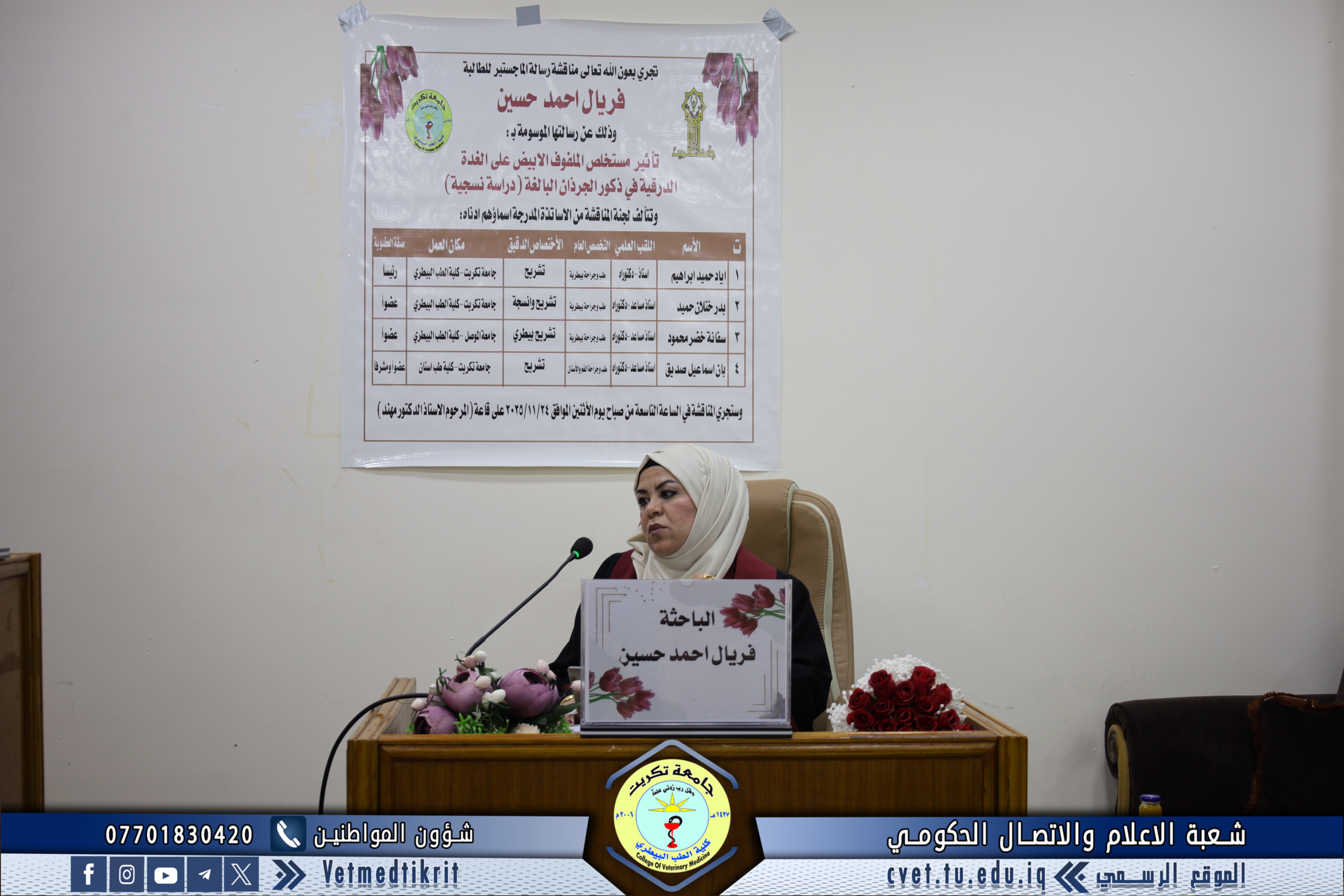 تم بعون الله تعالى في كلية الطب البيطري في جامعة تكريت مناقشة رسالة الماجستير الموسومة (تأثير مستخلص الملفوف الأبيض على الغدة الدرقية في ذكور الجرذان البالغة (دراسة نسيجية)) للطالبة (فريال احمد حسين) في تخصص (الانسجة البيطرية). حيث تألفت لجنة المناقشة من كل من: