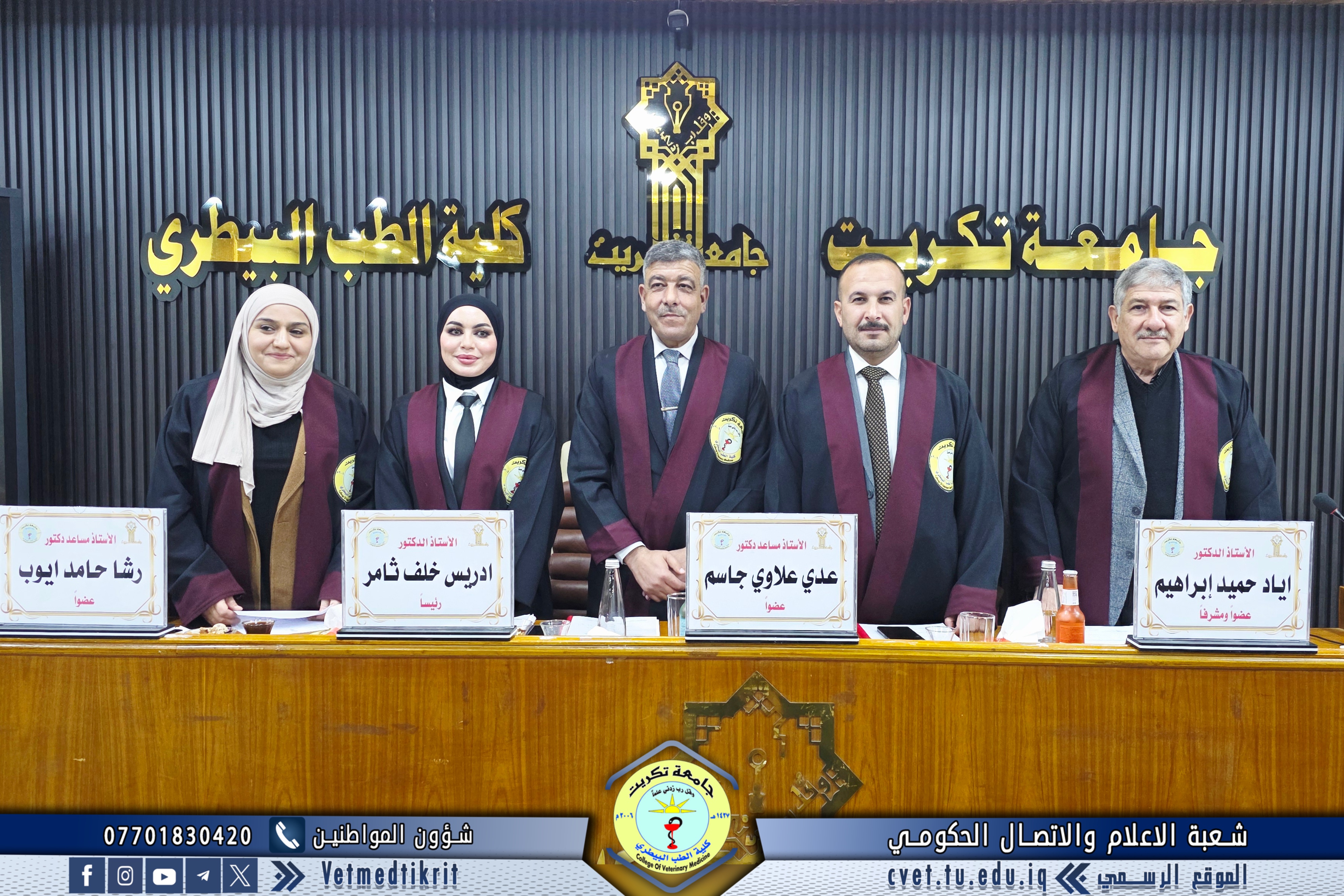 تم بعون الله تعالى في كلية الطب البيطري في جامعة تكريت مناقشة رسالة الماجستير الموسومة (مقارنة التركيب النسجي للغدة الكضرية في الارانب والدجاج المحلي بأعمار مختلفة (دراسة نسجية، نسجية كيميائية وقياسية نسجية)) للطالبة (ديانا محمد رجب) في تخصص (الانسجة البيطرية). حيث تألفت لجنة المناقشة من كل من: