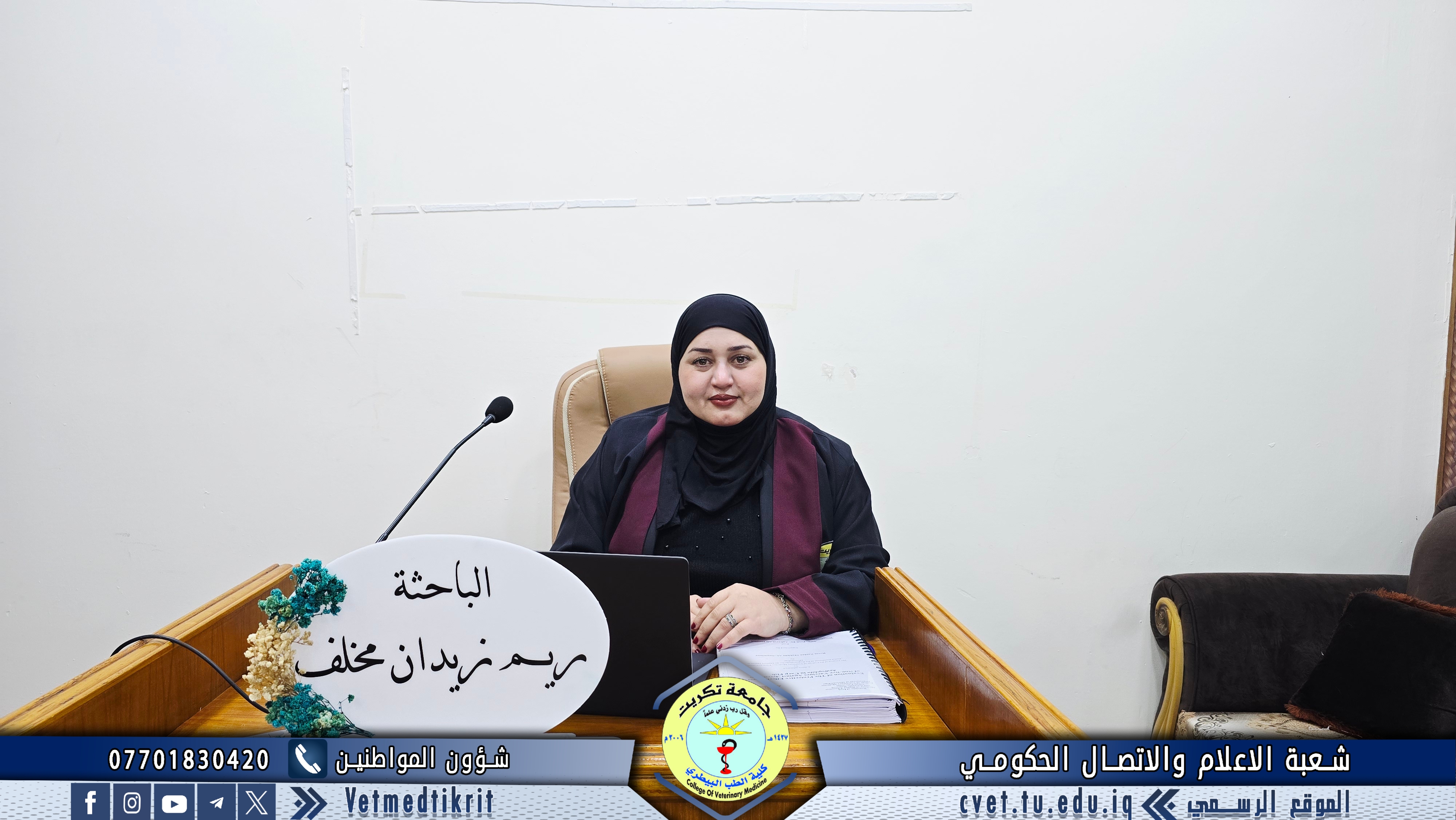 تم بعون الله تعالى في كلية الطب البيطري في جامعة تكريت وبحضور الاستاذ الدكتور بشار صادق نومي عميد الكلية مناقشة رسالة الماجستير الموسومة (تقييم الفعالية الوقائية للقاحات غير الحية ضد بكتيريا Aeromonas Hydrophila في اسماك الكارب) للطالبة (ريم زيدان مخلف) في تخصص (الاحياء المجهرية). حيث تألفت لجنة المناقشة من كل من: