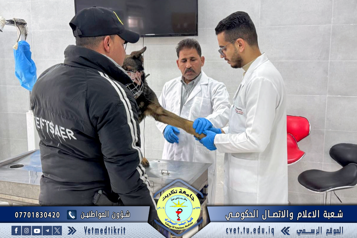ضمن نهج كلية الطب البيطري بجامعة تكريت في تقديم خدماتها للقوات الامنية في محافظة صلاح الدين، استقبلت وحدة العيادة الخارجية حالة بيطرية لكلب K9 تابع لقسم شرطة قضاء بلد بعد ملاحظات حول انتفاخ في قدمه الأمامية. أجرى الفريق الطبي بواسطة الدكتور علي غازي عطيه والدكتور نواف نور الدين ظاهر والطبيب البيطري سيف أحمد سليمان والطبيب البيطري موسى دخيل بحر، فحصًا شاملاً للكلب. بعد تقييم دقيق، تم استبعاد الأسباب الخطيرة المحتملة مثل الكسور أو التسمم، تم وصف العلاج المناسب مع تحديد خطة متابعة مستمرة لضمان الشفاء التام والوقاية من أي مضاعفات مستقبلية. حيث تم تقديم العلاجات المناسبة لضمان تعافي الحيوان وعودته لأداء مهامه الميدانية بكفاءة. تأتي هذه ضمن الجهود المستمرة للوحدة في تقديم الرعاية الطبية البيطرية المتخصصة للحيوانات العاملة في القطاعات الأمنية والخدمية.