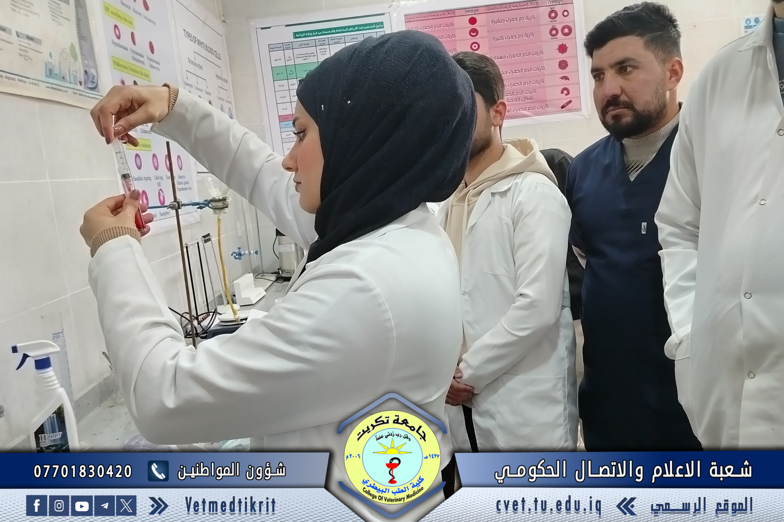 أجرى طلبة المرحلة الخامسة في كلية الطب البيطري بجامعة تكريت تطبيقاً عملياً في مختبر أمراض الدواجن حول اختبار التلزن الدموي للكشف عن فيروس النيوكاسل، وذلك ضمن المنهاج العملي لمادة أمراض الدواجن.