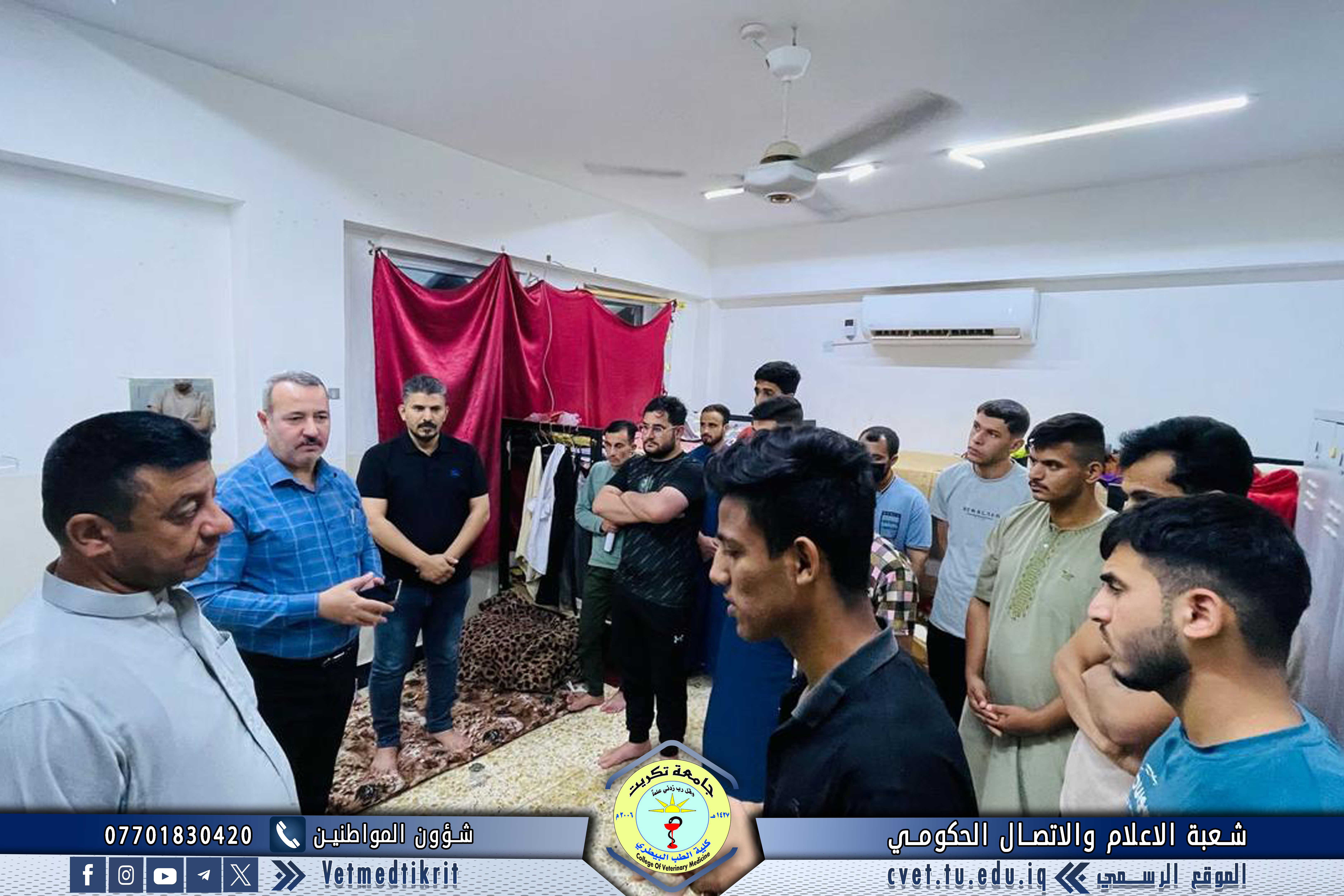 زار وفد من عمادة كلية الطب البيطري بجامعة تكريت الأقسام الداخلية المخصصة لطلبة الكلية، وضم الوفد كلاً من الأستاذ الدكتور بشار صادق نومي عميد الكلية، والأستاذ المساعد الدكتور أسامة حميد شهاب معاون العميد للشؤون الإدارية، والأستاذ المساعد سعد صبار نصيف أمين مجلس الكلية. وتجوّل الوفد في الشقق السكنية الخاصة بطلبة كلية الطب البيطري، حيث التقى بعدد من الطلبة واستمع إلى مطالبهم ومقترحاتهم المتعلقة بالخدمات والسكن الجامعي. وقد وجّه السيد العميد بـتذليل العقبات وتلبية احتياجات الطلبة بما يسهم في توفير بيئة دراسية وسكنية مناسبة، كما أوصى الطلبة بـالتركيز على دراستهم وتحقيق أفضل النتائج الأكاديمية، متمنياً لهم دوام التوفيق والنجاح في مسيرتهم الجامعية.