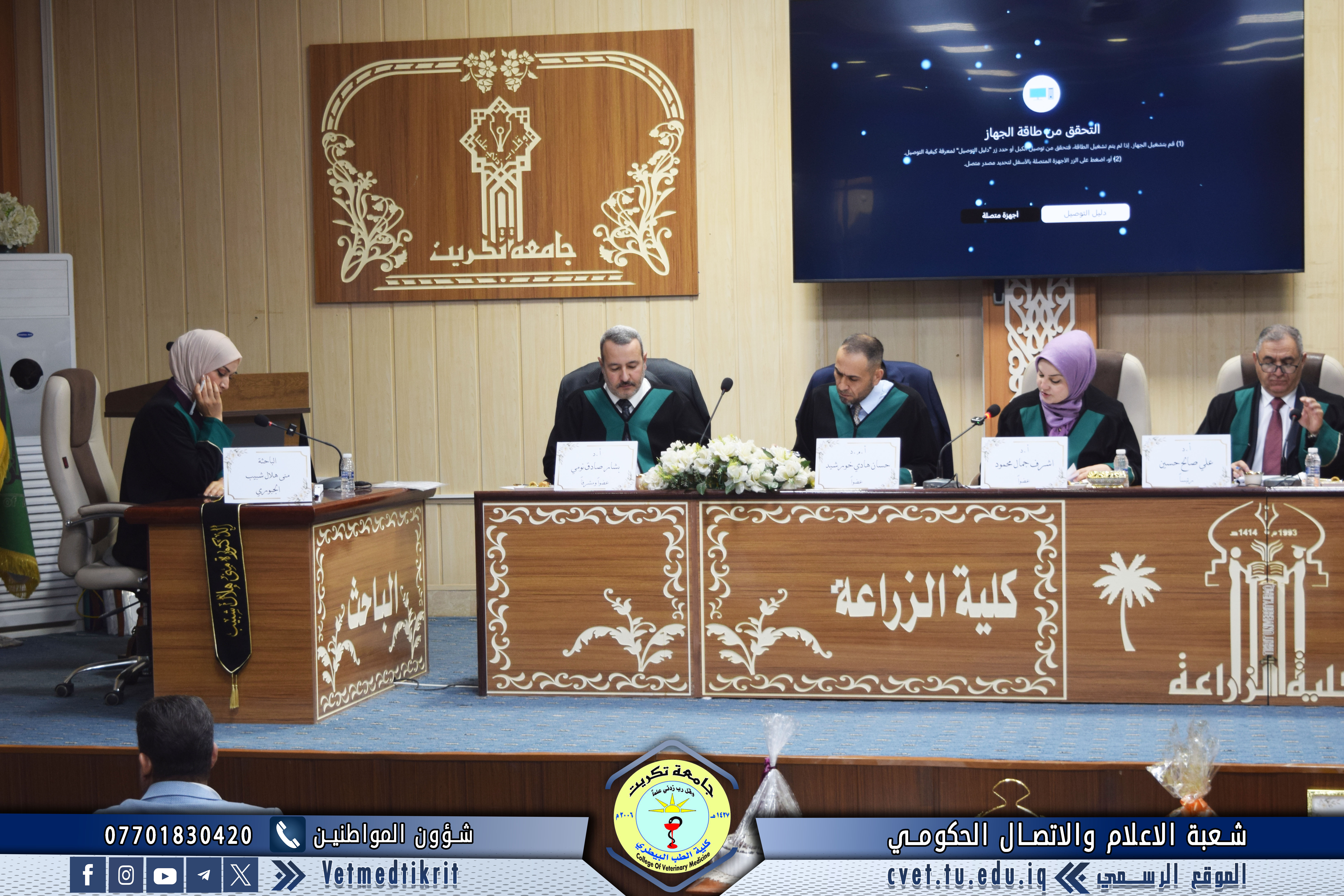 شارك الأستاذ الدكتور بشار صادق نومي، عميد كلية الطب البيطري بجامعة تكريت، في عضوية واشراف لجنة مناقشة أطروحة الدكتوراه الموسومة: (التأثير الفسلجي والمناعي والضد بكتري للاكتوفرين) والمقدّمة من قبل الطالبة منى هلال شبيب في قسم علوم الحياة – كلية التربية للبنات. وقد استضافت كلية الزراعة جلسة المناقشة، التي ترأسها الأستاذ الدكتور علي صالح الجبوري، رئيس الجامعة العراقية، وبعضوية الاستاذ المساعد الدكتور حسان هادي خورشيد رئيس فرع الامراض وامراض الدواجن والاسماك، وبحضور الاستاذ الدكتور وعد محمود رؤوف رئيس الجامعة، والاستاذ الدكتور حسن حسين ابراهيم مساعد رئيس الجامعة للشؤون العلمية، وعدد من الأساتذة والباحثين في المجال. تأتي هذه المشاركة في إطار التعاون العلمي بين الجامعات العراقية، ودعم المسيرة الأكاديمية والبحثية في مجالات العلوم الحياتية والطبية.