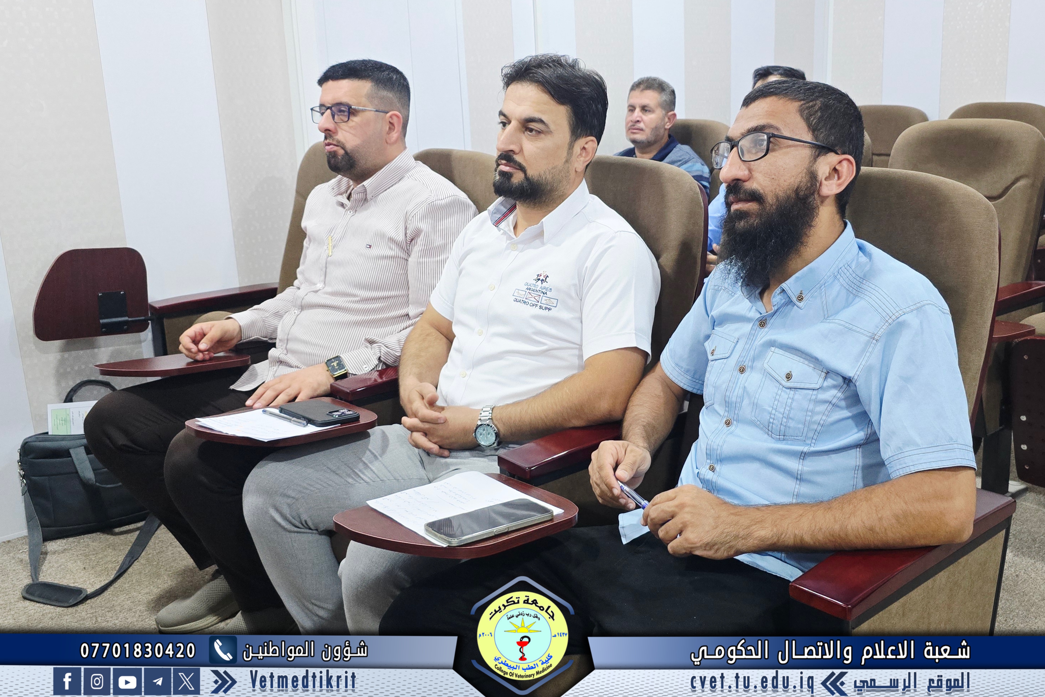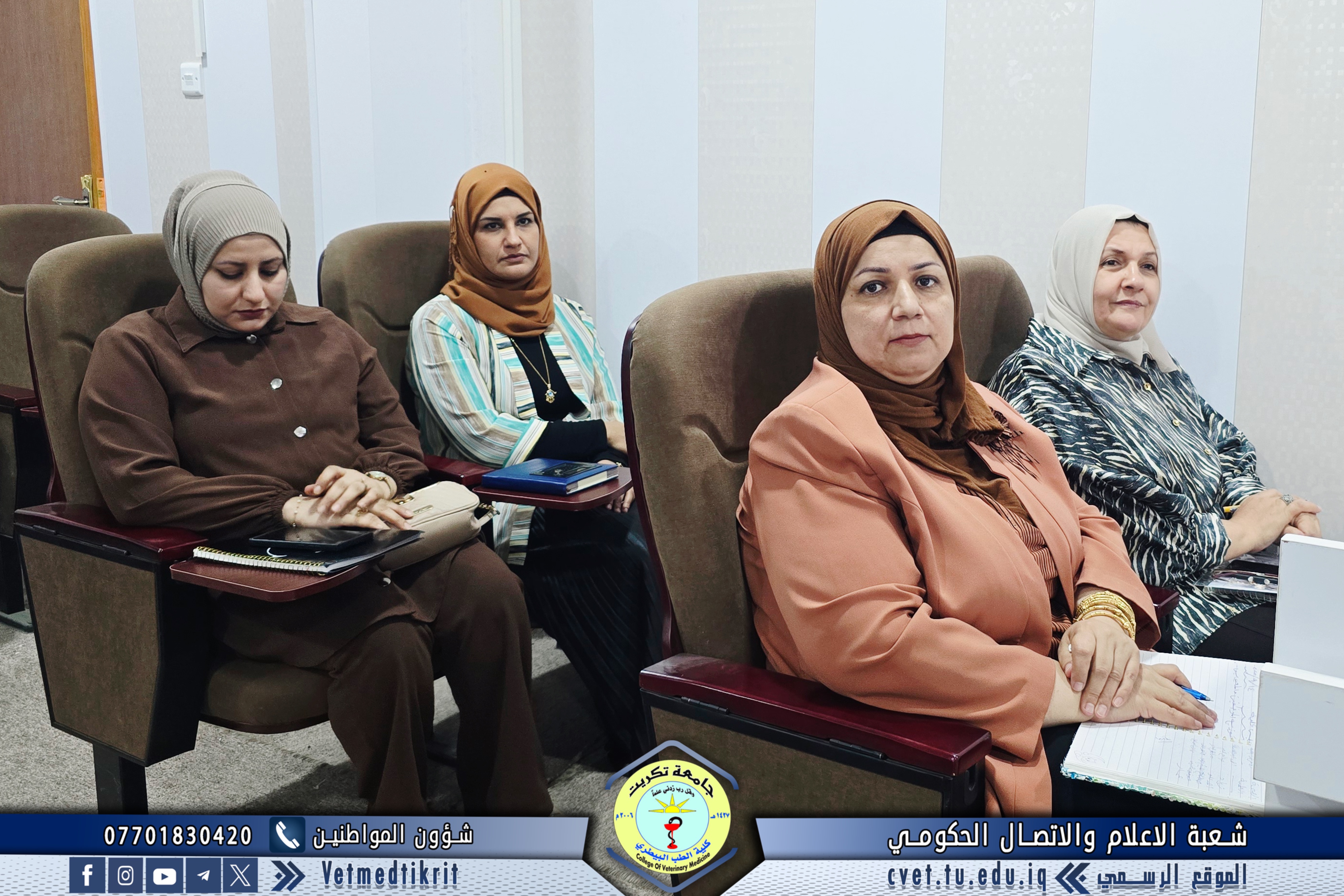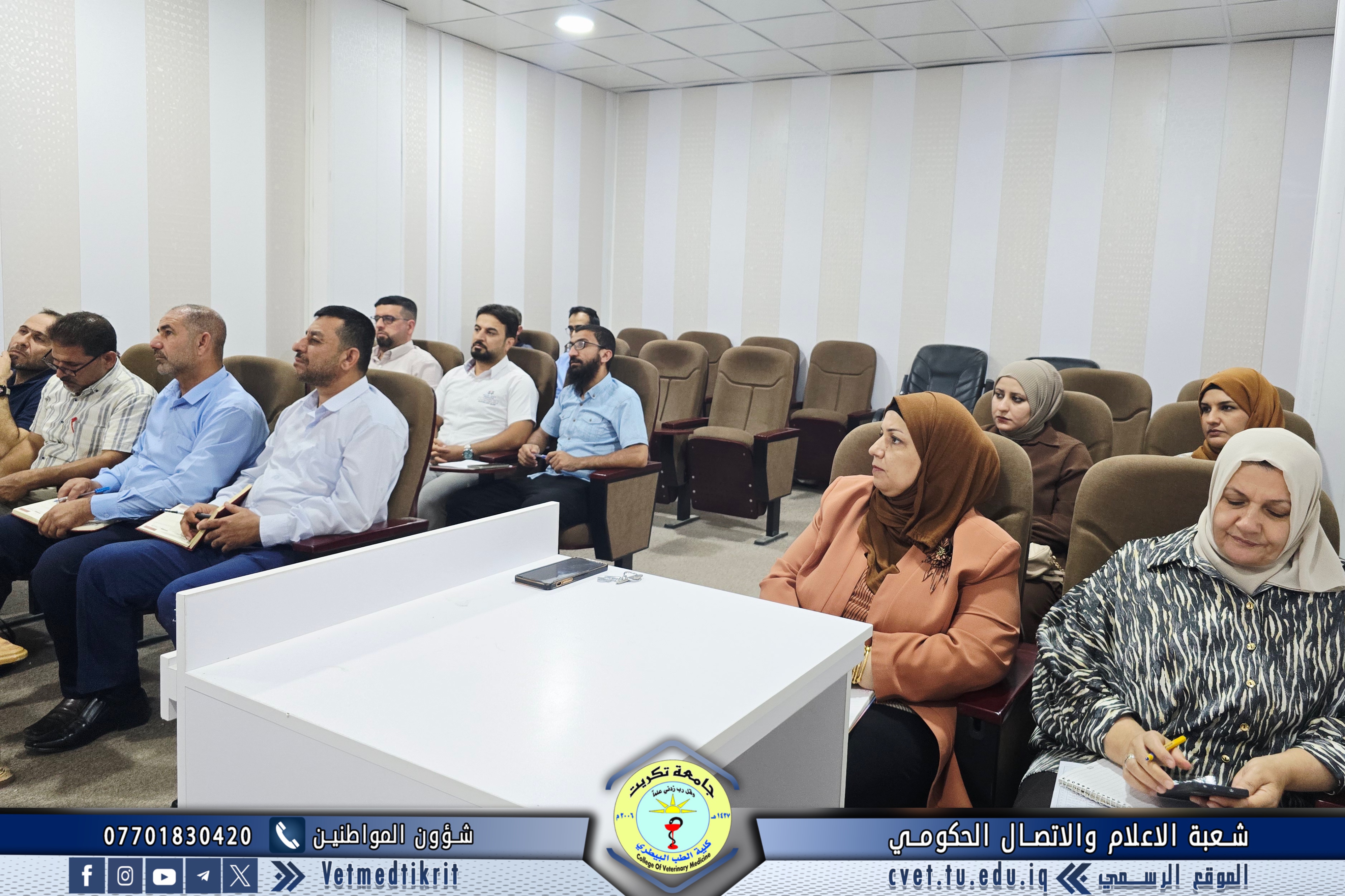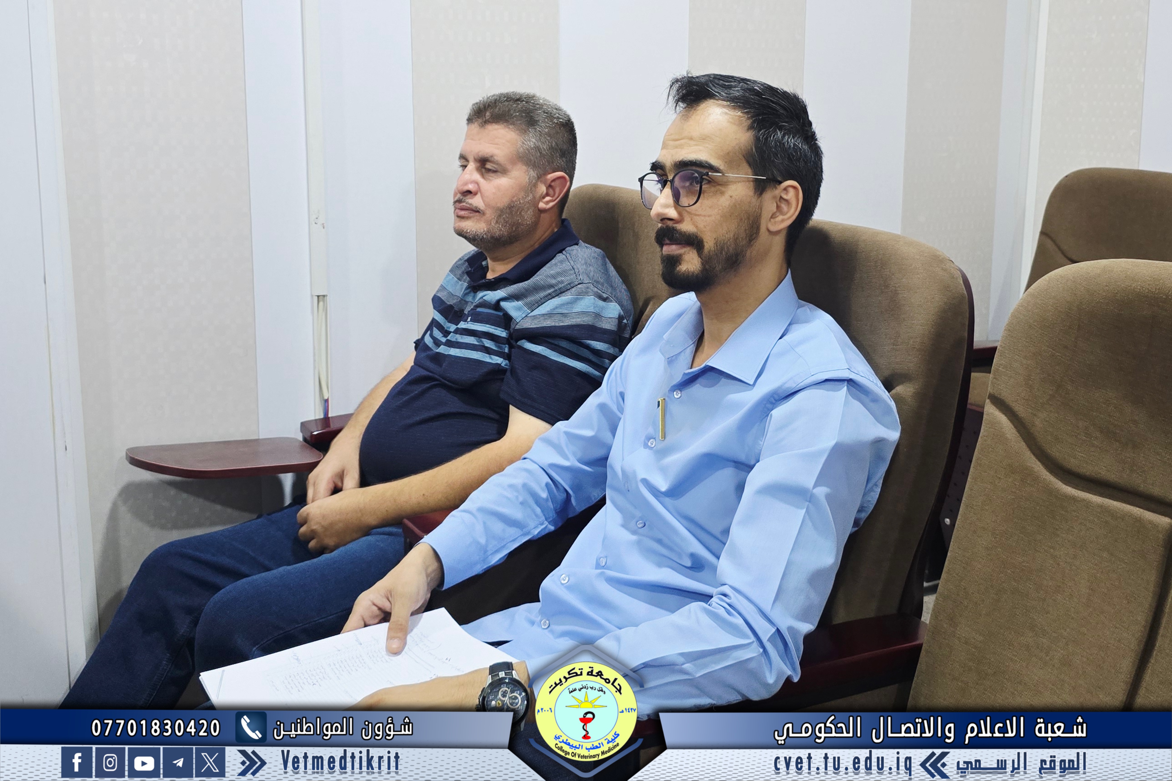 ترأس الأستاذ الدكتور بشار صادق نومي عميد كلية الطب البيطري اجتماعاً موسعاً مع رؤساء الفروع العلمية والشعب في الكلية، بمشاركة الأستاذ المساعد الدكتور منتصر محمد هلال معاون العميد للشؤون العلمية، و الأستاذ المساعد سعد صبار نصيف أمين مجلس الكلية، و المدرس المساعد منتصر محمد ندا مدير شعبة الشؤون الإدارية. وناقش الاجتماع عدداً من المحاور المهمة مع بدء العام الدراسي الجديد، أبرزها: التأكيد على الالتزام بالدوام الرسمي وتنظيمه، تكليف عدد من أعضاء الكادر التدريسي والإداري بمهام في الشعب والوحدات والمختبرات، ومتابعة الجوانب الإدارية والتنظيمية بما يضمن انسيابية العمل وتحقيق أفضل النتائج. ويأتي هذا الاجتماع في إطار حرص عمادة الكلية على تعزيز الانضباط والارتقاء بمستوى الأداء الأكاديمي والإداري بما ينعكس إيجاباً على المسيرة التعليمية والبحثية للكلية.