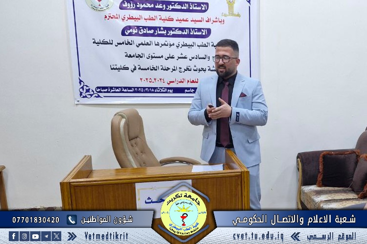 شهدت كلية الطب البيطري في جامعة تكريت فعاليات المؤتمر العلمي الخامس للكلية والسادس عشر على مستوى الجامعة، والمخصص لمناقشة بحوث تخرج طلبة المرحلة الخامسة، بحضور كل من مساعد رئيس الجامعة أ.د. حسن حسين ابراهيم وعميد كلية الطب البيطري أ.د. بشار صادق نومي.