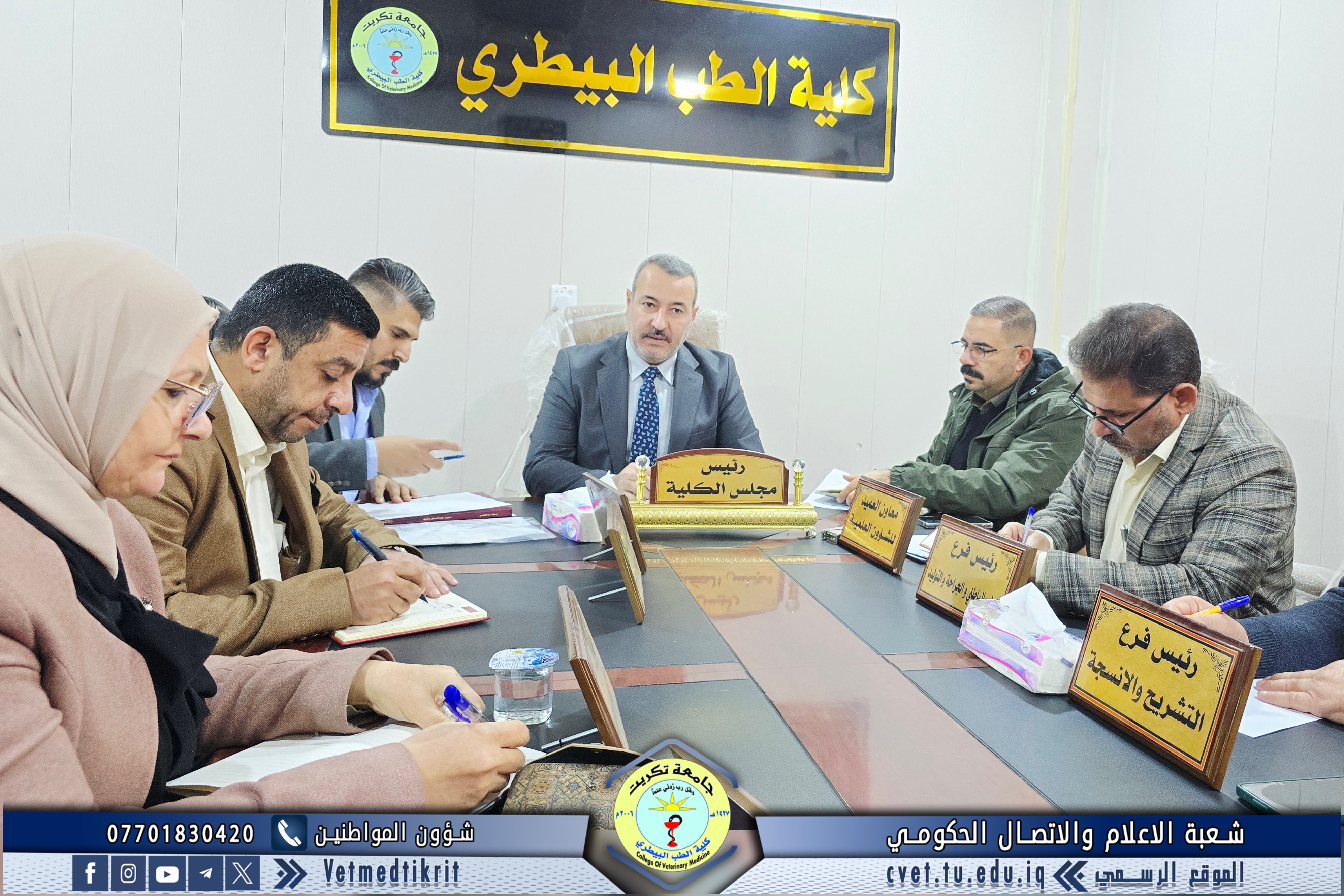 عقد مجلس كلية الطب البيطري في جامعة تكريت جلسته السابعة للعام الدراسي 2025–2026، برئاسة الأستاذ الدكتور بشار صادق نومي عميد الكلية، وبحضور السادة معاوني العميد، والسيدات والسادة رؤساء الفروع العلمية.