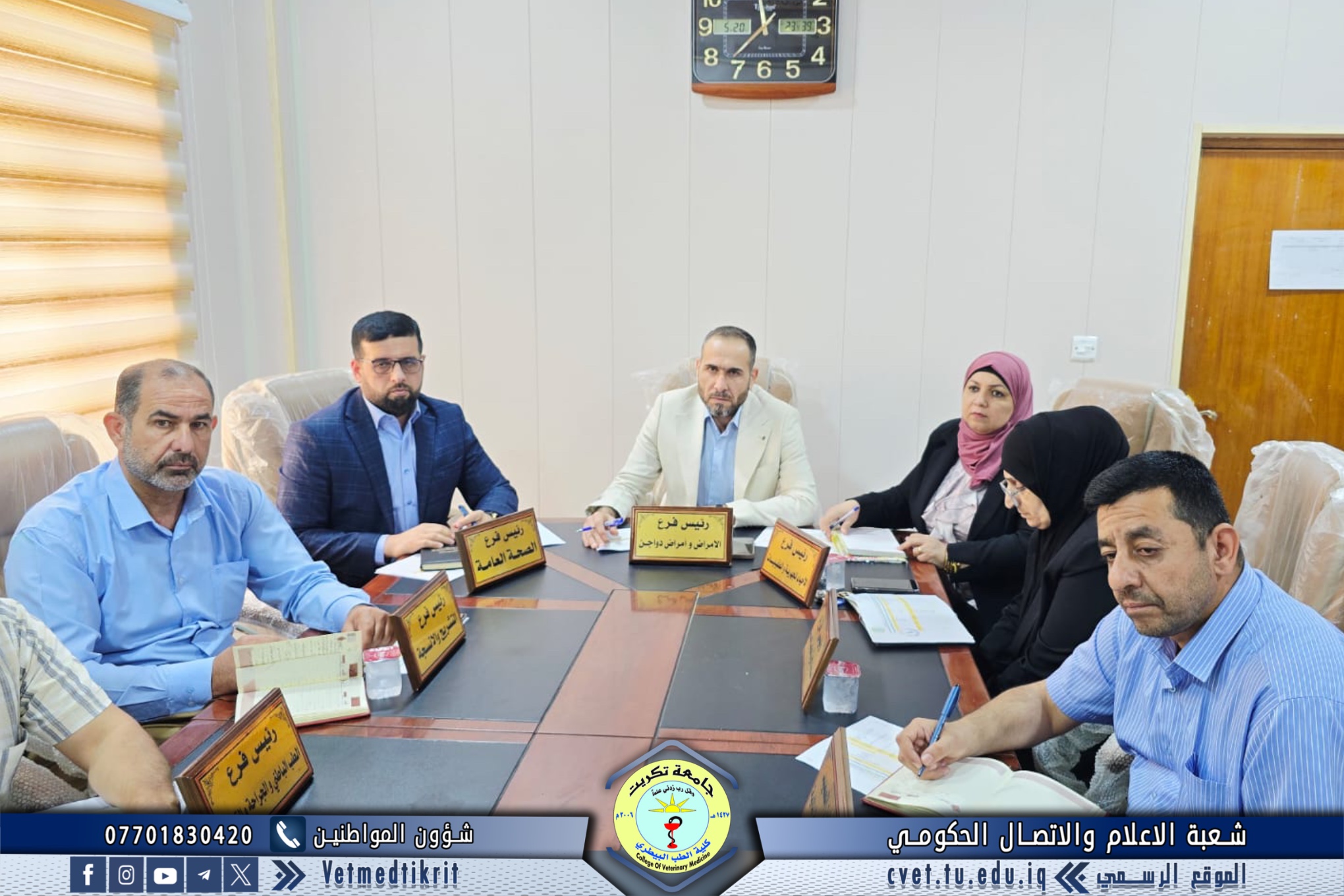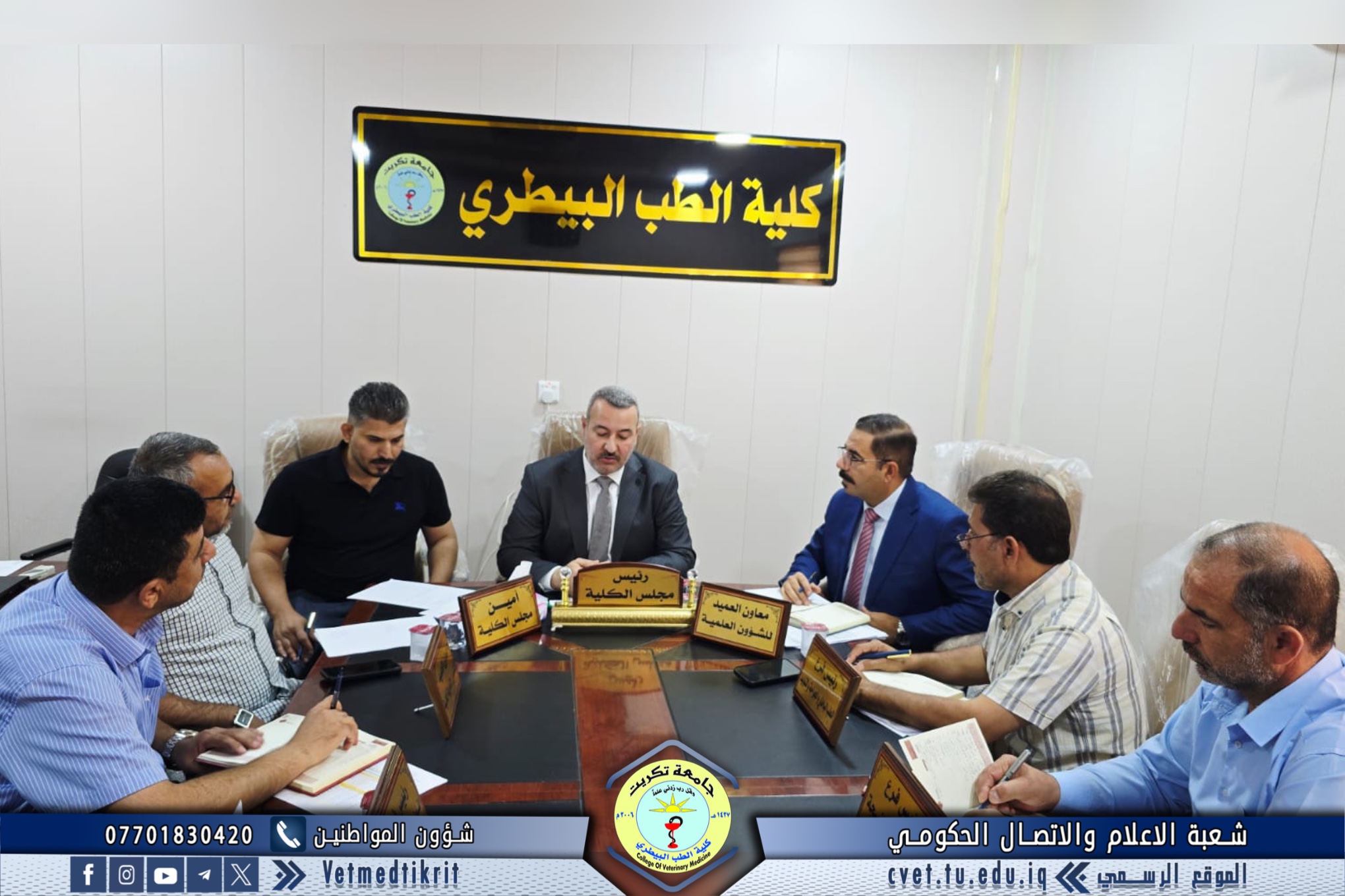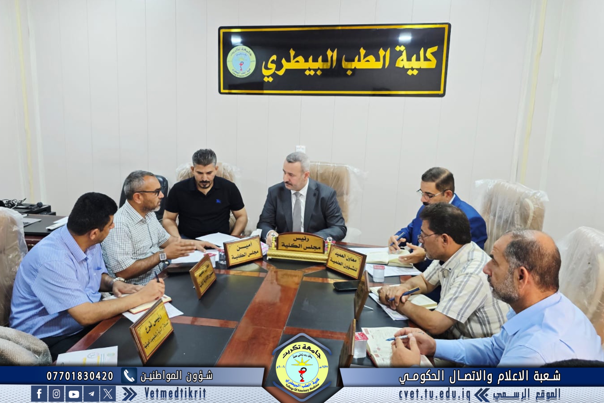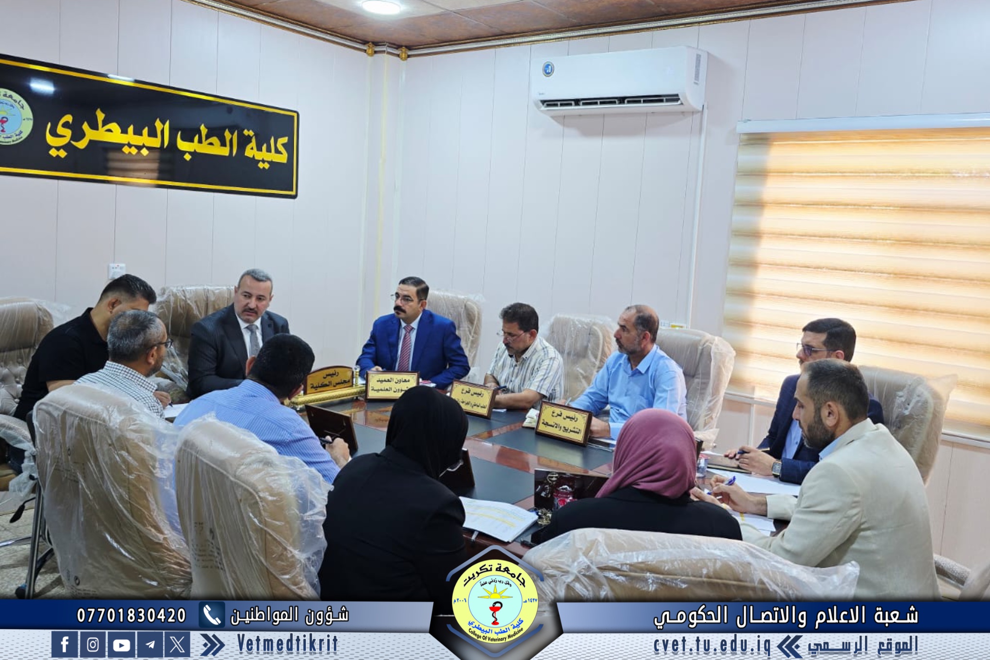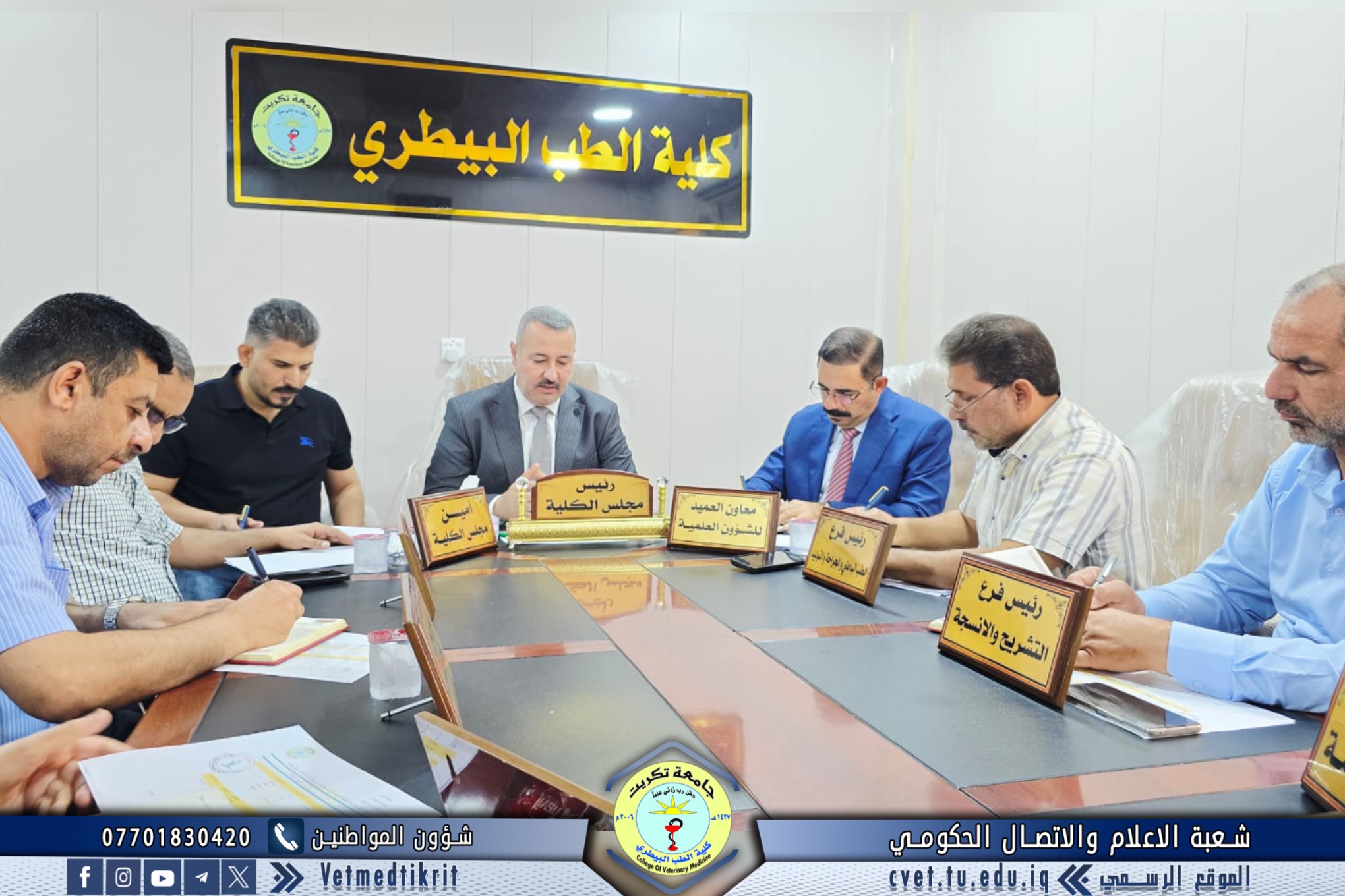 برئاسة الاستاذ الدكتور بشار صادق نومي عميد كلية الطب البيطري بجامعة تكريت، عقد مجلس الكلية جلسته الاعتيادية الثامنة ليوم الثلاثاء الموافق 20/5/2025 بحضور السادة معاوني العميد للشؤون العلمية والادارية والسيدات والسادة رؤساء الفروع العلمية والسيد امين المجلس واستضافة أ.م.د. احمد عبدالله سلطان مدير شعبة ضمان الجودة والاداء الجامعي، تم خلال الاجتماع مناقشة عدد من الامور من اهمها الاستعدادات لاستقبال اللجنة الجامعية المكلفة بتقييم مختبرات الكلية. حيث اكد رؤساء الفروع جاهزية الكلية بكافة مختبراتها لاستقبال اللجنة مؤكدين على التميز الذي وصلت اليه الكلية علميا واكاديميا مشيدين بجهود عمادة الكلية في الارتقاء الدائم بمستوى الكلية. كما تم خلال الجلسة مناقشة موضوع اعلان نتائج امتحانات نهاية الفصل الدراسي الاول للمراحل فرق الاولى، بالاضافة الى العديد من الامور التي تخص الكلية والطلبة بشكل عام.