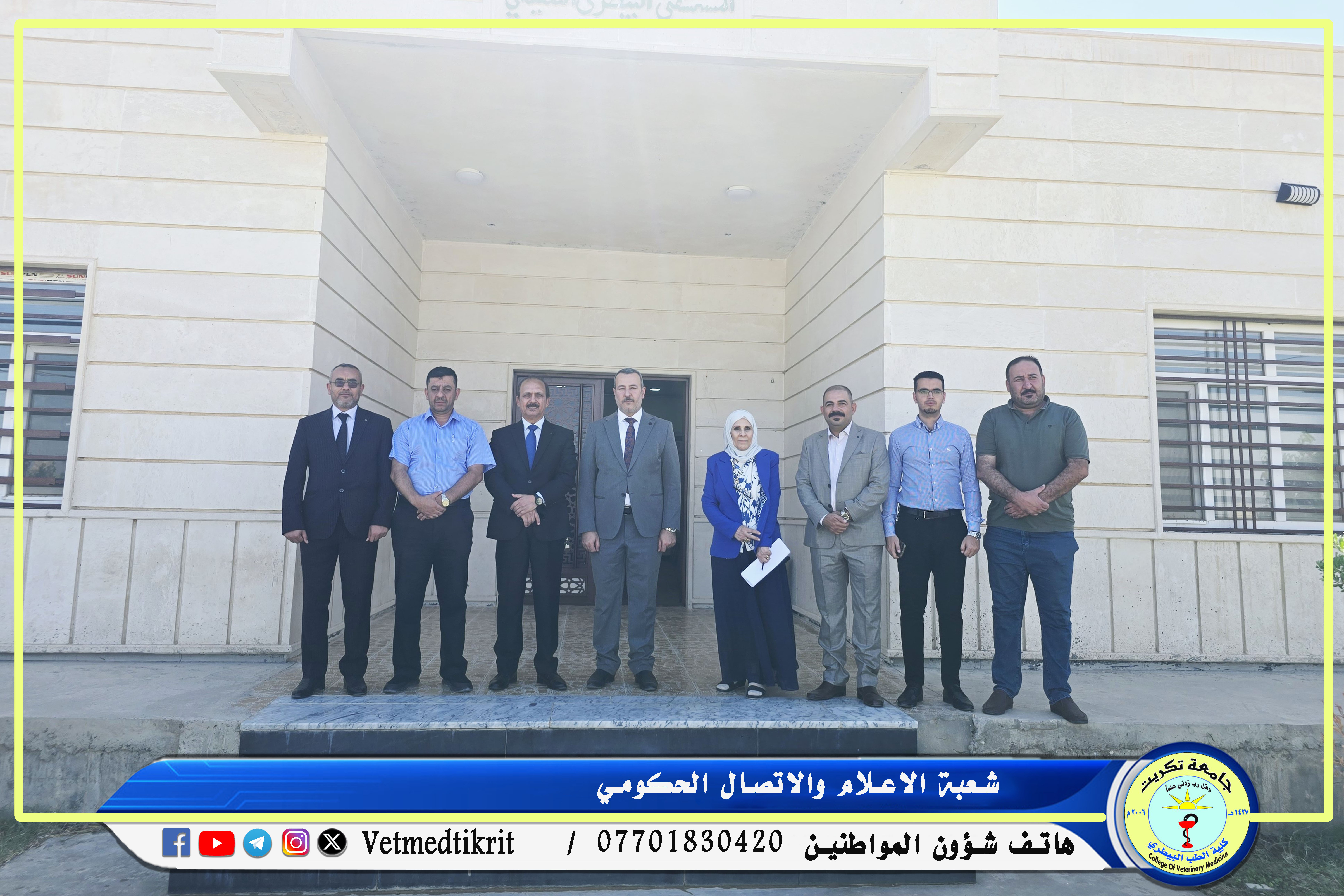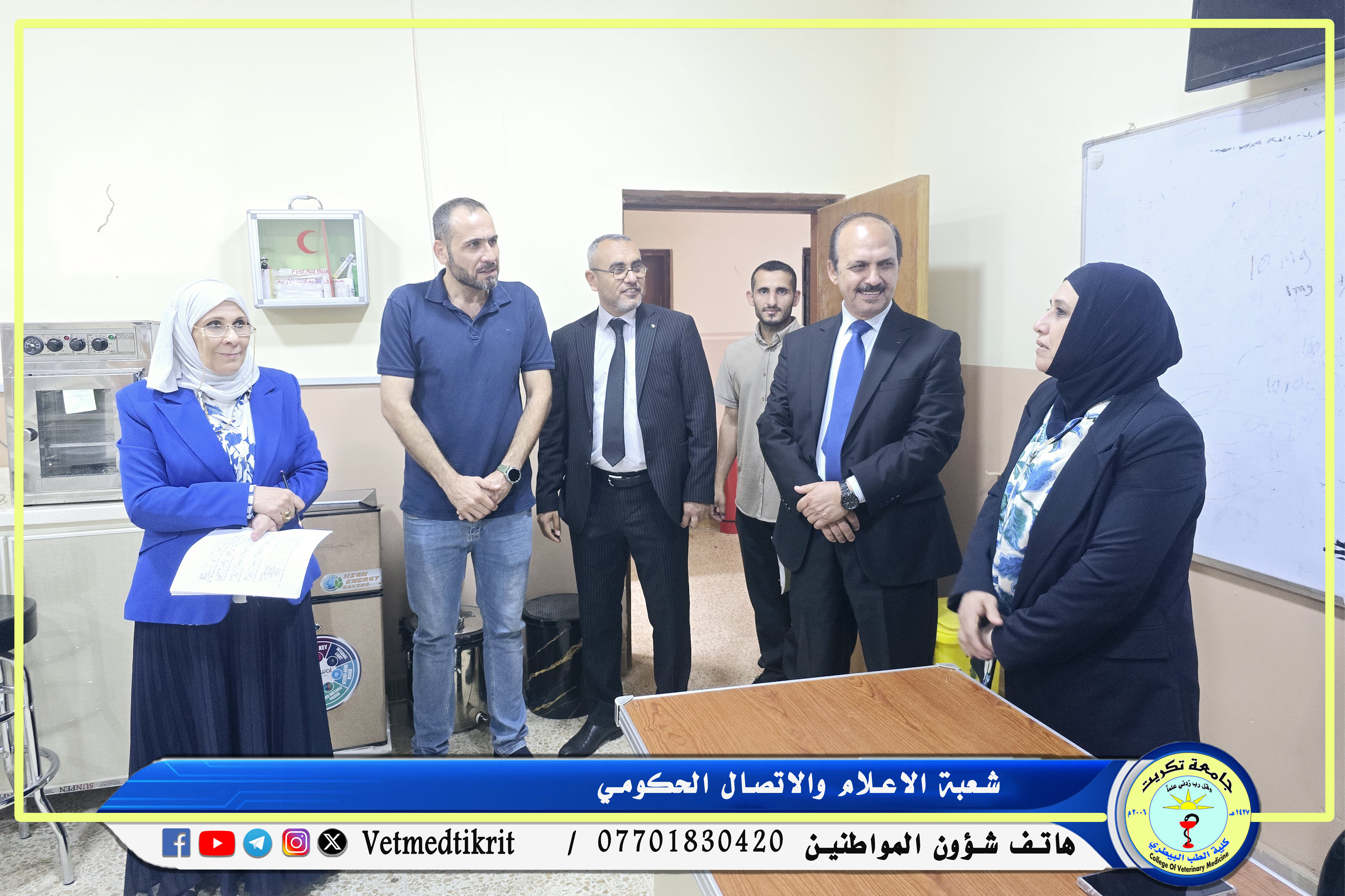 في إطار الزيارات الدورية التي تجريها وزارة التعليم العالي والبحث العلمي لتقييم واقع الكليات العراقية من الناحية الأكاديمية والبنية التحتية، استقبلت كلية الطب البيطري بجامعة تكريت اللجنة الوزارية المشكلة لمتابعة وتقييم الواقع العلمي والاكاديمي للكلية، كان في استقبال اللجنة الاستاذ الدكتور بشار صادق نومي عميد الكلية والذي رافق الوفد المؤلف من كل من: (الاستاذ الدكتورة عفاف عبدالرحمن يوسف والاستاذ الدكتور احمد حميد فتح الله) في جولته التي شملت القاعات الدراسية، المختبرات، اللجنة الامتحانية، مكتبة الكلية، البيت الحيواني، ووحدة العيادة الخارجية. حيث أكدت اللجنة أن الهدف من الزيارة هو الاطلاع وتقييم الواقع العلمي والتربوي في كلية الطب البيطري مشيرة الى حرص الوزارة على المتابعة المستمرة للمؤسسات التعليمية لضمان التميز الأكاديمي وتقديم أفضل الخدمات التعليمية للطلبة. وأشادت اللجنة بالجهود المبذولة من قبل الكلية في توفير بيئة تعليمية مناسبة تليق بالطلبة، وأكدت على أهمية الاستمرار في تطوير البنية التحتية لتحقيق مستوى عالٍ من الجودة الأكاديمية والبحثية.