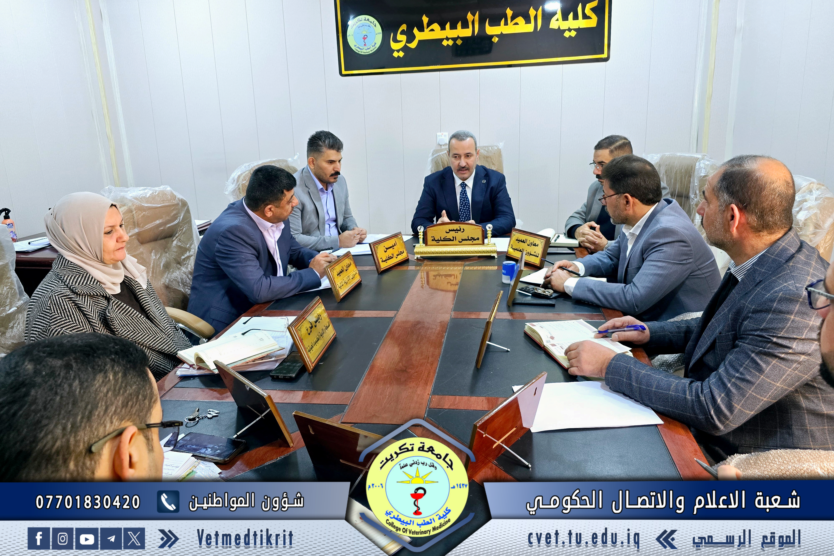 برئاسة الاستاذ الدكتور بشار صادق نومي عميد لية الطب البيطري بجامعة تكريت، عقد مجلس الكلية جلسته الاعتيادية ليوم الاثنين الموافق 24/2/2025 بحضور السادة معاوني العميد للشؤون العلمية والادارية والسيدات والسادة رؤساء الفروع العلمية والسيد امين المجلس والسيد رئيس اللجنة الامتحانية للمرحلة الاولى، تم خلال الاجتماع مناقشة عدد من الامور من اهمها الاستعدادات لاستقبال اللجنة الوزارية المكلفة بتقييم الكلية للحصول على الاعتمادية لمؤسسات التعليم البيطري. حيث اكد رؤساء الفروع جاهزية الكلية بكافة قاعاتها ومختبراتها لاستقبال اللجنة مؤكدين على التميز الذي وصلت اليه الكلية علميا واكاديميا مما يؤهلها لنيل الاعتمادية مشيدين بجهود عمادة الكلية في الارتقاء الدائم بمستوى الكلية. كما تم خلال الجلسة مناقشة موضوع امتحانات نهاية الفصل الدراسي الاول للمرحلة الاولى بالاضافة الى العديد من الامور التي تخص الكلية والطلبة بشكل عام.