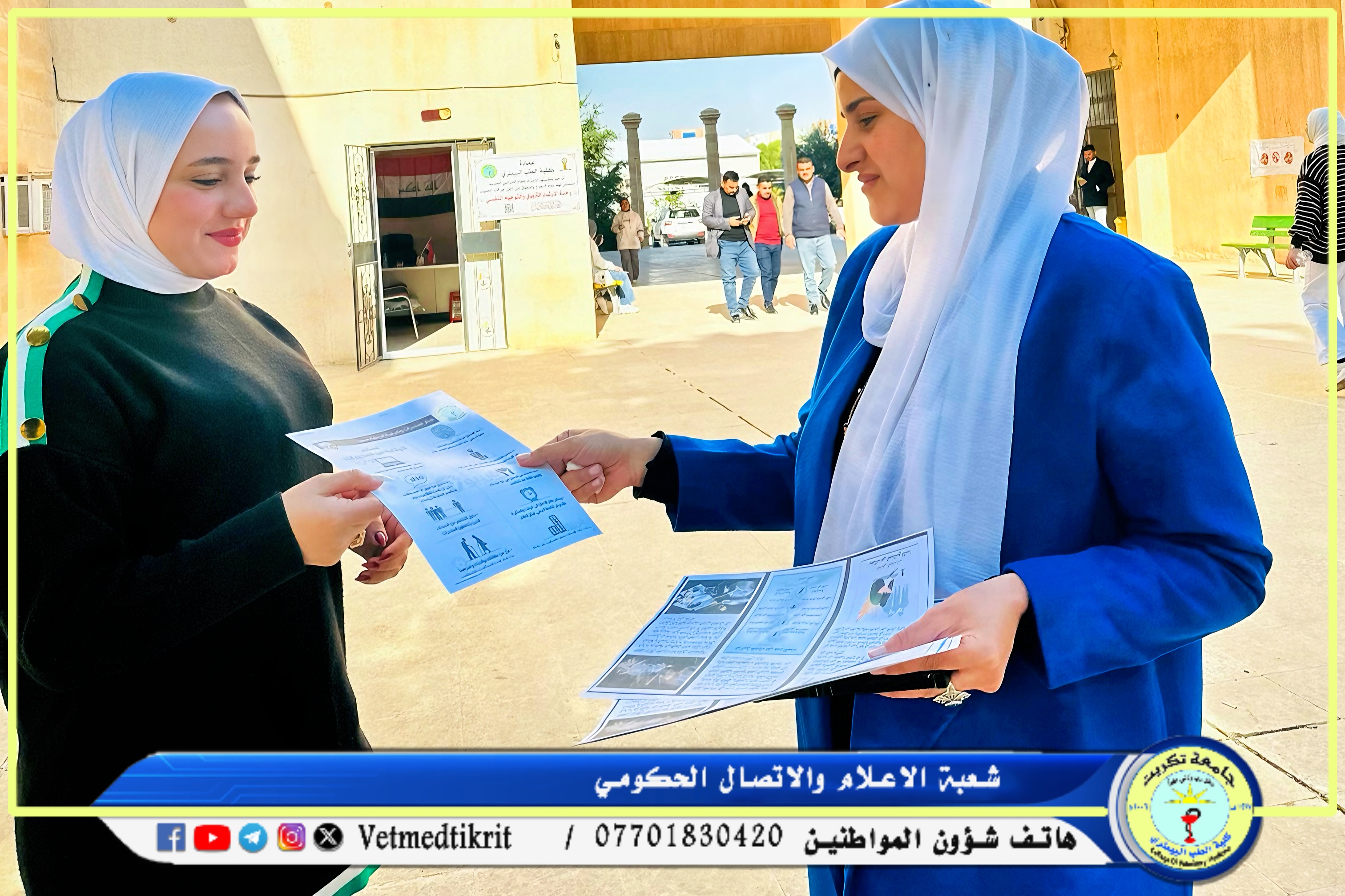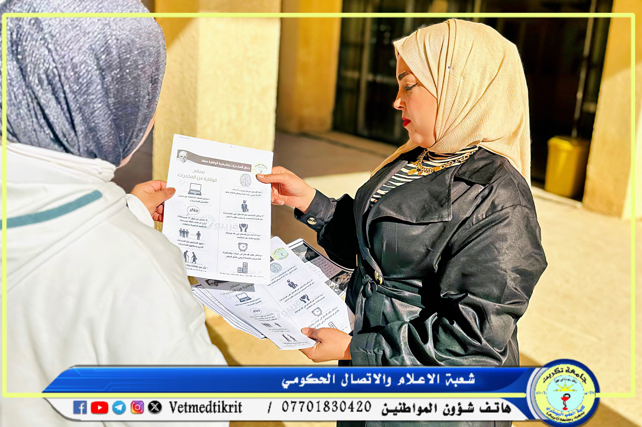 نفذت شعبة الإرشاد النفسي والتوجيه التربوي بالتعاون مع شعبة الإعلام والاتصال الحكومي في كلية الطب البيطري بجامعة تكريت حملة توعوية شاملة حول مخاطر المخدرات. هدفت الحملة الى نشر الوعي بين طلاب كلية الطب البيطري حول خطورة المخدرات، التعريف بالآثار الصحية والنفسية والاجتماعية للمخدرات وتقديم إرشادات وقائية للطلاب. حيث تم تشكيل فريق عمل مشترك من شعبتي الإرشاد النفسي والإعلام لإعداد محتوى علمي دقيق للبروشرات، تصميم بروشرات جذابة وملونة وطباعة البروشرات بجودة عالية. احتوت البروشورات على عدة نقاط اهمها التعريف العلمي بأنواع المخدرات، الآثار الصحية التفصيلية للمخدرات، التأثيرات النفسية والاجتماعية، طرق الوقاية والعلاج، شهادات وقصص واقعية و أرقام التواصل مع الجهات المختصة. تم توزيع البروشرات في القاعات الدراسية ونشرها في لوحات الإعلانات بالكلية وتوزيعها بشكل مباشر على الطلاب خلال فعاليات الكلية والنشر الإلكتروني عبر منصات التواصل الجامعية مما نتج عنه زيادة الوعي لدى الطلاب، نشر ثقافة الوقاية من المخدرات وتعزيز دور الجامعة في المسؤولية المجتمعية.​