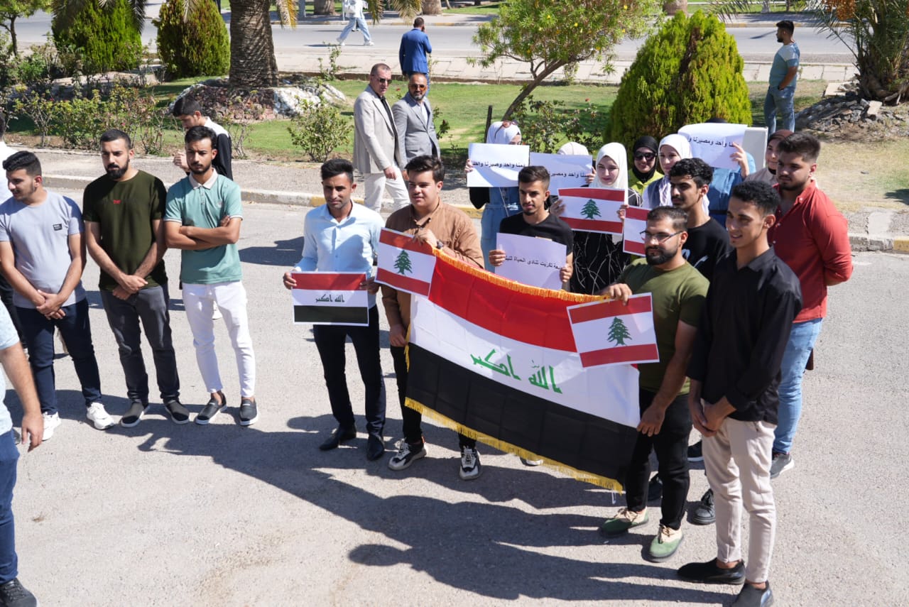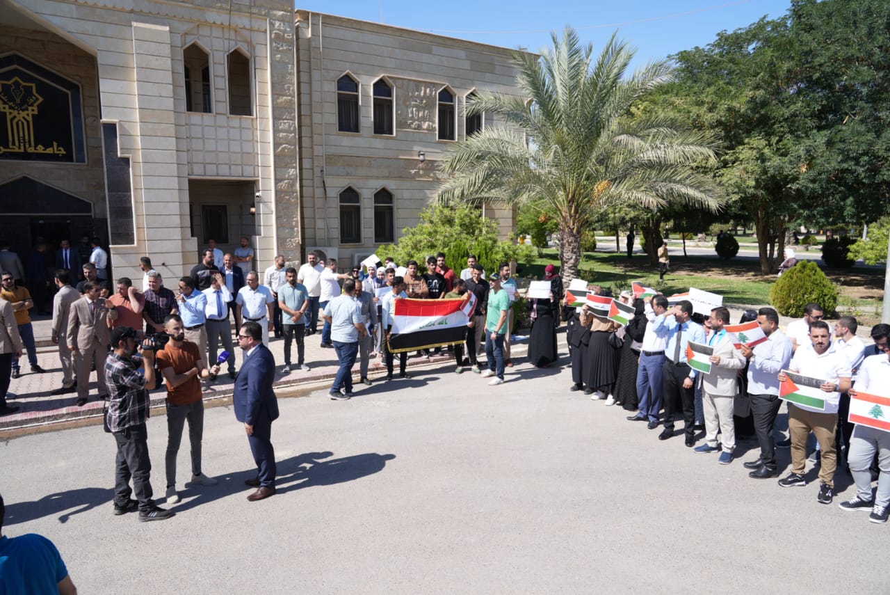 تنفيذا لتوجيهات وزارة التعليم العالي والبحث العلمي وبحضور الاستاذ الدكتور وعد محمود رؤوف رئيس جامعة تكريت نظمت جامعة تكريت وقفة استنكارية واحتجاجية ضد العدوان الهمجي الذي يتعرض له الشعبين الفلسطيني واللبناني الشقيقيين على يد قوى الاحتلال والظلام. شارك في الوقفة الاستاذ الدكتور بشار صادق نومي عميد كلية الطب البيطري بالاضافة الى عدد من طلبة ومنتسبي الكلية. وشهدت الوقفة حمل الاعلام العراقية والعلمين الفلسطيني واللبناني وشعارات التنديد والاستنكار لجرائم العدو الذي زاد في طغيانه وهمجيته وتجاهله لكافة الاعراف والمواثيق الدولية والانسانية واقترافه الجرائم ضد العرب والمسلمين، هذا ودان الحاضرون الانتهاكات الكبيرة لحقوق الإنسان التي يتعرض لها الشعبين الشقيقين كما وتمت الدعوة الى ضرورة وقوف المجتمع الدولي والمنظمات الحقوقية في العالم لاخذ دورها لصد مثل هذه الاعتداءات الغاشمة.