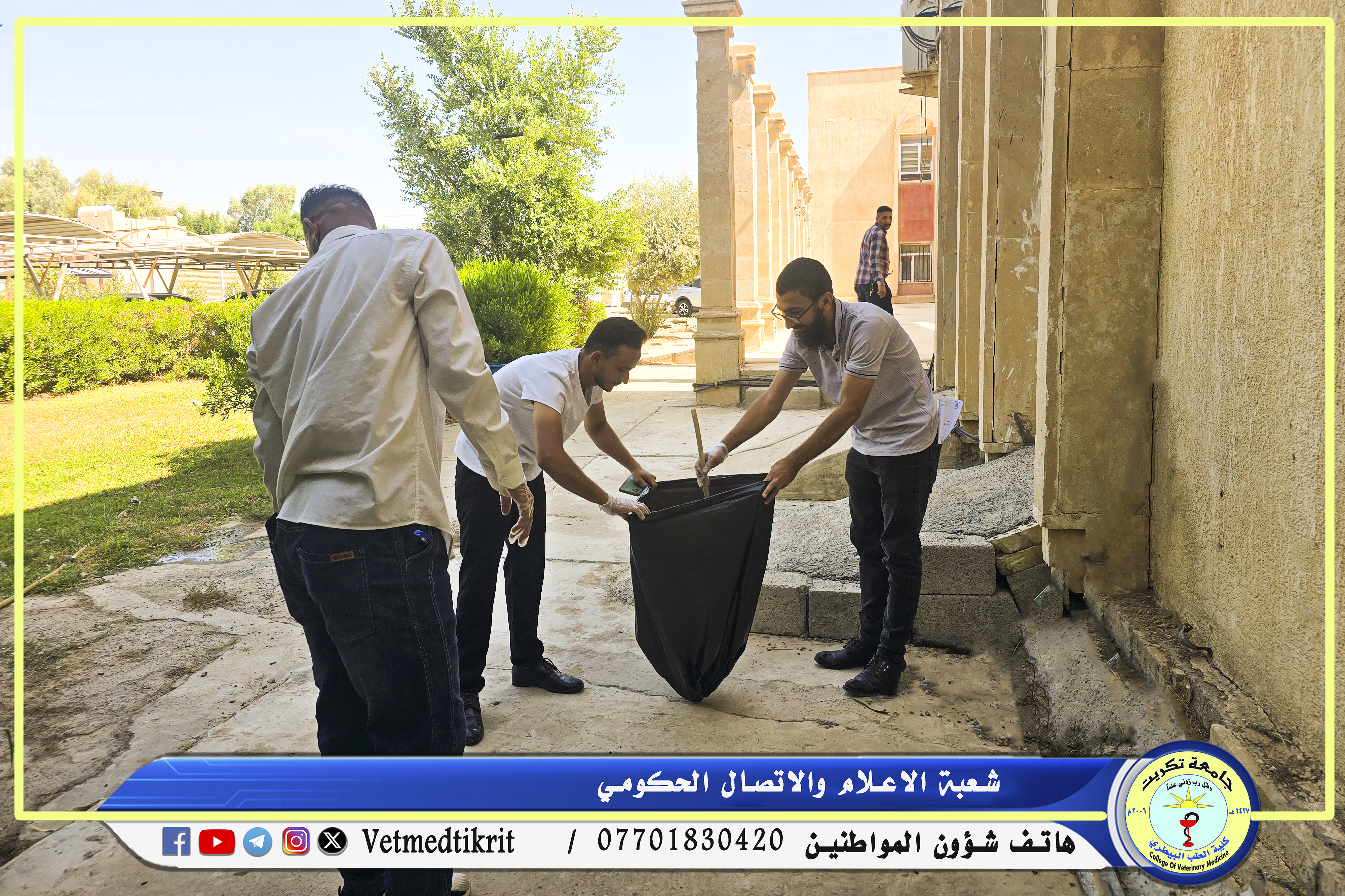 برعاية رئيس جامعة تكريت الاستاذ الدكتور وعد محمود رؤوف رئيس جامعة تكريت المحترم وبإشراف الاستاذ الدكتور بشار صادق نومي عميد كلية الطب البيطري ومن أجل تعزيز روح النشاط التطوعي وغرس القيم التعاونية بين الطلبة وضمن مفردات المنهاج السنوي للفصل الدراسي الاول نظمت شعبة النشاطات الطلابية في الكلية وبالتعاون مع قسم النشاطات الطلابية التابع لرئاسة الجامعة وقسم شؤون الديوان حملة تطوعية للحفاظ على البيئة من خلال حملة تنظيف واسعة شملت أروقة الجامعة فضلا عن مبنى رئاسة الجامعة. وأوضحت الدكتورة ابتسام حيدر مسؤولة قسم النشاطات الطلابية في الجامعة أن الحملة تمت بمشاركة شعب النشاطات الطلابية في كليات الجامعة من اجل بيئة جامعية نظيفة، حيث عبر المشاركون عن استعدادهم الكامل لإقامة مثل هذه النشاطات التي تهدف إلى الحفاظ على البيئة بشكل عام وعلى نظافة الجامعة بشكل خاص، وتعكس صورة ناصعة عن اخلاقيات والتزام الطلبة في الحفاظ على بيئتهم الجامعية.
