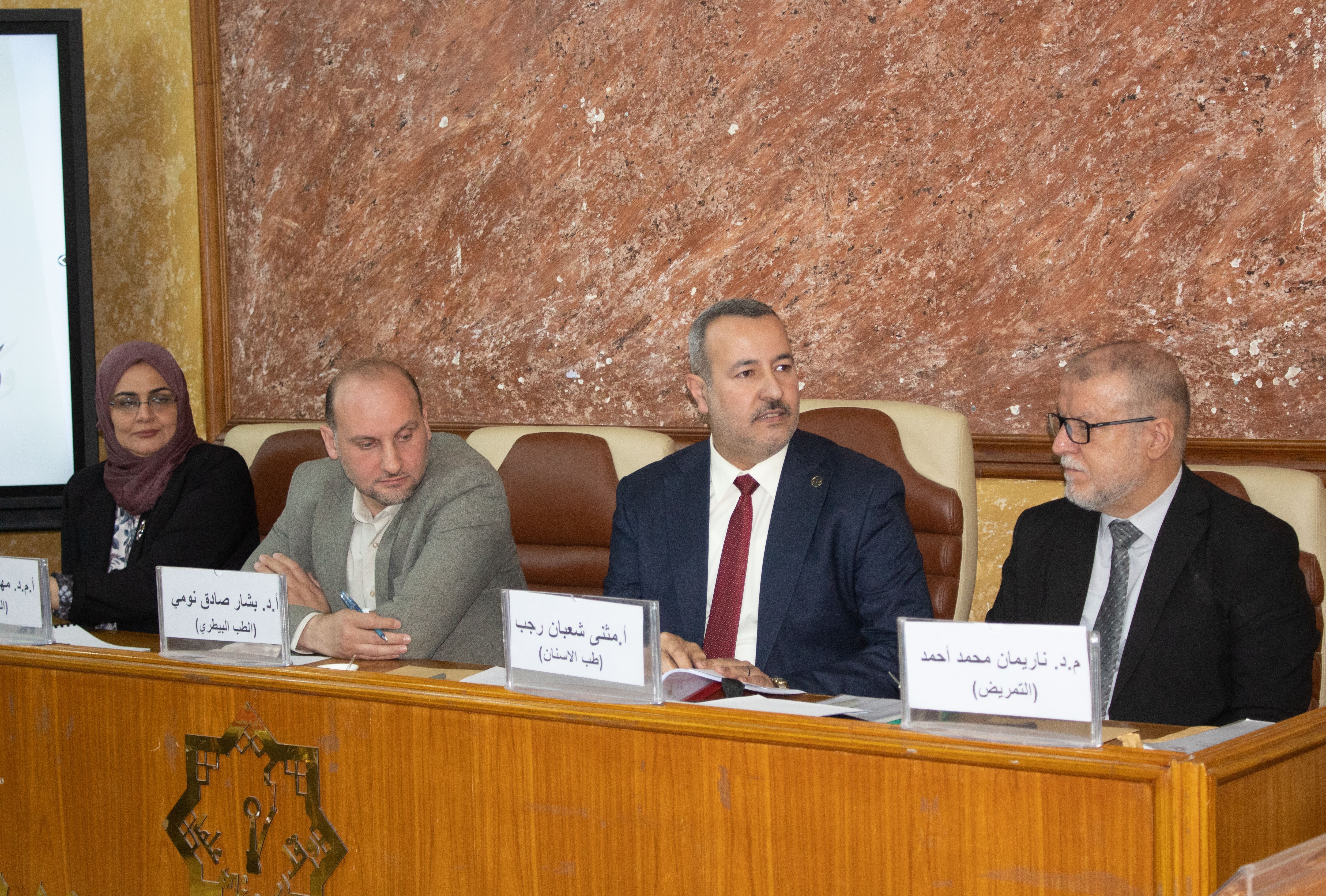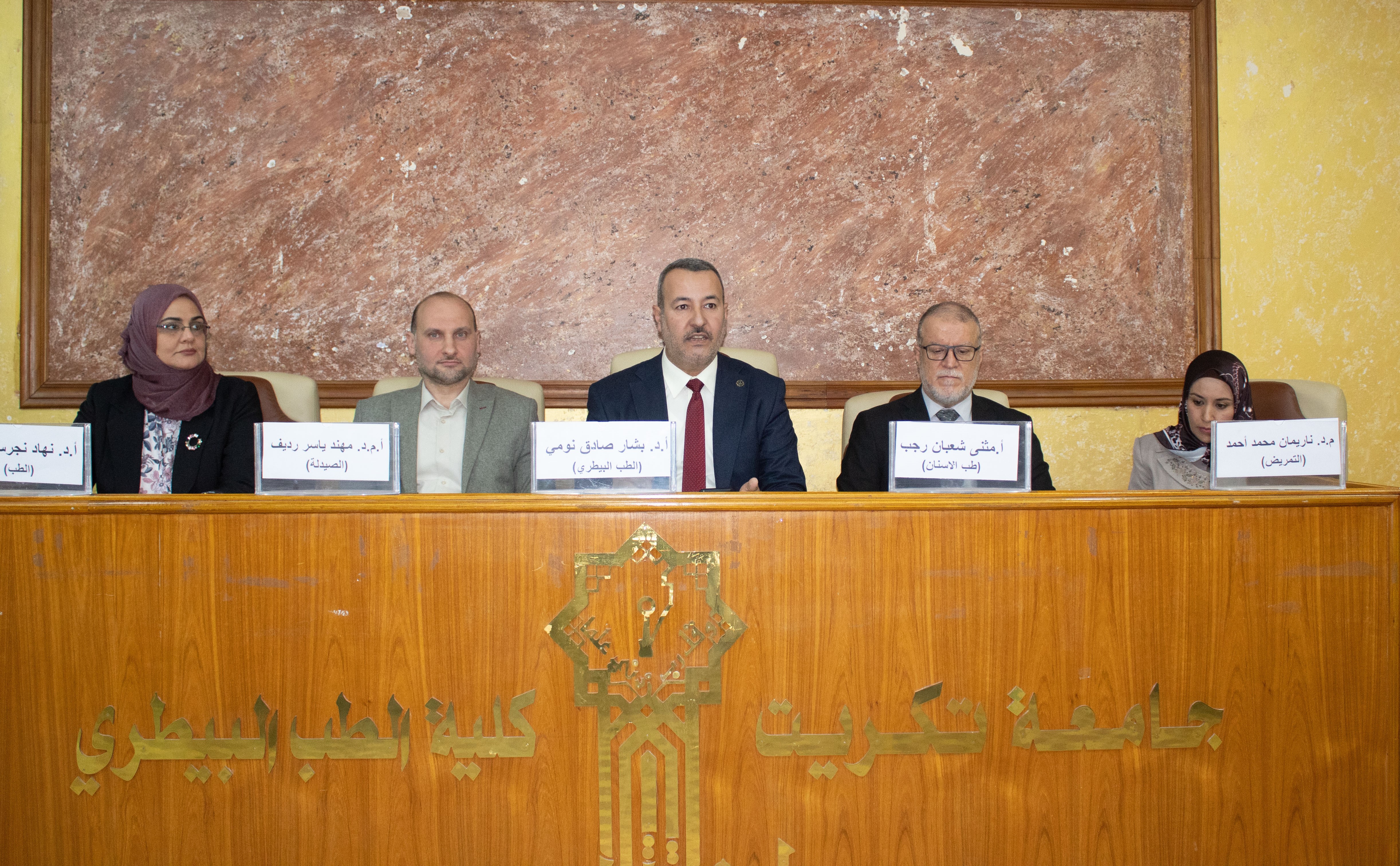 بحضور الاستاذ الدكتور وعد محمود رؤوف رئيس جامعة تكريت والاستاذ الدكتور حسن حسين ابراهيم مساعد رئيس الجامعة للشؤون العلمية استضافت كلية الطب البيطري مؤتمر بحوث التخرج لكليات المجموعة الطبية والذي يناقش بحوث التخرج الفائزة بالمرتبة الاولى في كليات (الطب، طب الاسنان، الصيدلة، التمريض، والطب البيطري) من قبل لجنة المناقشة المؤلفة من كل من: