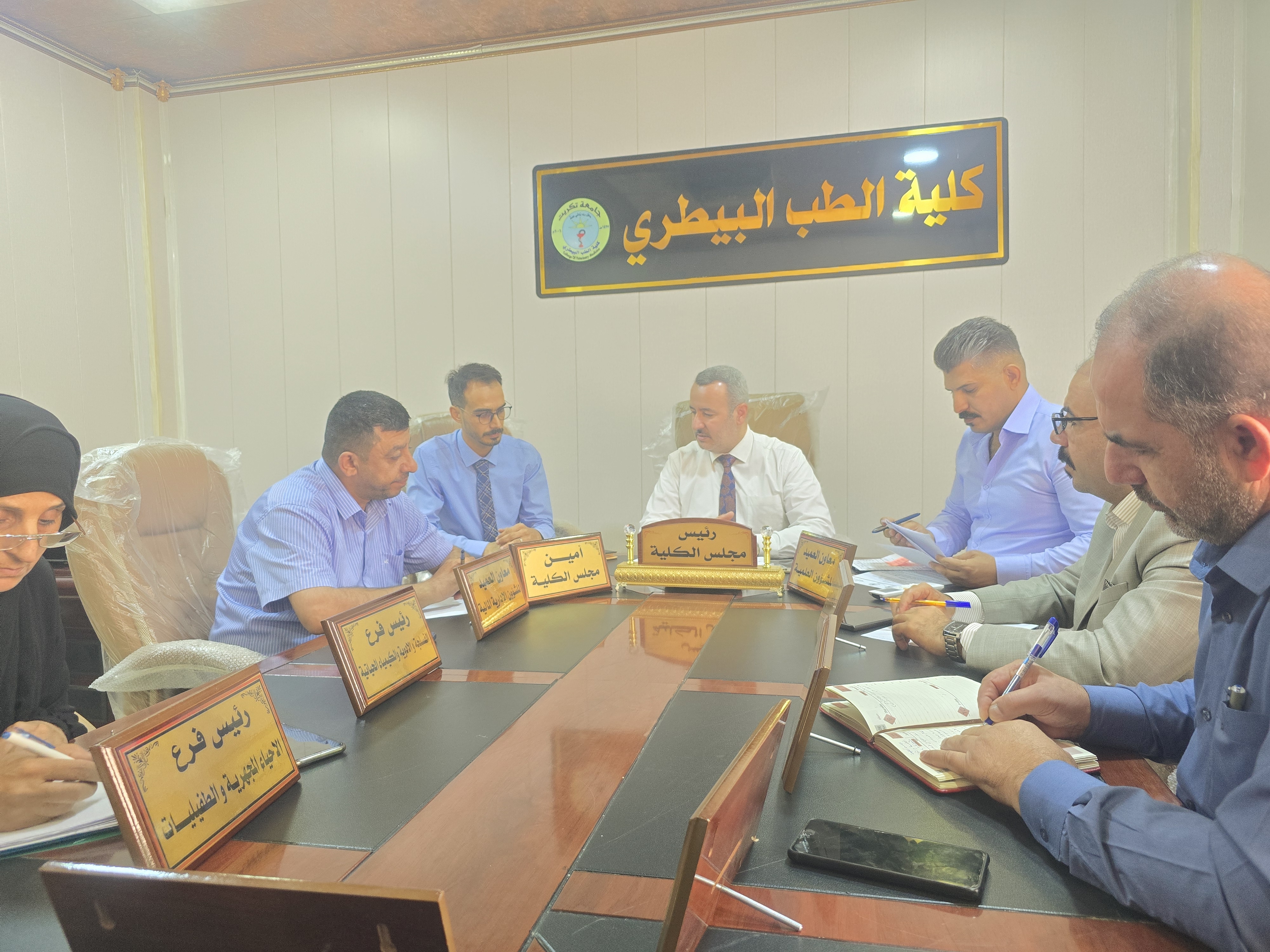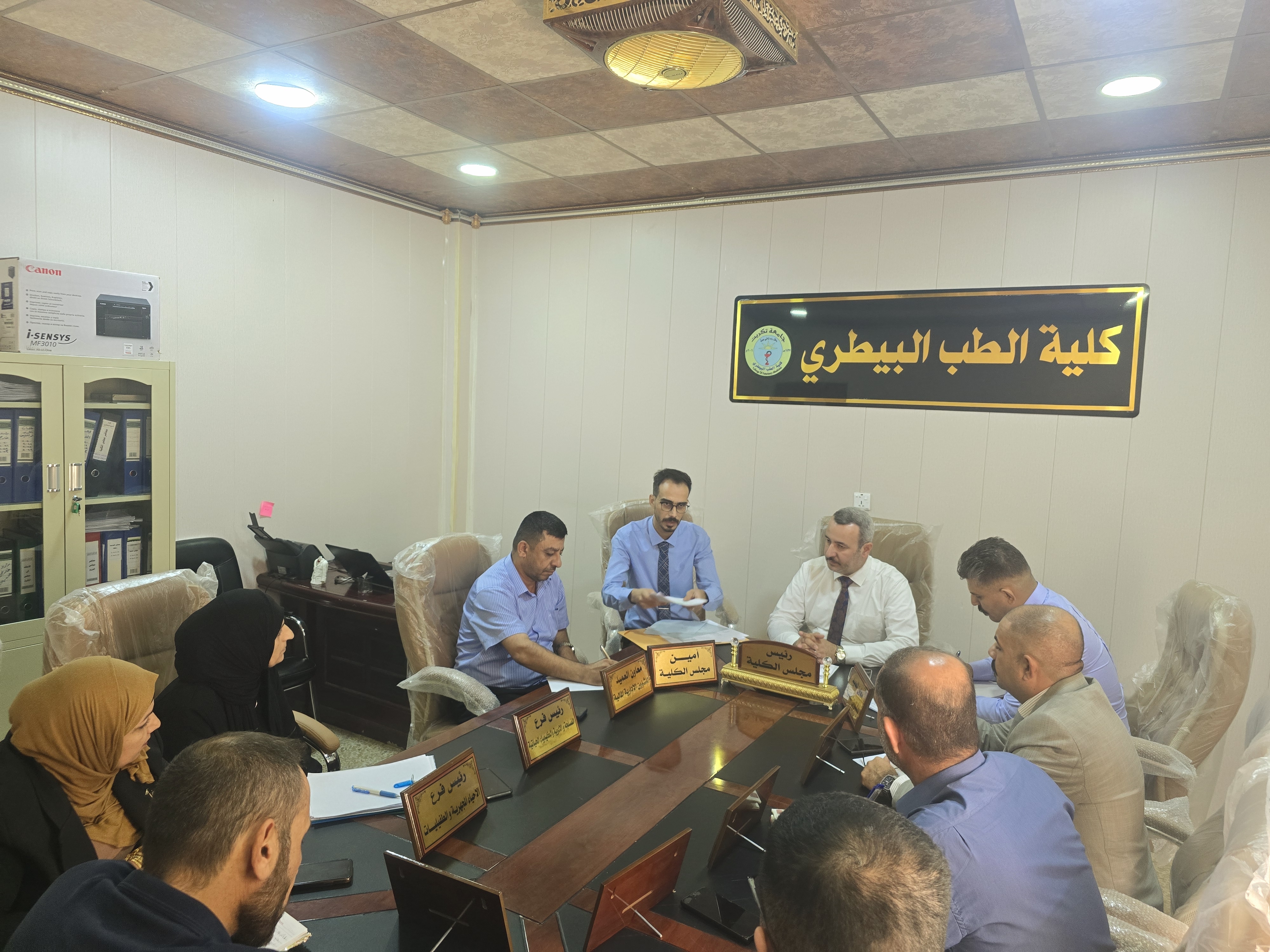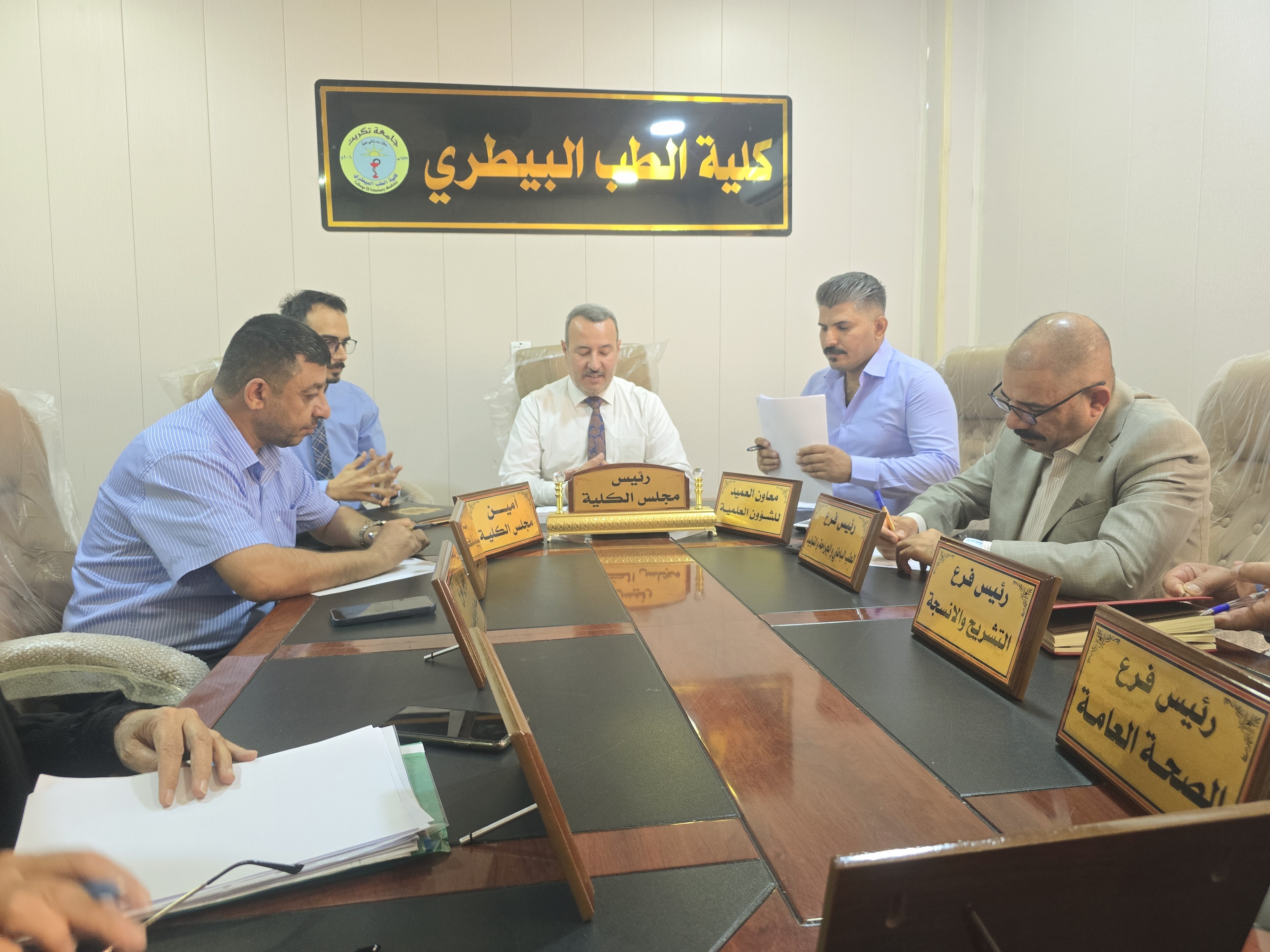 بحضور الاستاذ الدكتور بشار صادق نومي عميد كلية الطب البيطري بجامعة تكريت عقد مجلس الكلية جلسته الاعتيادية الثانية بحضور السيدات والسادة رؤساء الفروع العلمية في الكلية، حيث ناقش اعضاء المجلس خلال الجلسة عددا من المواضيع والنقاط المدرجة على جدول اعماله واتخذ القرارات اللازمة بشأنها.