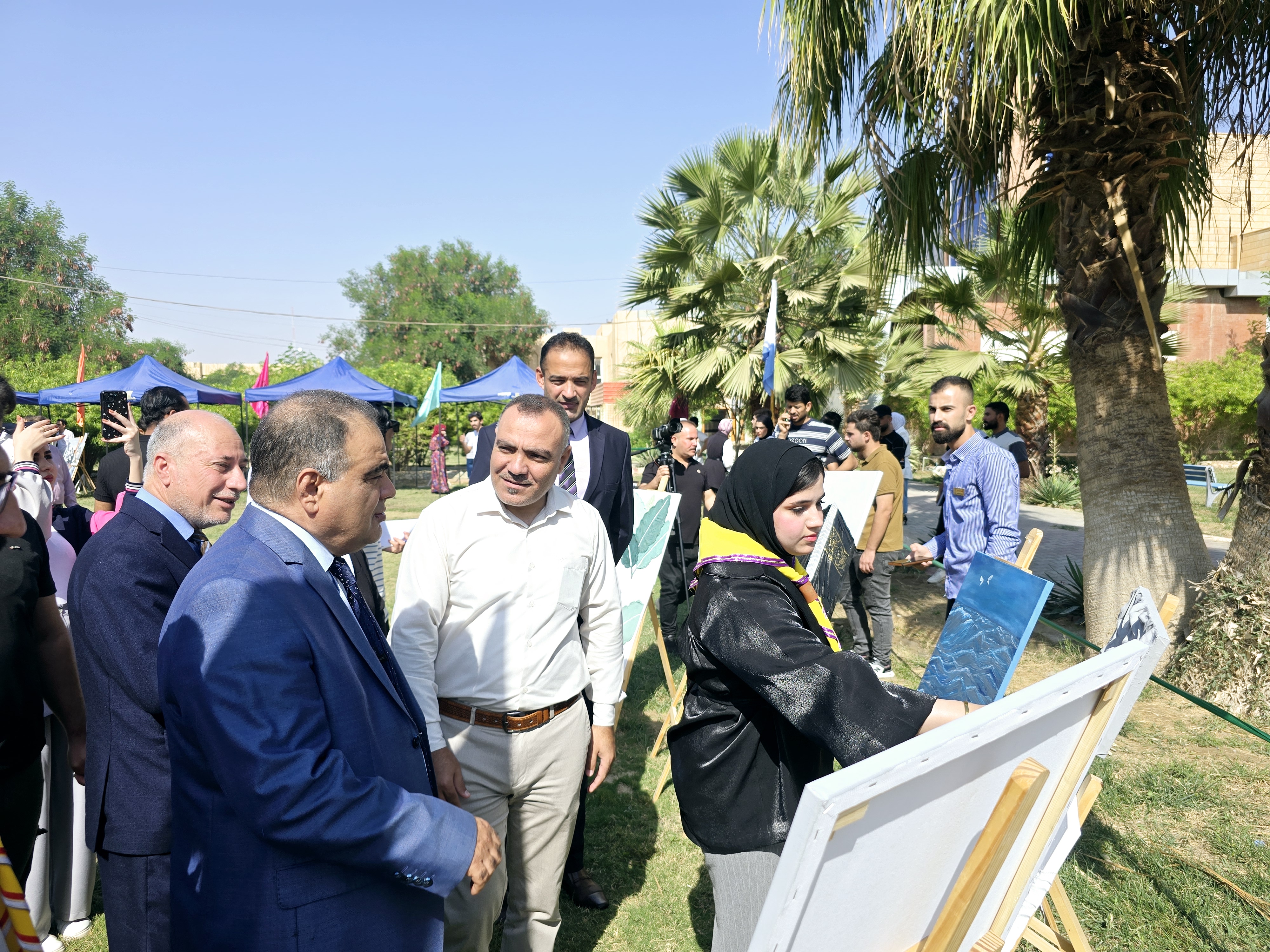 حيث شارك في المعرض طالبتان من كليتنا هما فاطمة ثائر تركي من المرحلة الثانية وفاطمة رائد محمد من المرحلة الثالثة، تضمن المهرجان عرض للأعمال واللوحات الفنية للطالبتين المشاركتين بالاضافة الى مساهمتهما في المرسم الحر الذي شارك فيه طالب وطالبة من كل كلية مشاركة، وفي الختام تم توزيع دروع وشهادات تقديرية على الطلبة المشاركين تثمينا لابداعاتهم.