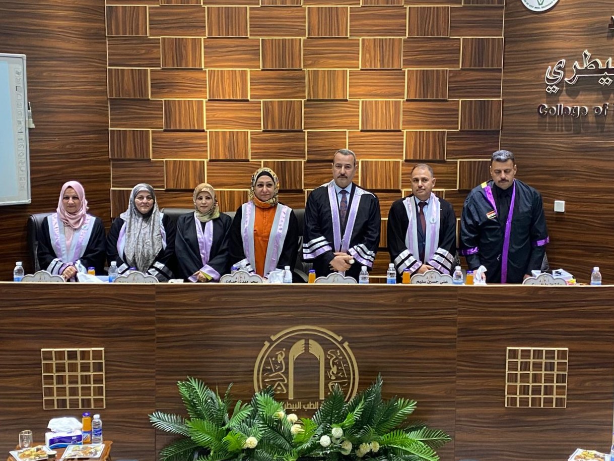 ترأس الاستاذ الدكتور بشار صادق نومي عميد كلية الطب البيطري بجامعة تكريت لجنة مناقشة اطروحة الدكتوراه الموسومة (Isolation and Molecular Identification of Vibro spp. from Birds and Human with Evaluating the Antibacterial Activity of Silver Nano-Particles from Fenugreek) للطالبة (ميسون صباح عباس) في تخصص (الاحياء المجهرية)، وذلك في المناقشة التي اقيمت على قاعة كلية الطب البيطري بجامعة بغداد بتاريخ 11/8/2024 .