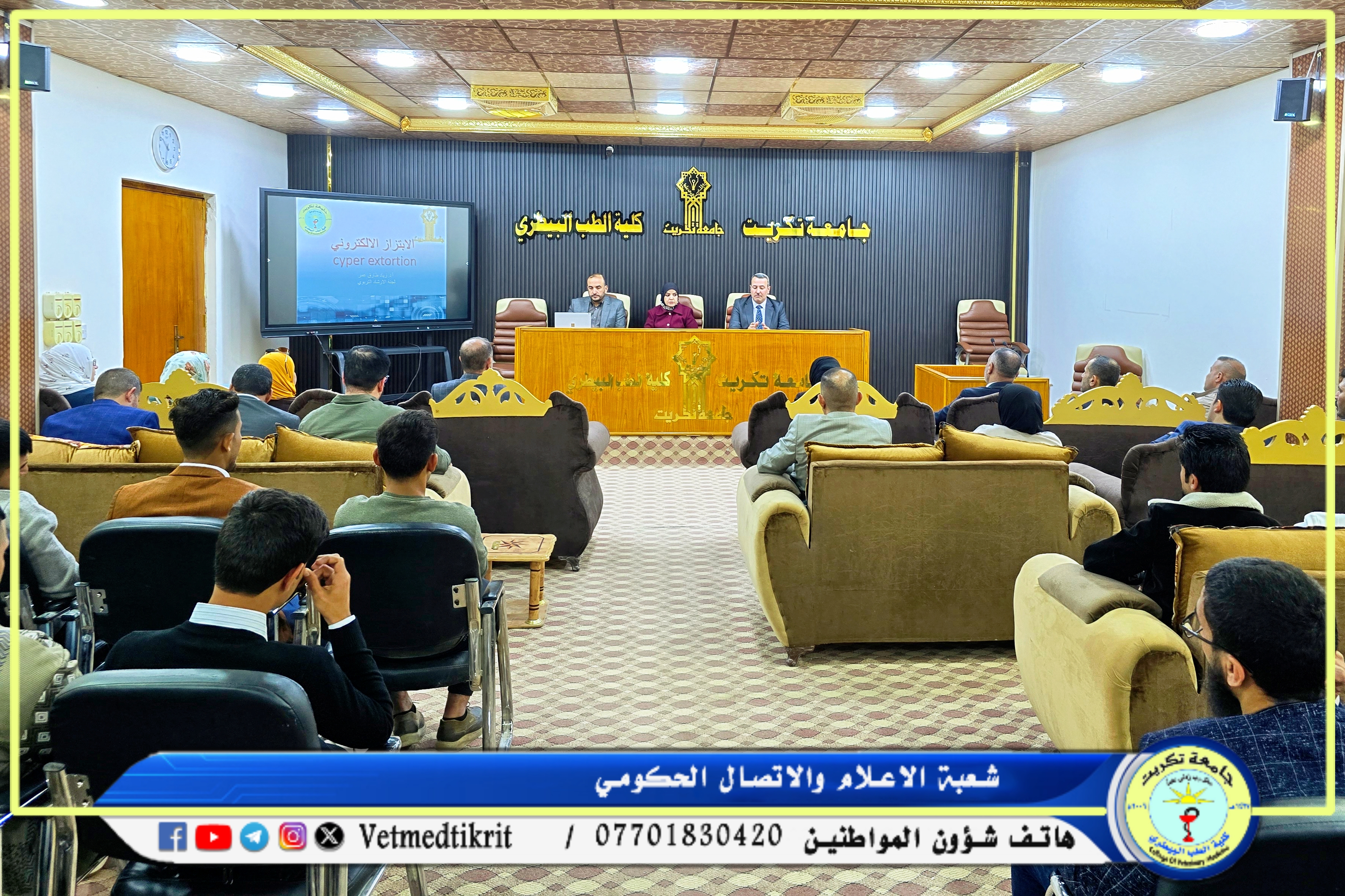 زار السيد رئيس جامعة تكريت كلية الطب البيطري، حيث شارك في فعاليات أسبوع الإرشاد التربوي الذي نظمته الكلية. وخلال الزيارة، حضر سيادته ندوة توعوية تناولت موضوع **"الابتزاز الإلكتروني"**، والتي هدفت إلى نشر الوعي بمخاطر هذه الظاهرة وسبل الوقاية منها.