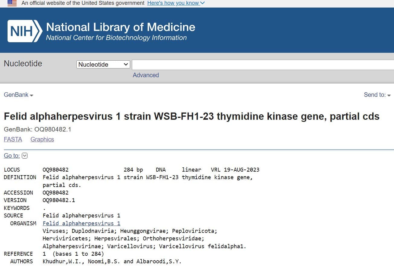 تمكن كل من الاستاذ الدكتور بشار صادق نومي والاستاذة هبة يونس خلف من تسجيل عزلات فيروسية وفطرية في بنك الجينات العالمي ولاول مرة في العراق. حيث تمكن الفريق البحثي المؤلف من كل من الاستاذ الدكتور بشار صادق نومي والاستاذ الدكتور صفوان يوسف البارودي من كلية الطب البيطري بجامعة الموصل وطالب الماجستير وليد اسماعيل خضر من تسجيل عزلتين للفيروس Feline Herpes Virus-1 في بنك الجينات العالمي تحت المسميات: OQ980483 و OQ980482.