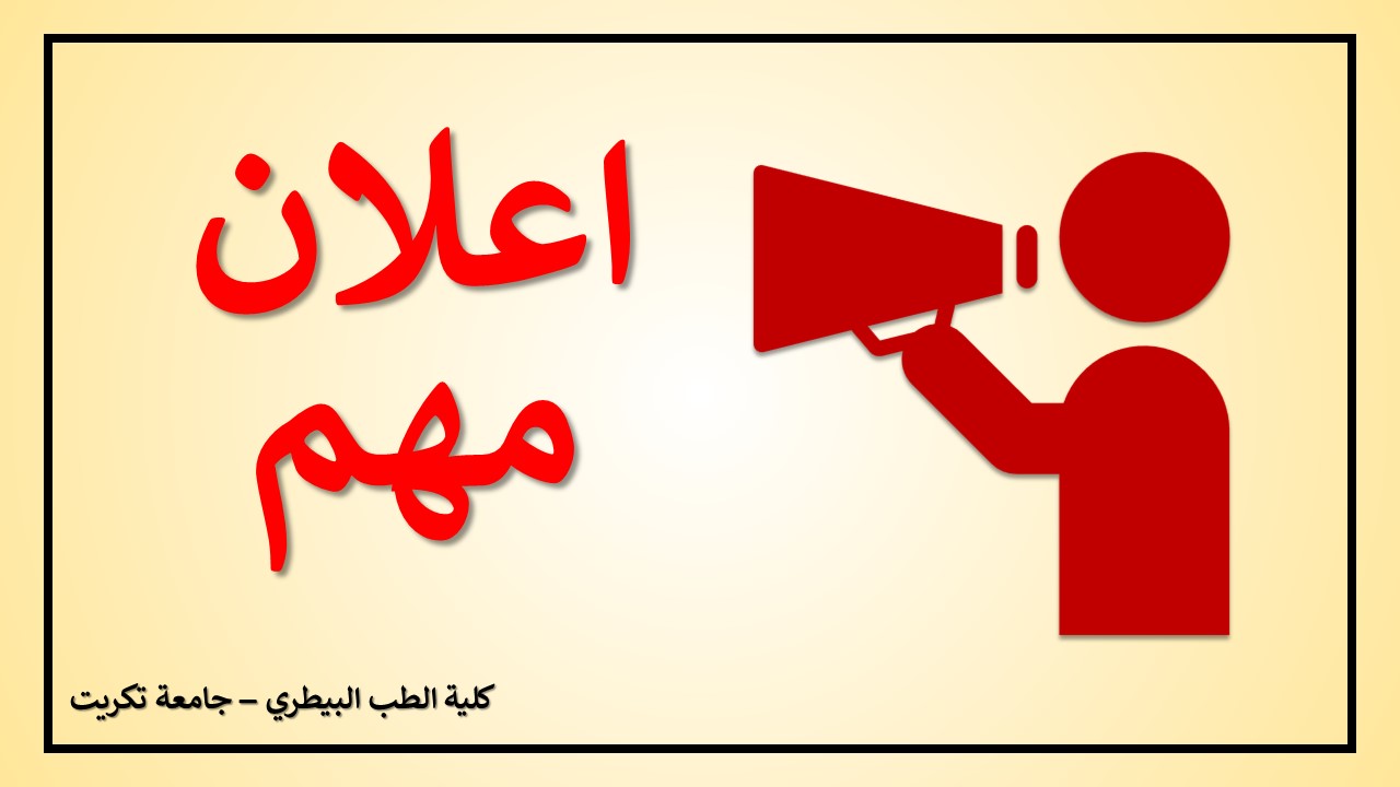 الى المتقدمين لدراسة الماجستير في كلية الطب البيطري بجامعة تكريت، سيكون موعد الامتحان التنافسي يوم الاثنين 2025-6-30 في تمام الساعة التاسعة صباحا على قاعة المرحوم د. مهند ماهر في كلية الطب البيطري. تمنياتنا بالتوفيق للجميع؟