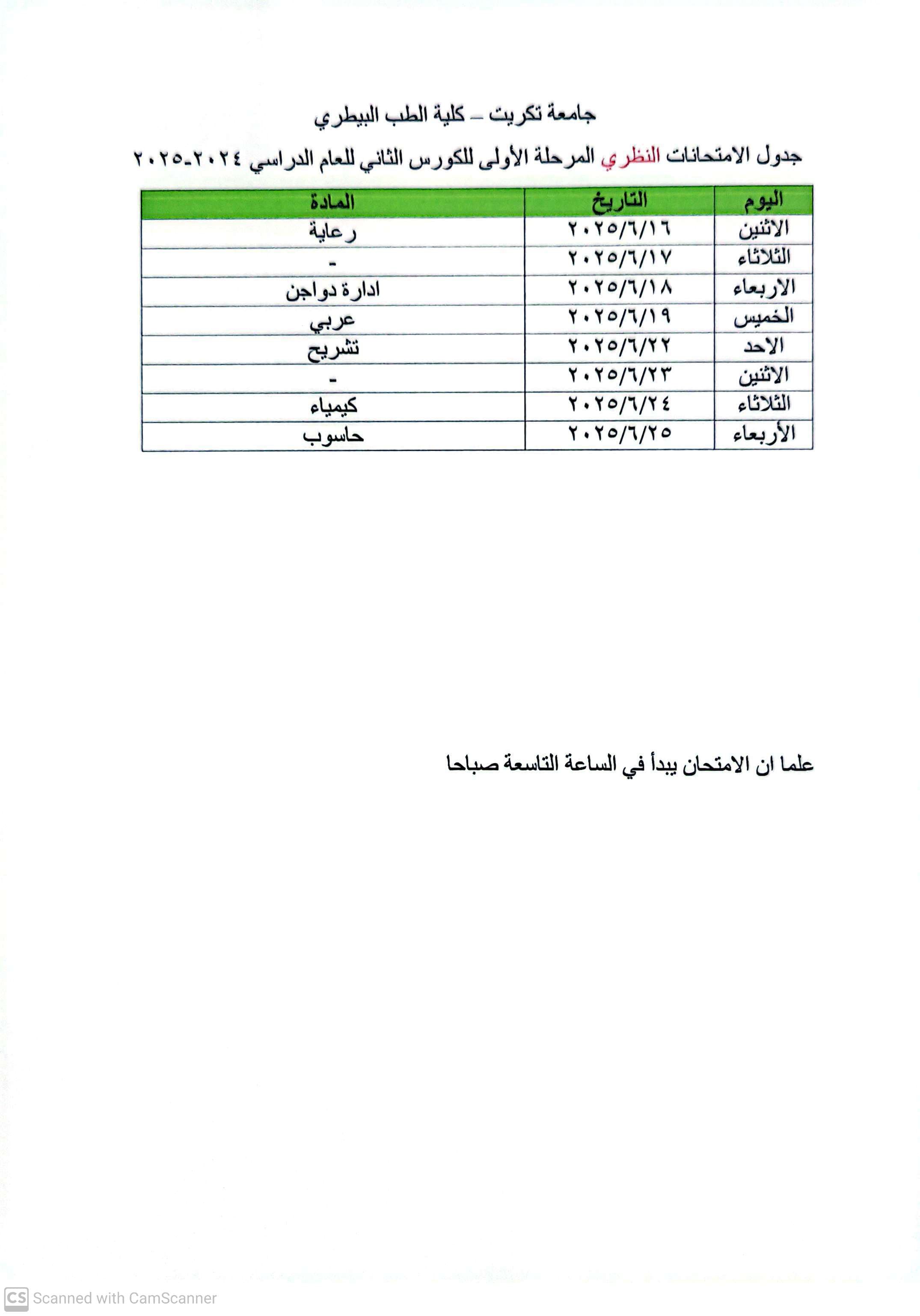 اعلنت اللجنة الامتحانية للمرحلة الاولى في كلية الطب البيطري بجامعة تكريت عن موعد الامتحانات النهائية للمرحلة الاولى/الجزء النظري/الفصل الثاني للعام الدراسي (2024-2025) وكما مبين في ادناه: