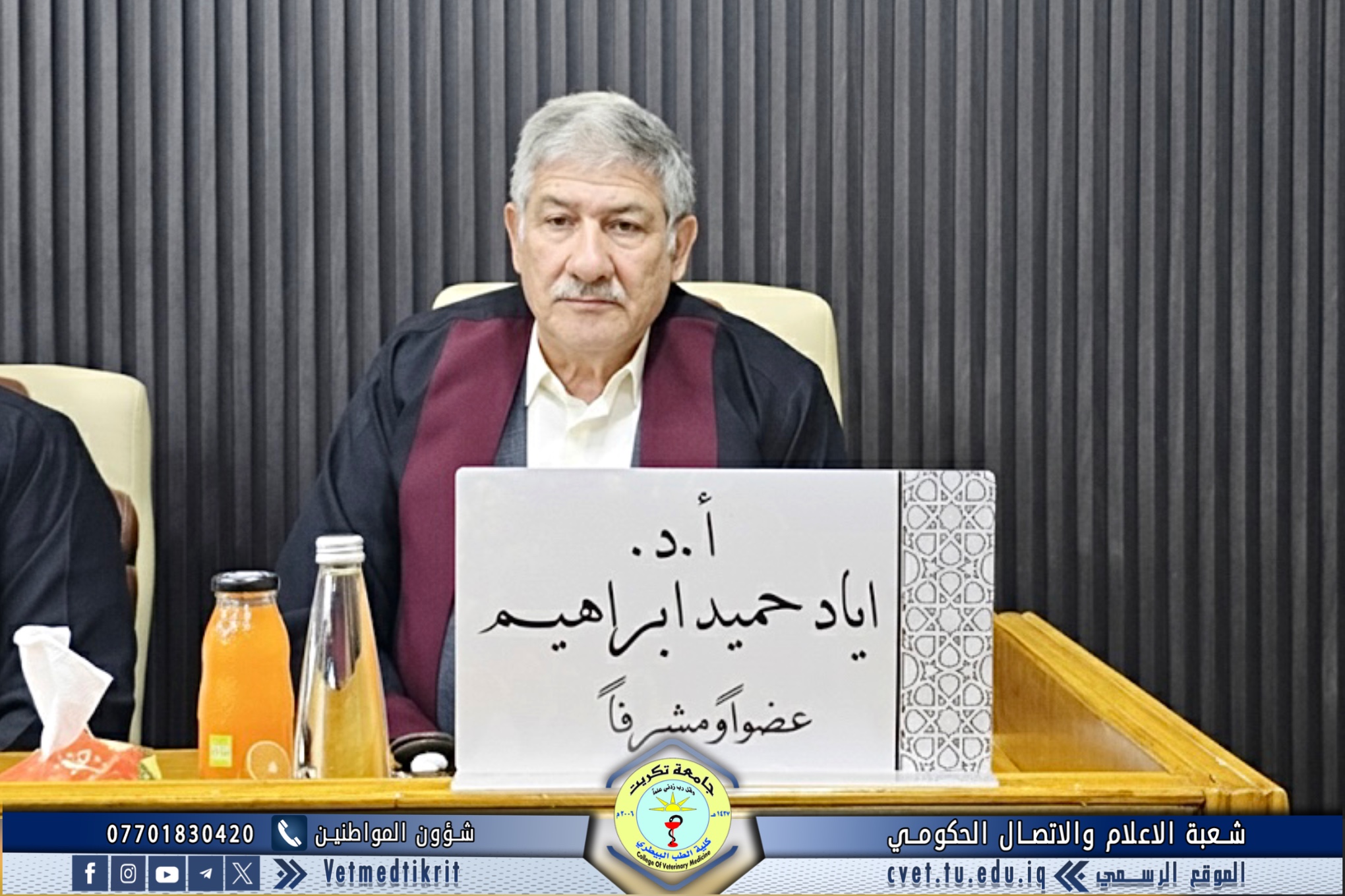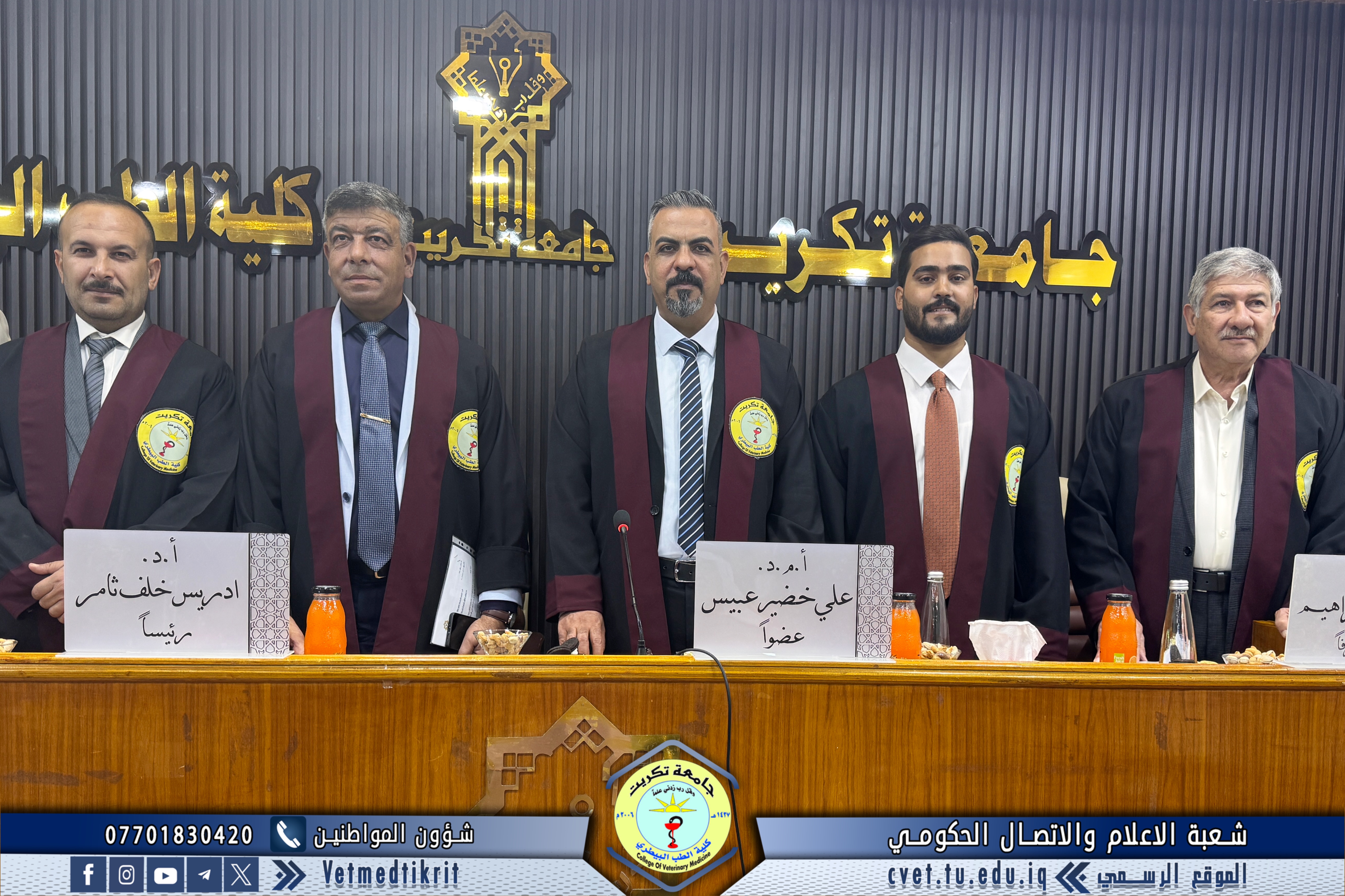 تم بعون الله تعالى في كلية الطب البيطري في جامعة تكريت وبحضور الاستاذ الدكتور بشار صادق نومي عميد الكلية مناقشة رسالة الماجستير الموسومة (دراسة مقارنة مظهرية, نسجية ونسجية كيميائية للمنفحة في الحملان الرضع في الاغنام والماعز المحلية) للطالب (محمد عبدالستار رشيد محمد) في تخصص (الانسجة البيطرية). حيث تألفت لجنة المناقشة من كل من: