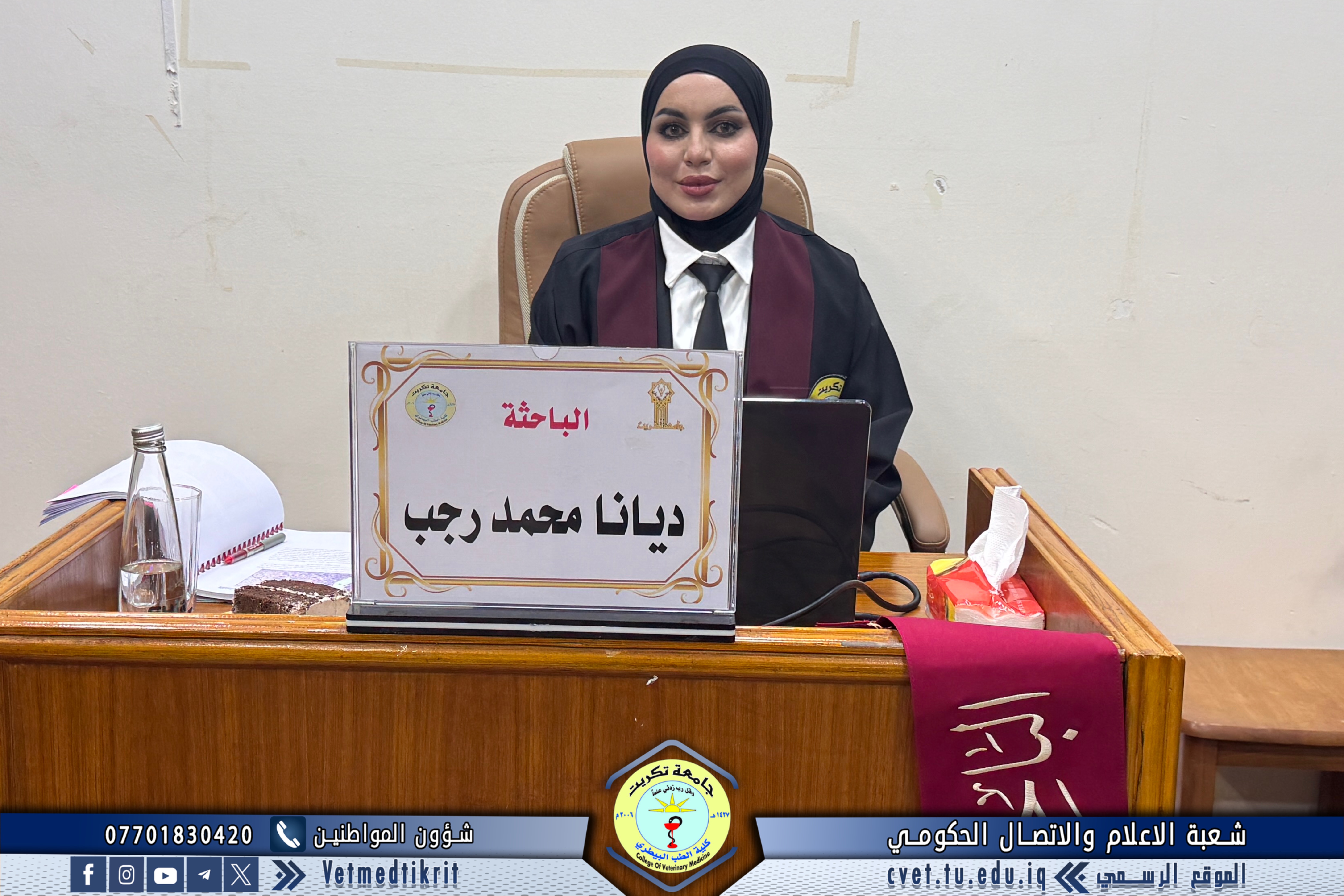 تم بعون الله تعالى في كلية الطب البيطري في جامعة تكريت مناقشة رسالة الماجستير الموسومة (مقارنة التركيب النسجي للغدة الكضرية في الارانب والدجاج المحلي بأعمار مختلفة (دراسة نسجية، نسجية كيميائية وقياسية نسجية)) للطالبة (ديانا محمد رجب) في تخصص (الانسجة البيطرية). حيث تألفت لجنة المناقشة من كل من: