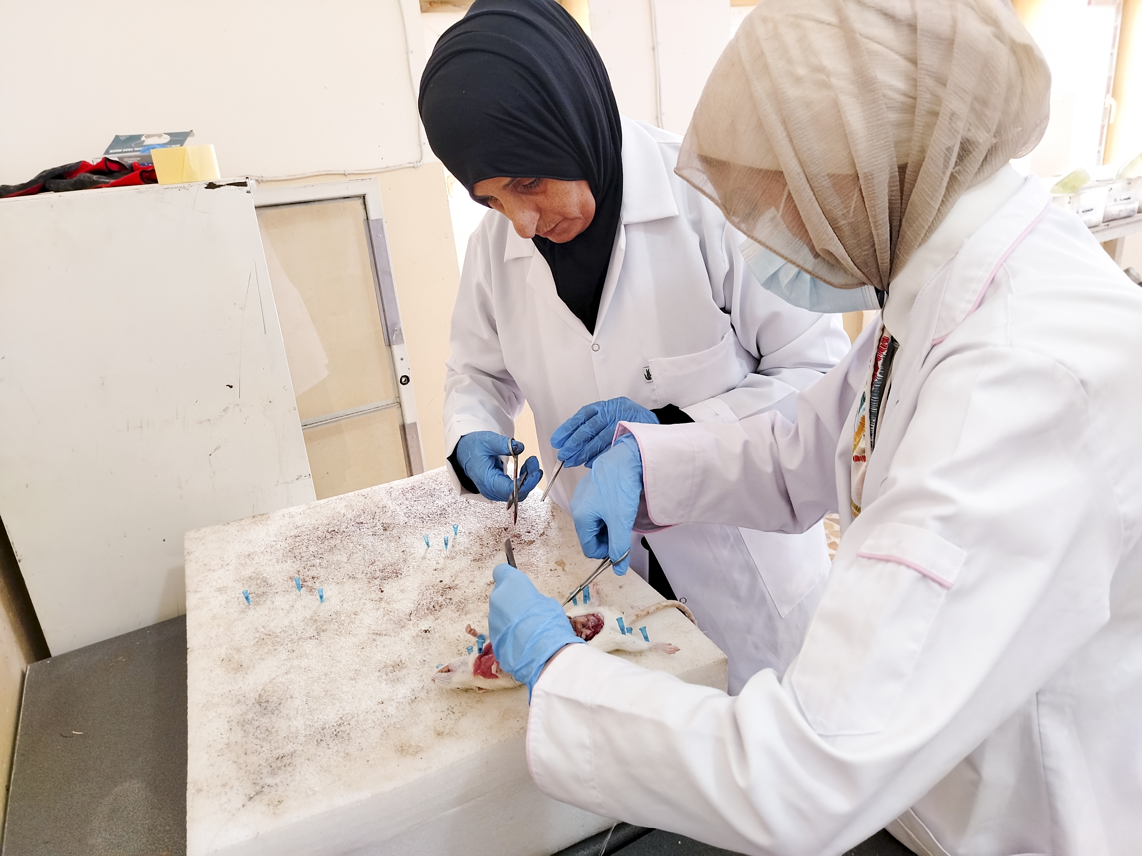 طلبة الدراسات العليا في ماجستير الأدوية البيطرية يجرون تجاربهم العملية في البيت الحيواني التابع للكلية