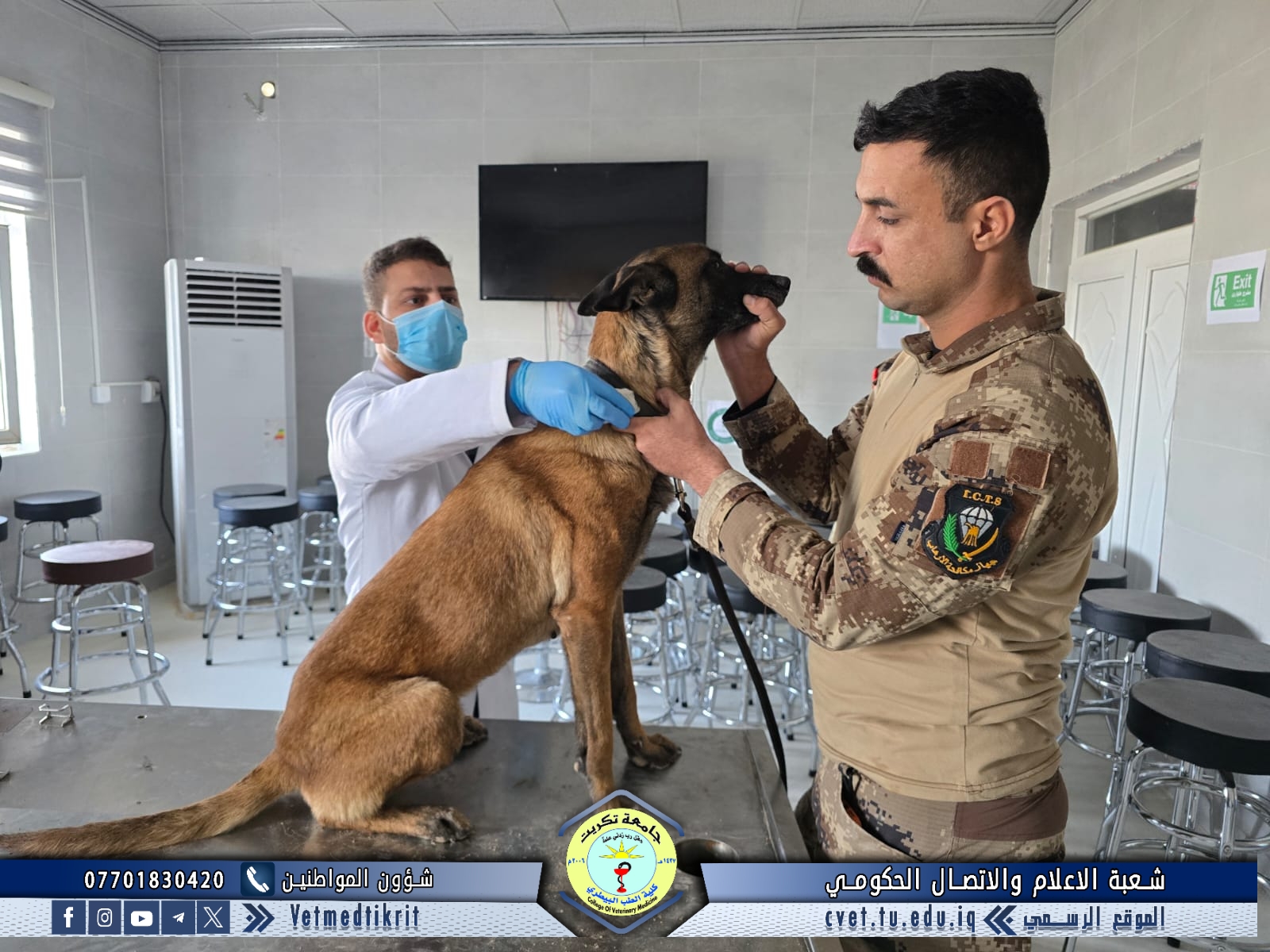 استقبلت وحدة العيادة الخارجية في كلية الطب البيطري بجامعة تكريت حالة بيطرية لكلب (K-9) تابع لجهاز مكافحة الإرهاب في محافظة صلاح الدين، وذلك لغرض إجراء الفحوصات الطبية الدورية اللازمة، وتشخيص وعلاج أي حالات مرضية محتملة.