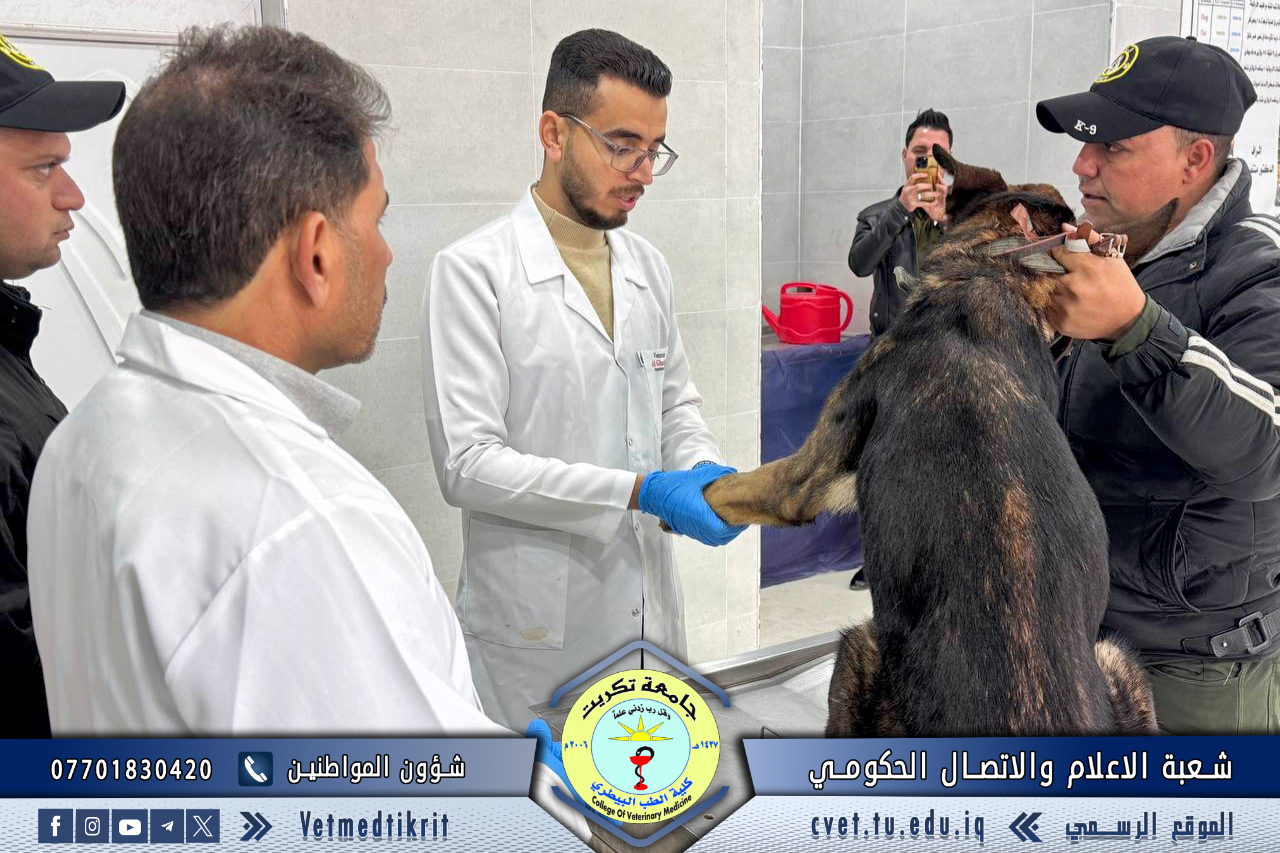 ضمن نهج كلية الطب البيطري بجامعة تكريت في تقديم خدماتها للقوات الامنية في محافظة صلاح الدين، استقبلت وحدة العيادة الخارجية حالة بيطرية لكلب K9 تابع لقسم شرطة قضاء بلد بعد ملاحظات حول انتفاخ في قدمه الأمامية. أجرى الفريق الطبي بواسطة الدكتور علي غازي عطيه والدكتور نواف نور الدين ظاهر والطبيب البيطري سيف أحمد سليمان والطبيب البيطري موسى دخيل بحر، فحصًا شاملاً للكلب. بعد تقييم دقيق، تم استبعاد الأسباب الخطيرة المحتملة مثل الكسور أو التسمم، تم وصف العلاج المناسب مع تحديد خطة متابعة مستمرة لضمان الشفاء التام والوقاية من أي مضاعفات مستقبلية. حيث تم تقديم العلاجات المناسبة لضمان تعافي الحيوان وعودته لأداء مهامه الميدانية بكفاءة. تأتي هذه ضمن الجهود المستمرة للوحدة في تقديم الرعاية الطبية البيطرية المتخصصة للحيوانات العاملة في القطاعات الأمنية والخدمية.