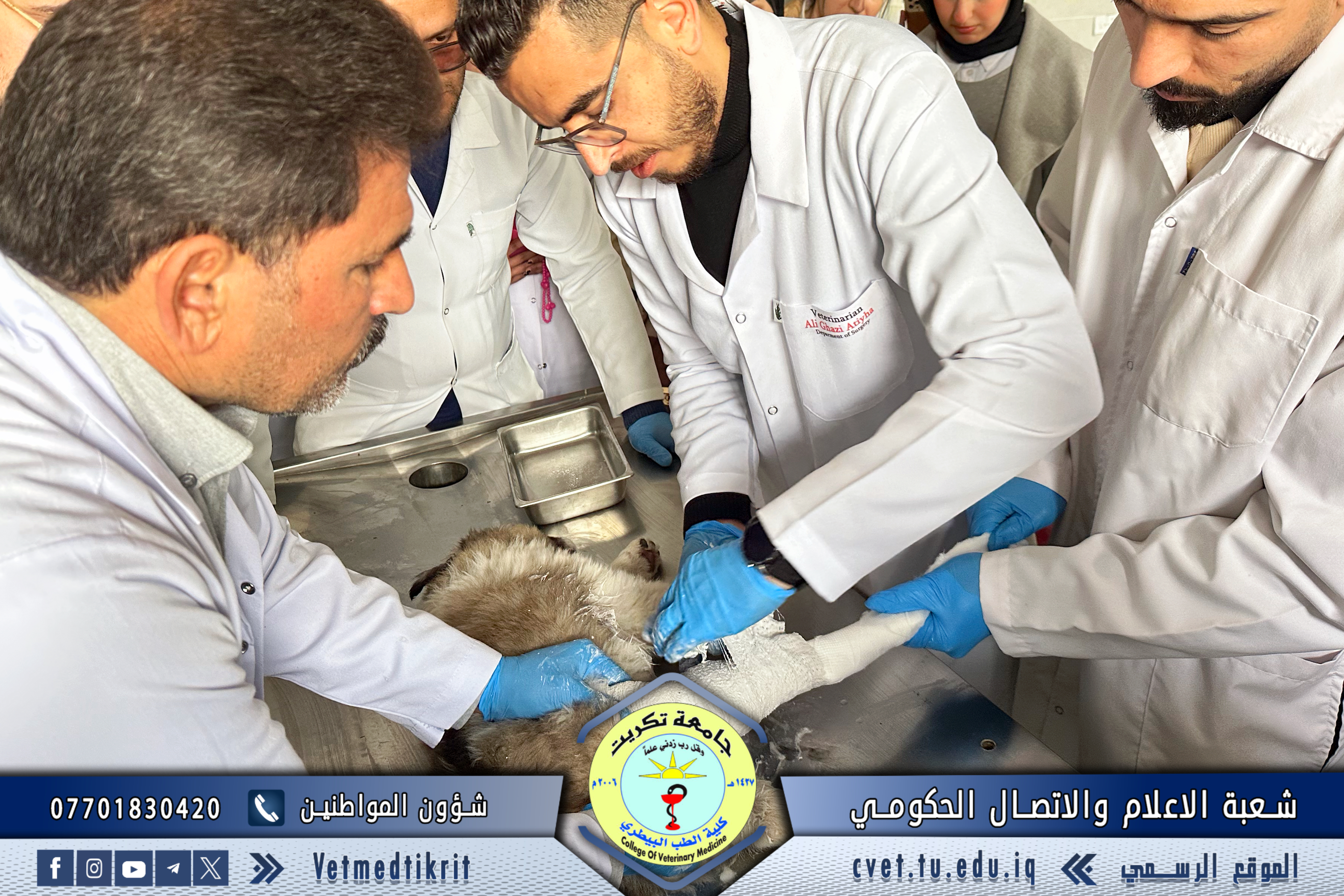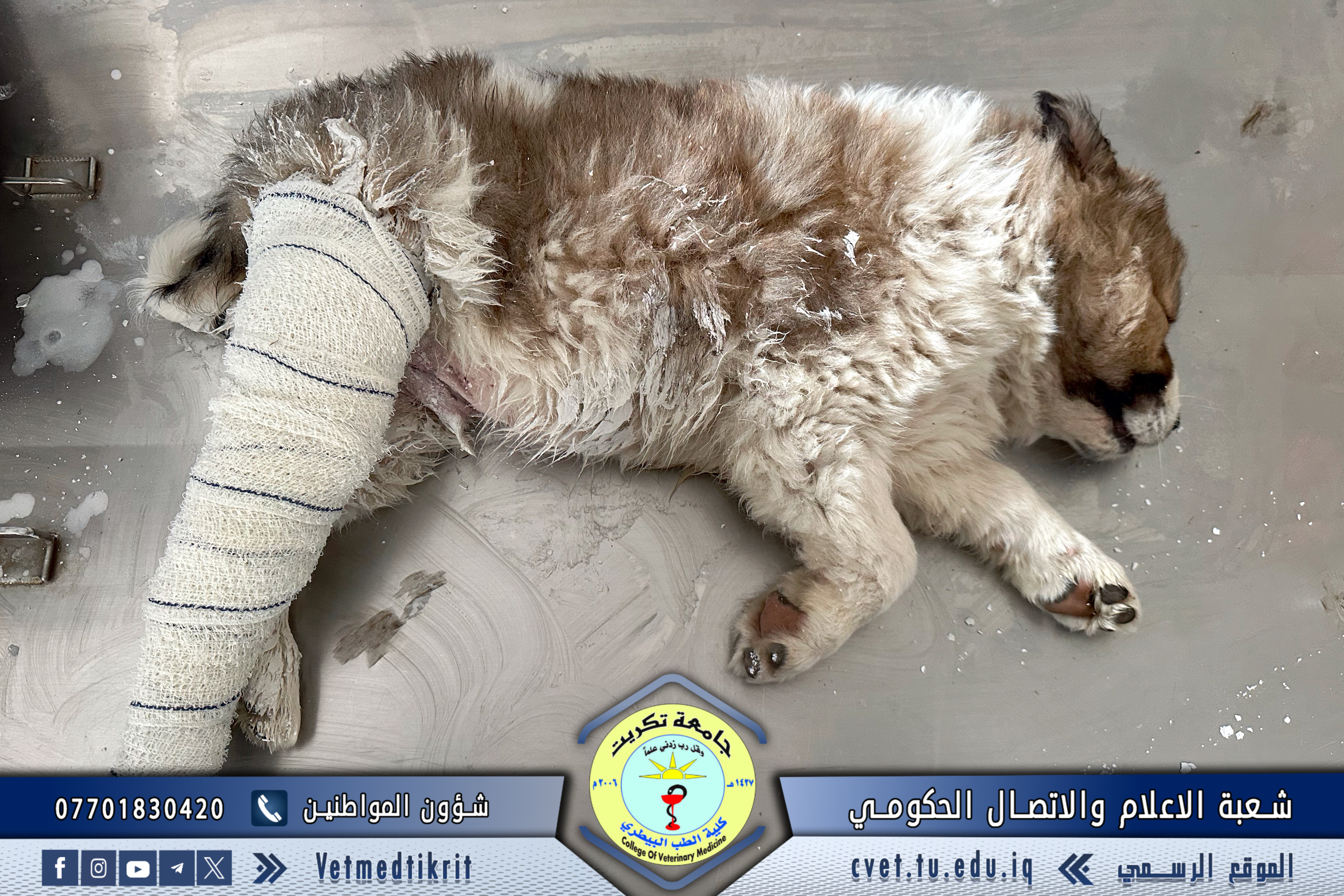 استقبلت وحدة العيادة الخارجية في كلية الطب البيطري بجامعة تكريت حالة كلب صغير تعرض لكسر في الساق الخلفية، حيث تمت معاينة الحالة تحت إشراف الأستاذ المساعد الدكتور نواف نور الدين، والمدرس الدكتور علي غازي عطية ،والطبيب البيطري موسى دخيل بحر والطبيب البيطري ميرفت أمين.