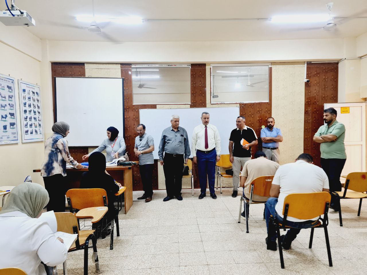 بحضور واشراف الاستاذ الدكتور بشار صادق نومي عميد كلية الطب البيطري بجامعة تكريت، زارت لجنة جامعية مؤلفة من كل من (الدكتور عبد احمد رديني والدكتور احمد سعيد) القاعات الامتحانية للاطلاع على سير الامتحانات النهائية للدور الثاني التي تجري حاليا في الكلية. حيث اطلع السادة اعضاء اللجنة خلال الزيارة على تنظيم القاعات والدفاتر الامتحانية ومستوى الاسئلة وسجلات الحضور والغياب وعدد من الامور الاخرى المتعلقة بالامتحانات. واعرب السادة اعضاء اللجنة خلال الزيارة عن اعجابهم بمدى تنظيم الامتحانات في الكلية متمنين التوفيق لجميع الطلبة. ورافق السيد عميد الكلية والسادة اعضاء اللجنة خلال الزيارة كلا من الاستاذ المساعد دخيل حسين حدري معاون العميد للشؤون العلمية والمدرس الدكتور اسامة حميد شهاب معاون العميد للشؤون الادارية.