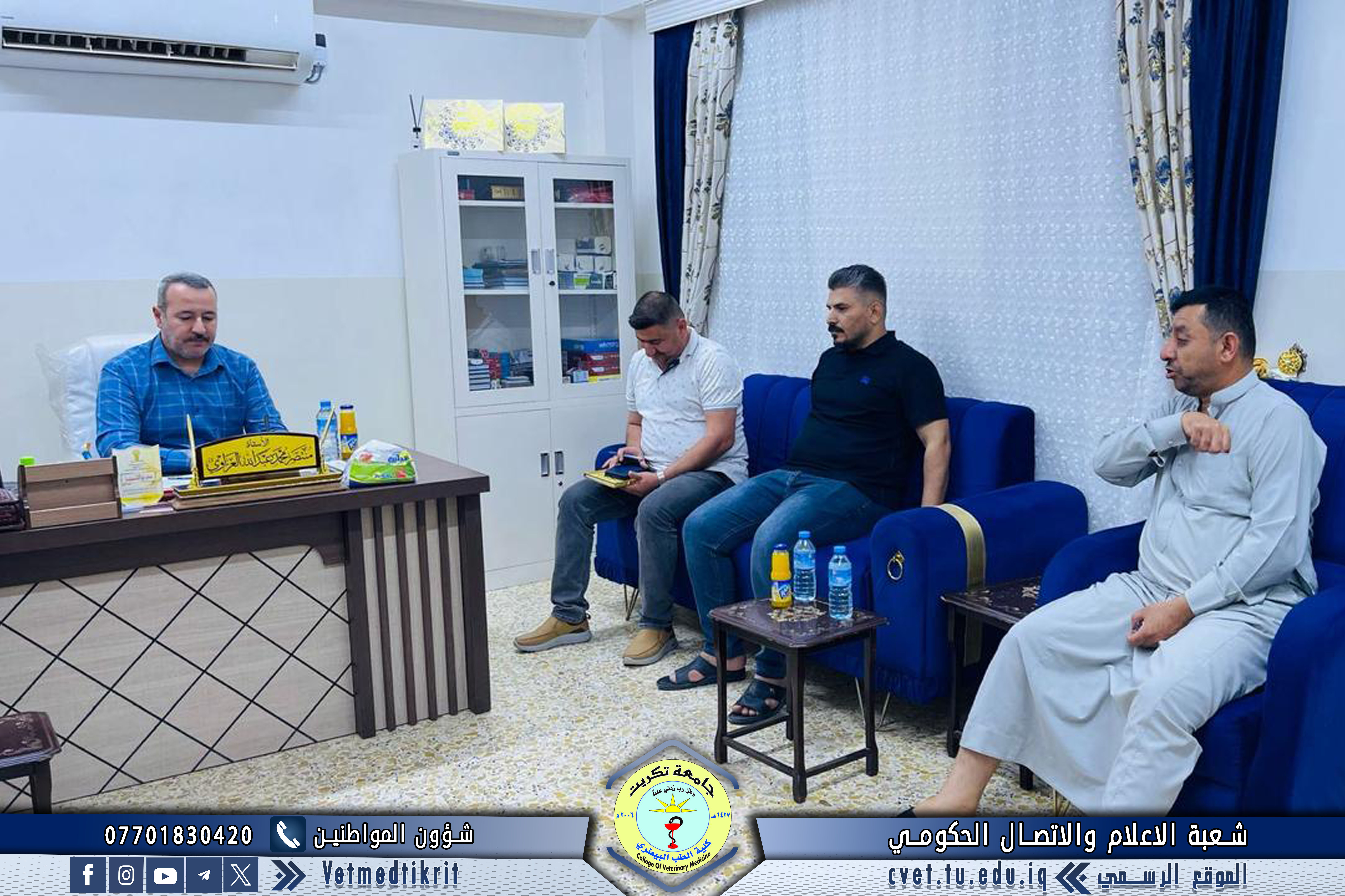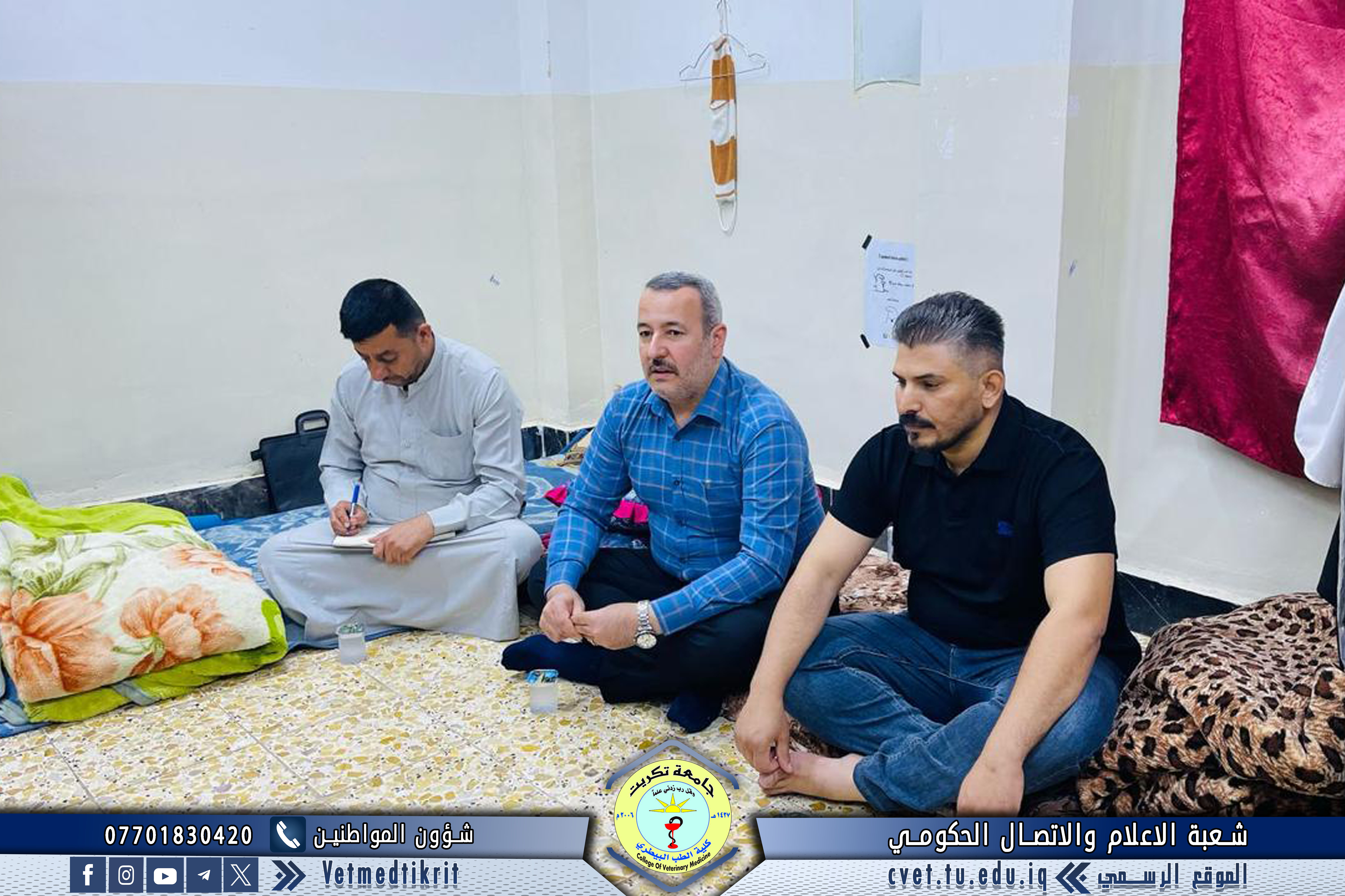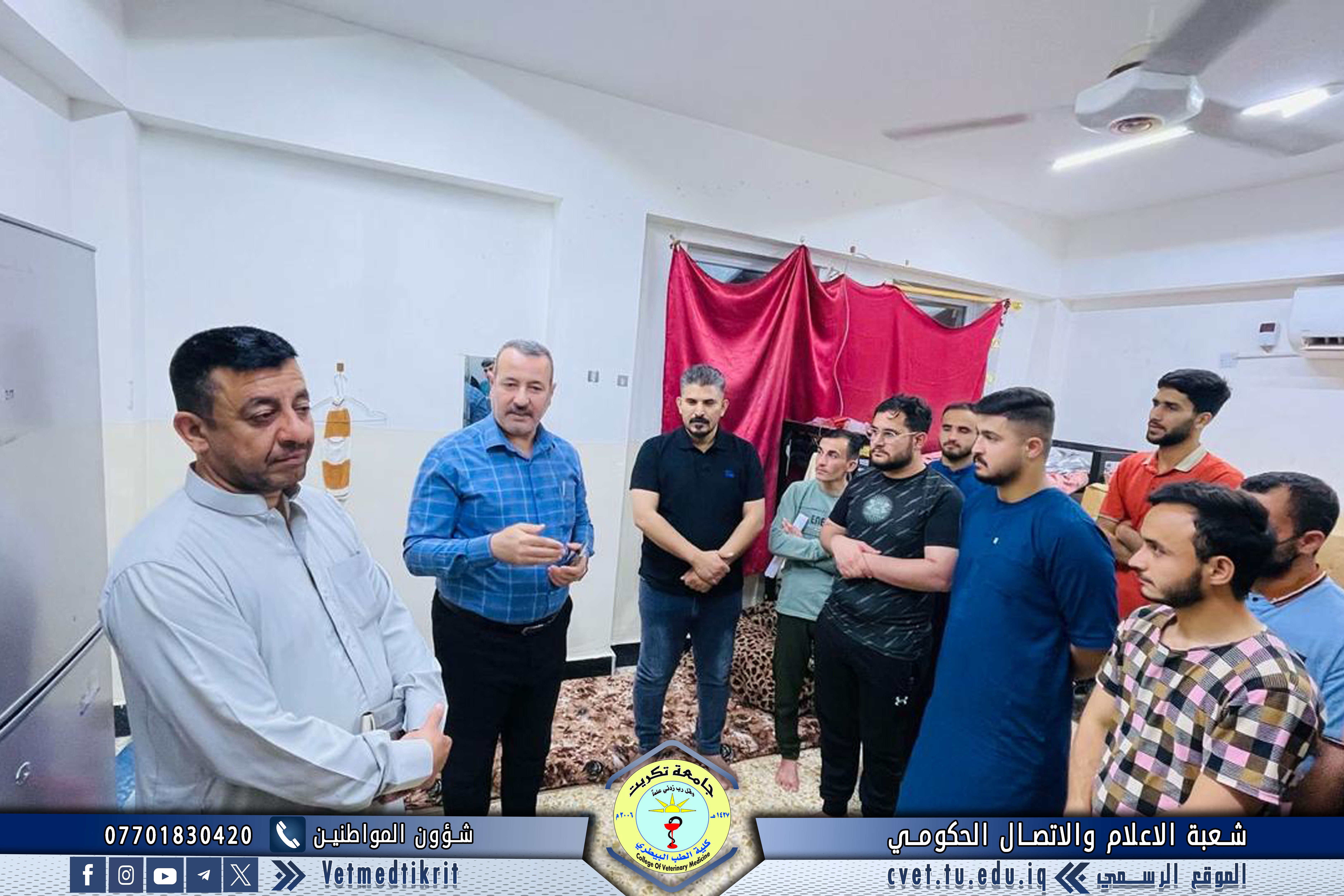 زار وفد من عمادة كلية الطب البيطري بجامعة تكريت الأقسام الداخلية المخصصة لطلبة الكلية، وضم الوفد كلاً من الأستاذ الدكتور بشار صادق نومي عميد الكلية، والأستاذ المساعد الدكتور أسامة حميد شهاب معاون العميد للشؤون الإدارية، والأستاذ المساعد سعد صبار نصيف أمين مجلس الكلية. وتجوّل الوفد في الشقق السكنية الخاصة بطلبة كلية الطب البيطري، حيث التقى بعدد من الطلبة واستمع إلى مطالبهم ومقترحاتهم المتعلقة بالخدمات والسكن الجامعي. وقد وجّه السيد العميد بـتذليل العقبات وتلبية احتياجات الطلبة بما يسهم في توفير بيئة دراسية وسكنية مناسبة، كما أوصى الطلبة بـالتركيز على دراستهم وتحقيق أفضل النتائج الأكاديمية، متمنياً لهم دوام التوفيق والنجاح في مسيرتهم الجامعية.