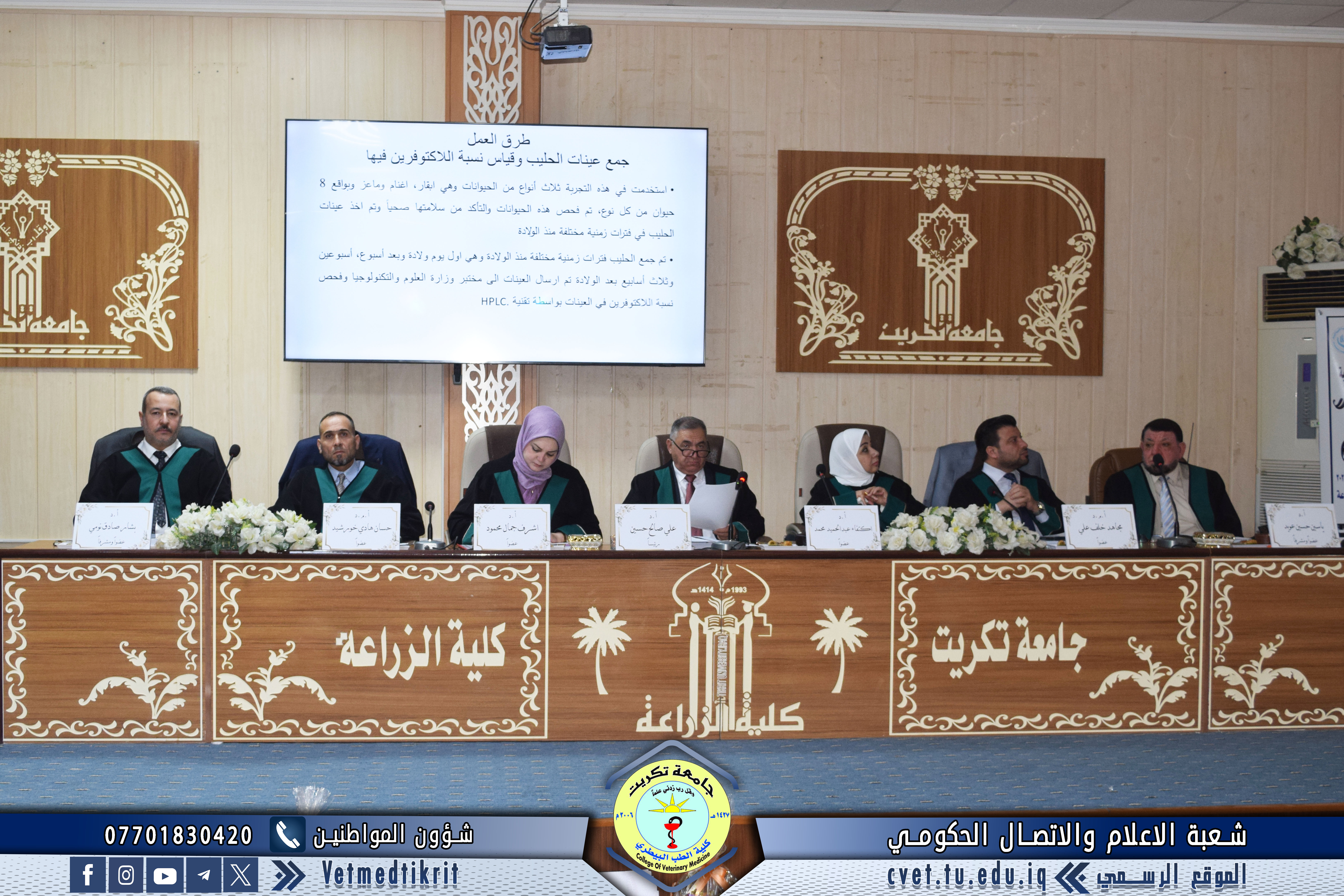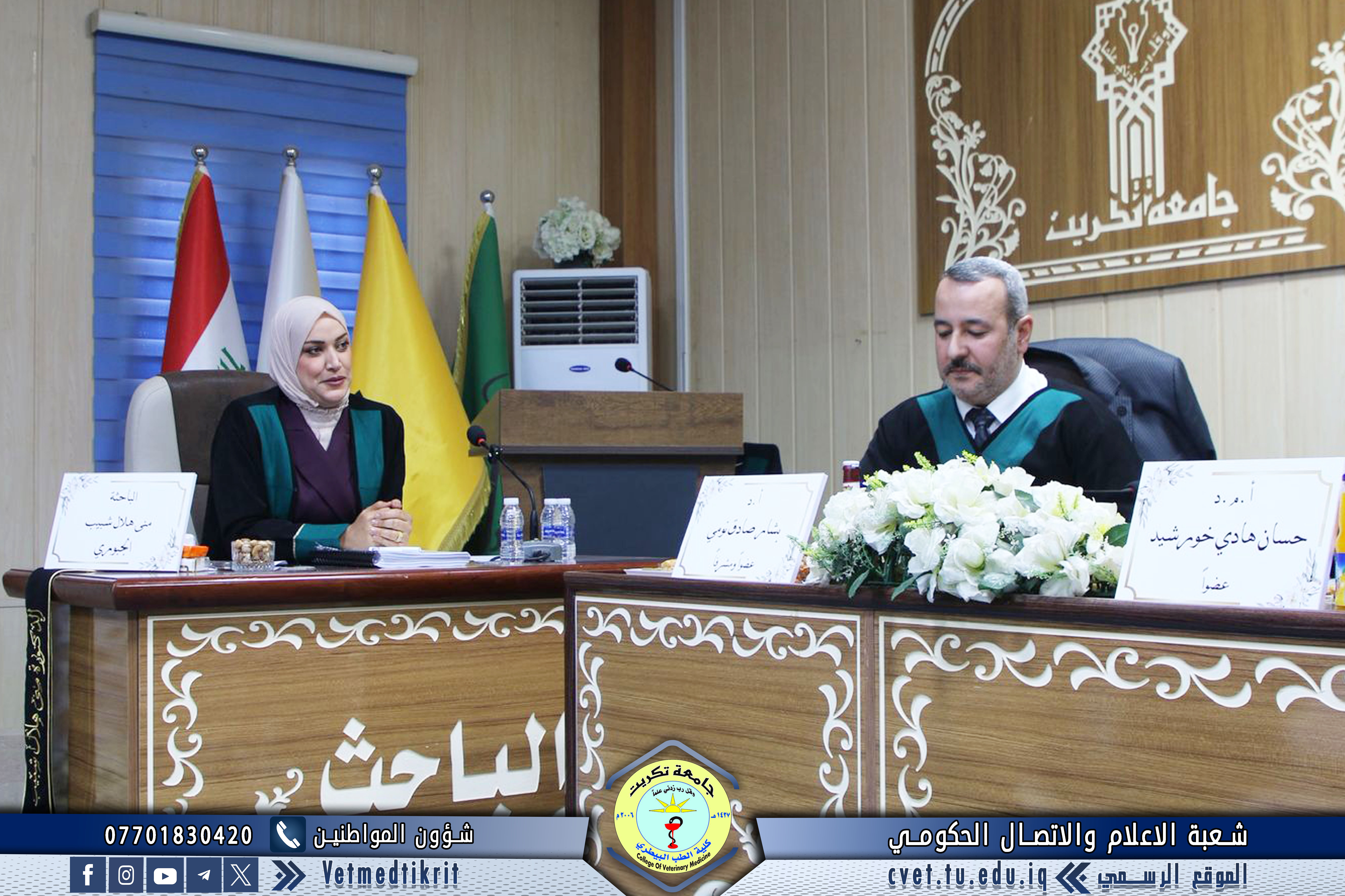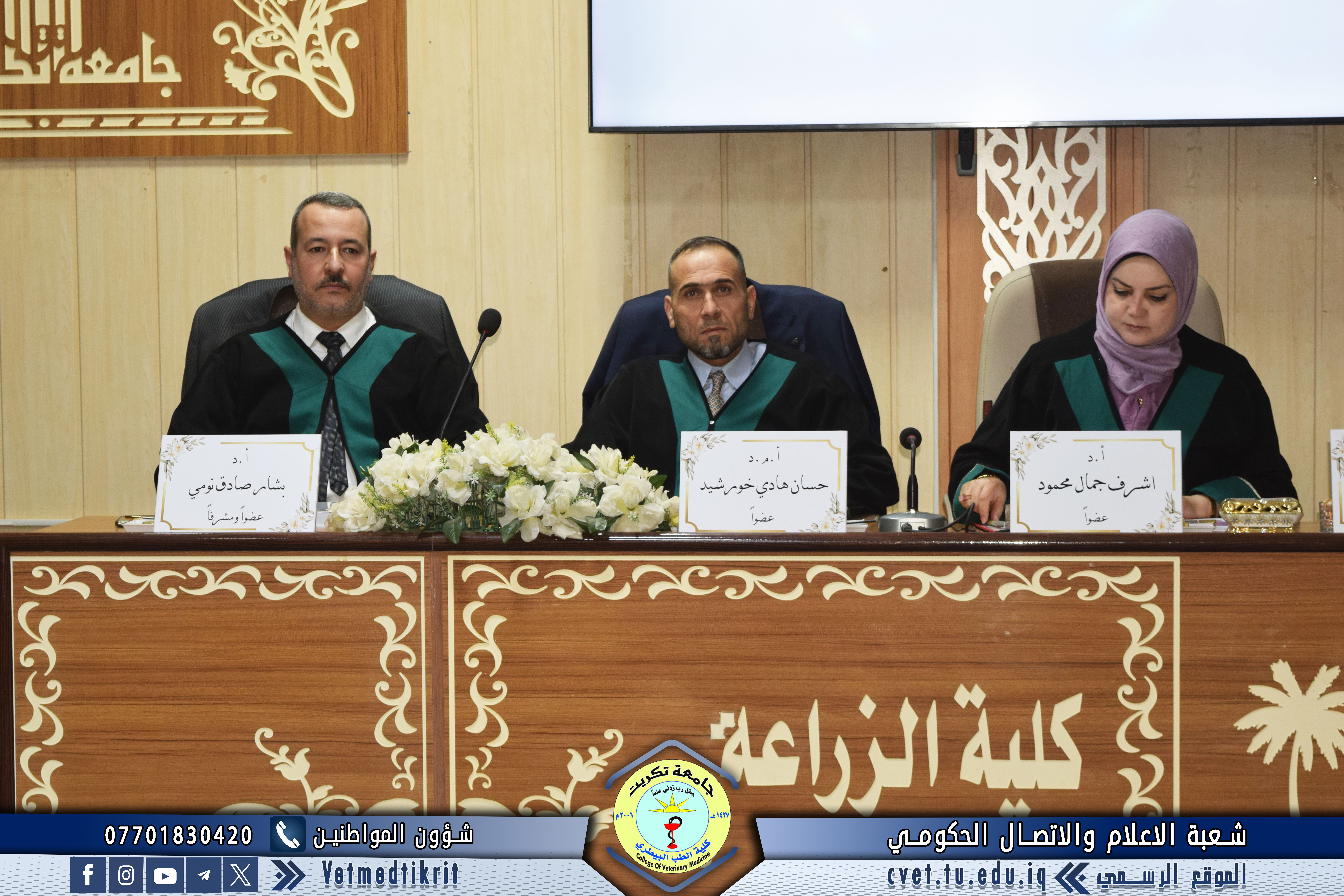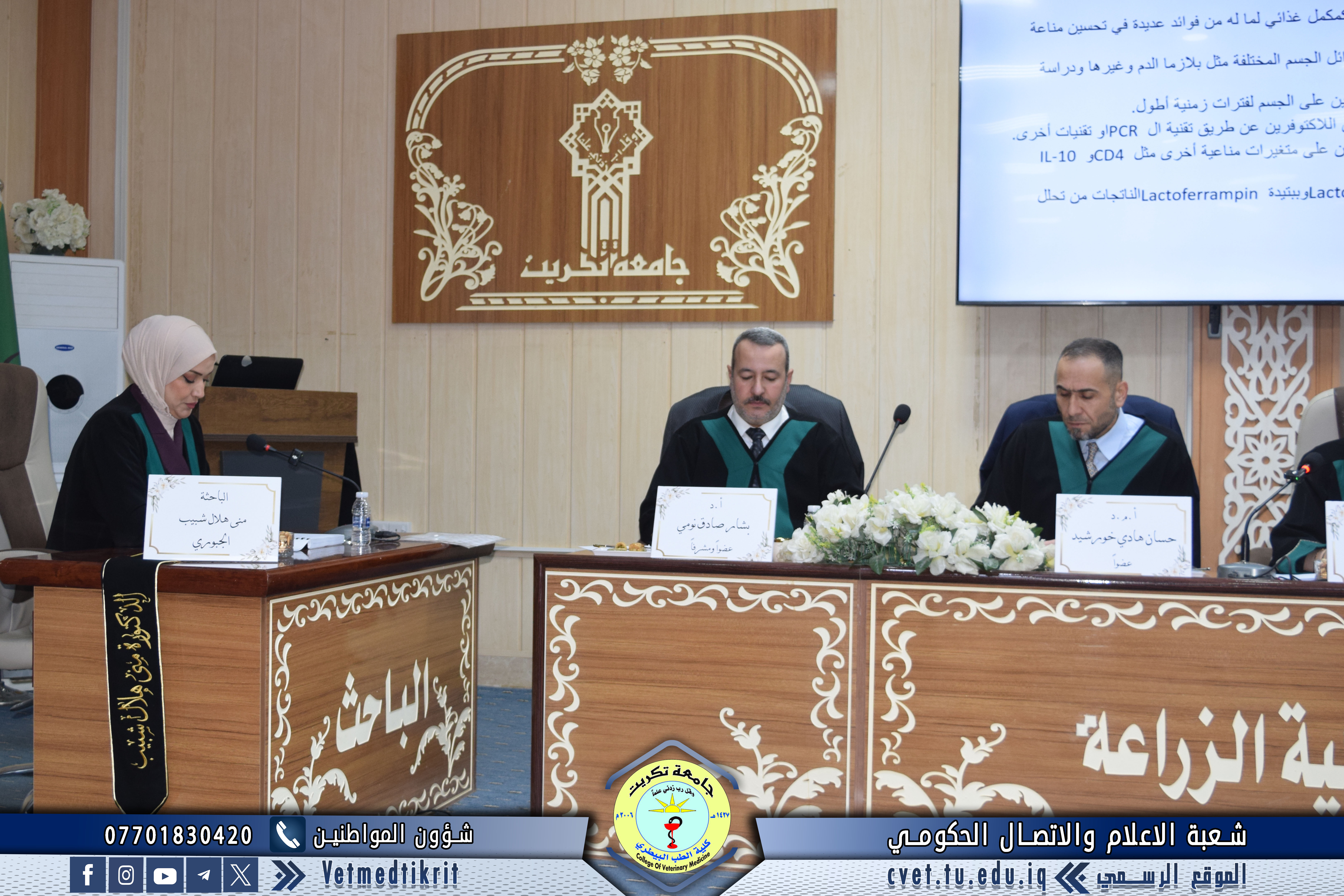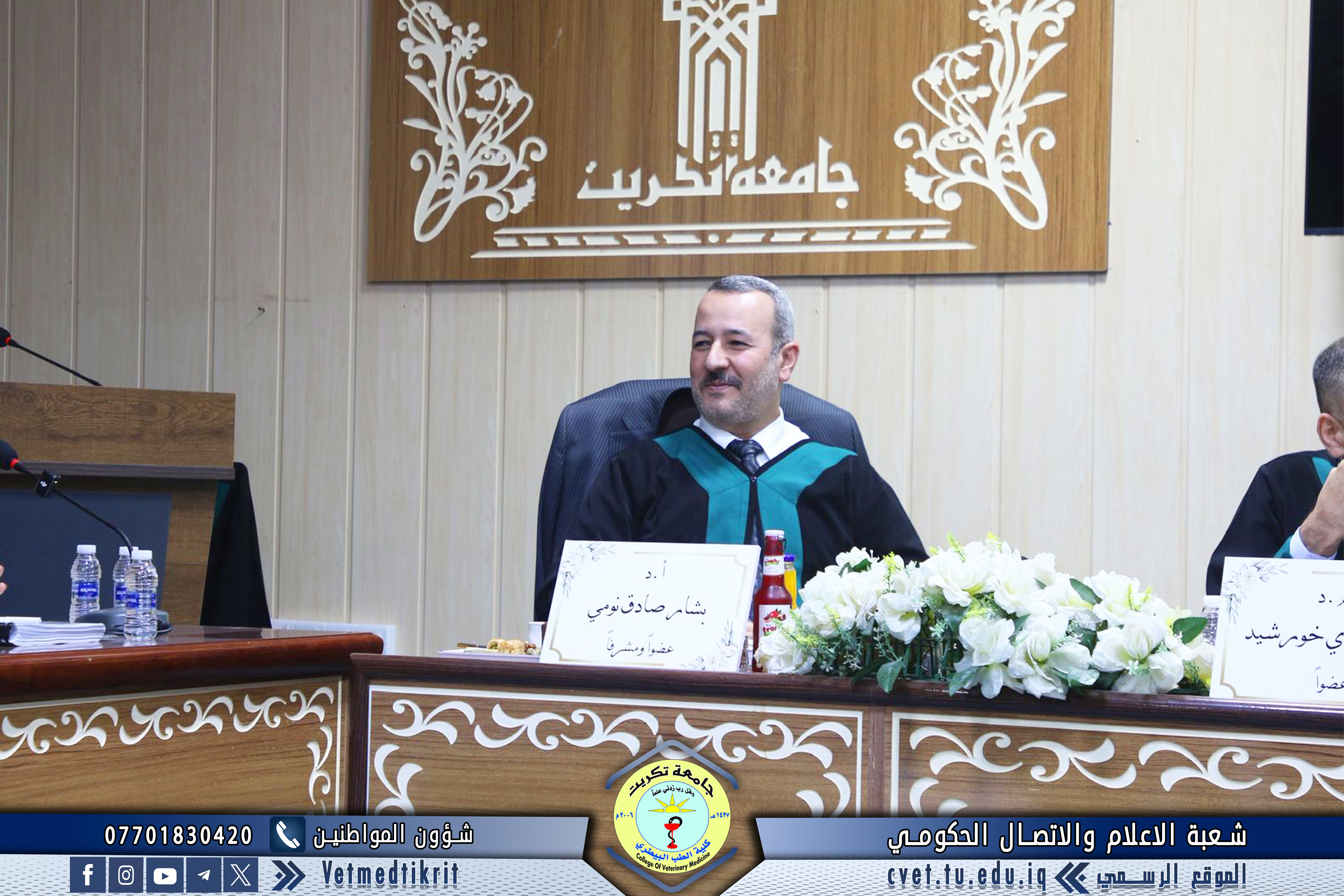 شارك الأستاذ الدكتور بشار صادق نومي، عميد كلية الطب البيطري بجامعة تكريت، في عضوية واشراف لجنة مناقشة أطروحة الدكتوراه الموسومة: (التأثير الفسلجي والمناعي والضد بكتري للاكتوفرين) والمقدّمة من قبل الطالبة منى هلال شبيب في قسم علوم الحياة – كلية التربية للبنات. وقد استضافت كلية الزراعة جلسة المناقشة، التي ترأسها الأستاذ الدكتور علي صالح الجبوري، رئيس الجامعة العراقية، وبعضوية الاستاذ المساعد الدكتور حسان هادي خورشيد رئيس فرع الامراض وامراض الدواجن والاسماك، وبحضور الاستاذ الدكتور وعد محمود رؤوف رئيس الجامعة، والاستاذ الدكتور حسن حسين ابراهيم مساعد رئيس الجامعة للشؤون العلمية، وعدد من الأساتذة والباحثين في المجال. تأتي هذه المشاركة في إطار التعاون العلمي بين الجامعات العراقية، ودعم المسيرة الأكاديمية والبحثية في مجالات العلوم الحياتية والطبية.