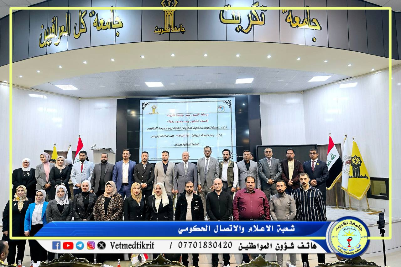 شاركت كلية الطب البيطري في الاحتفالية المركزية التي نظمها قسم ضمان الجودة والأداء الجامعي في رئاسة جامعة تكريت، بمناسبة اليوم العالمي للجودة. وتهدف هذه الفعالية إلى تعزيز ثقافة الجودة في المؤسسات التعليمية والبحثية، وإبراز أهمية الجودة في تحقيق التميز الأكاديمي والإداري.