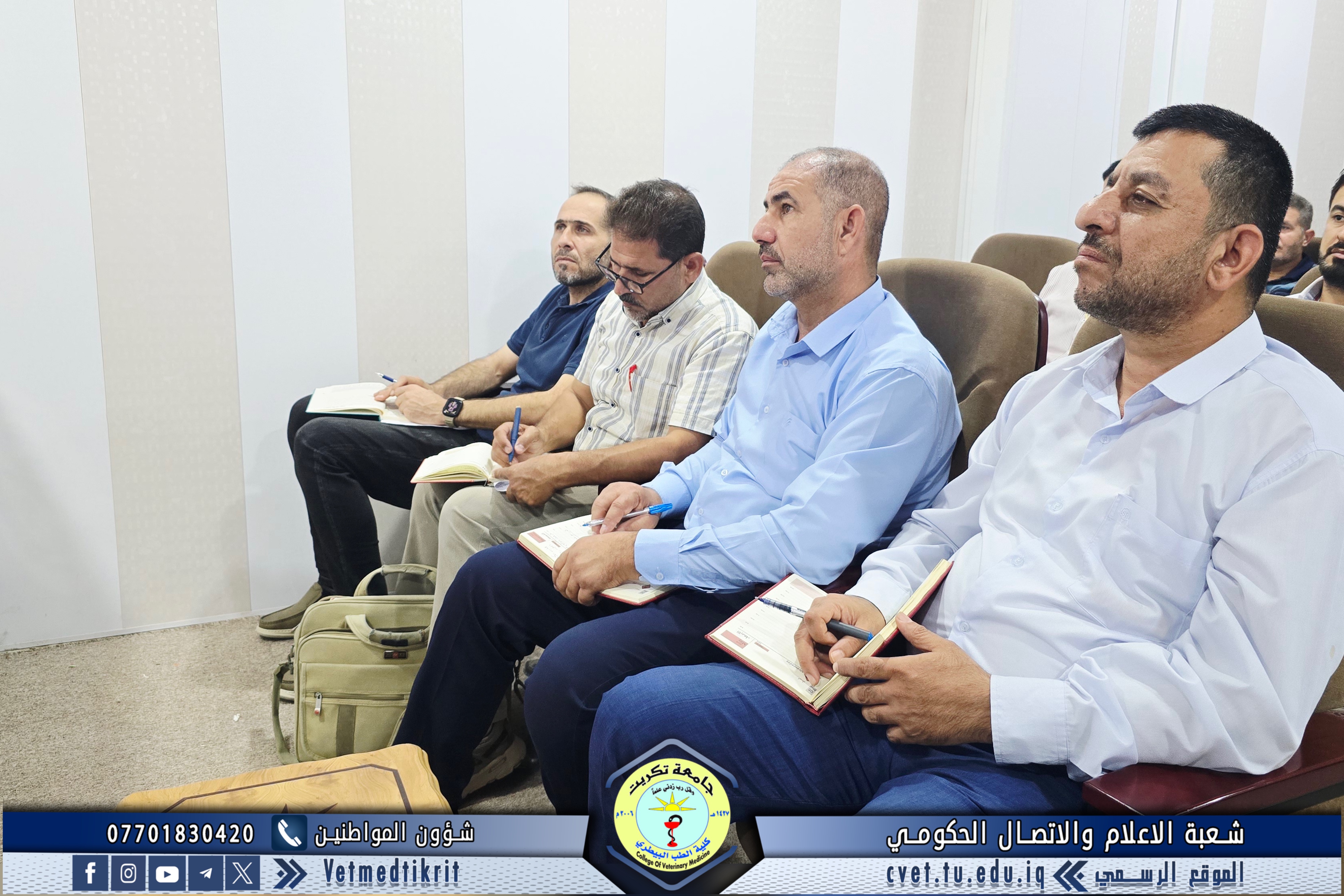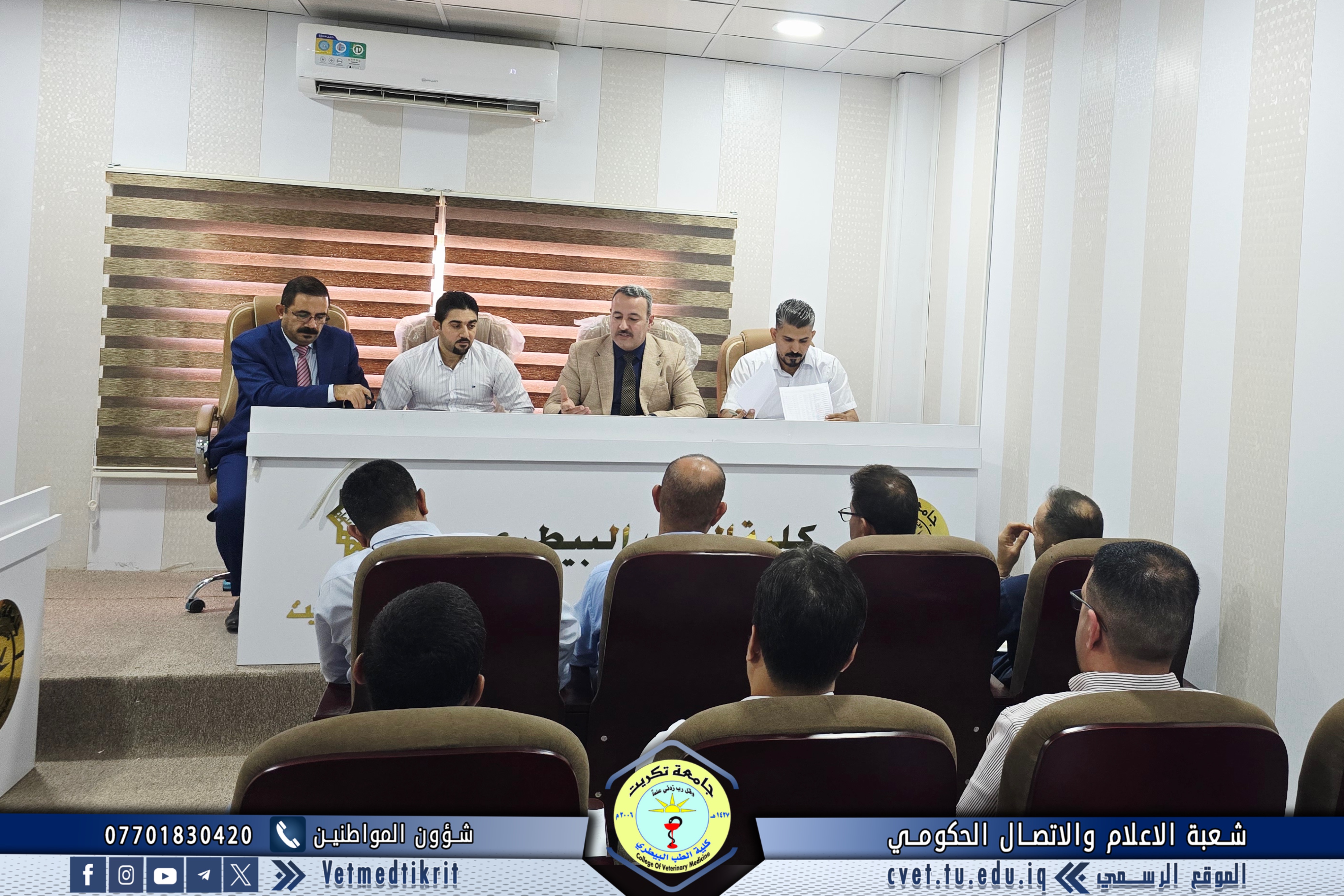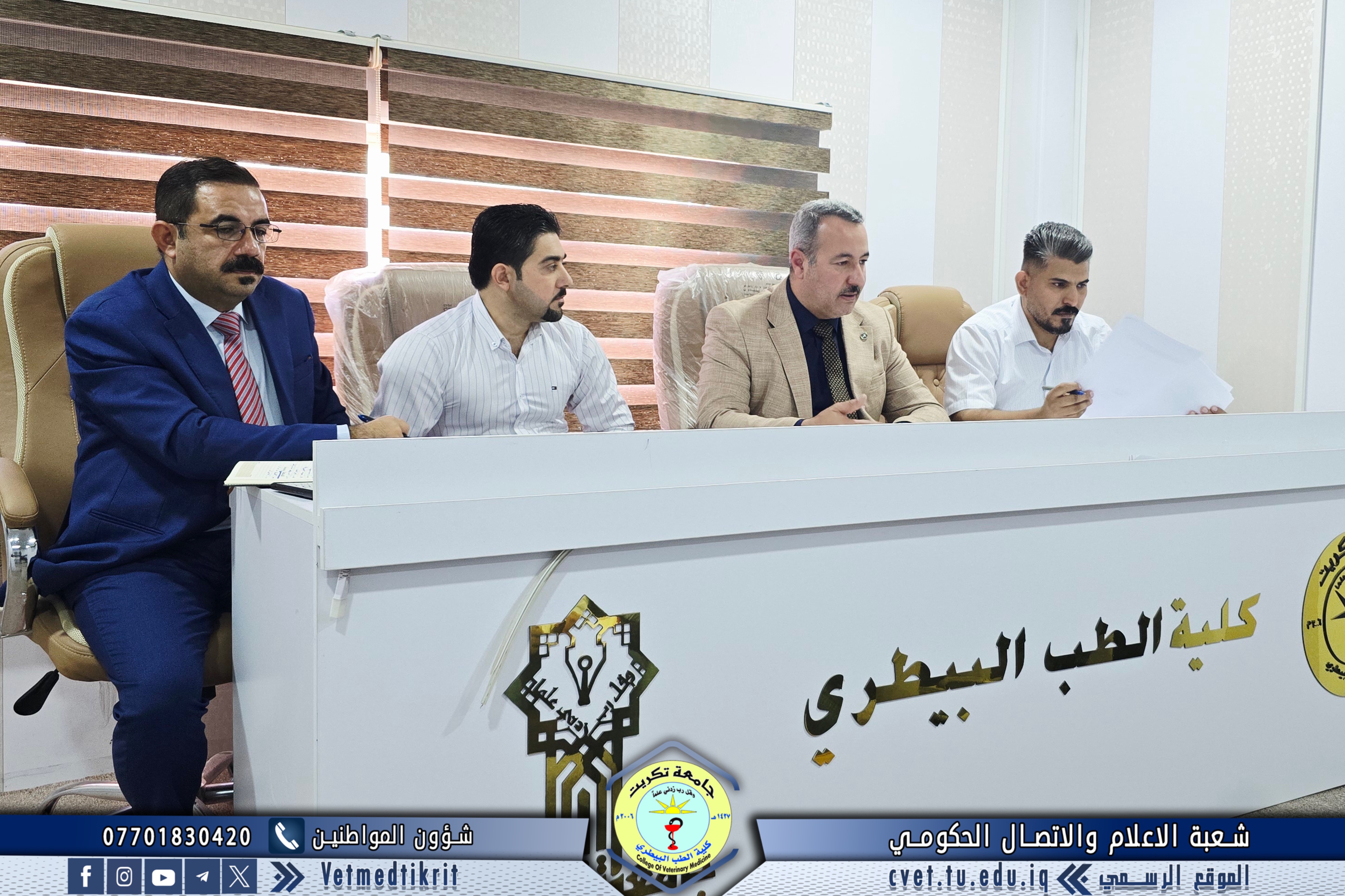 ترأس الأستاذ الدكتور بشار صادق نومي عميد كلية الطب البيطري اجتماعاً موسعاً مع رؤساء الفروع العلمية والشعب في الكلية، بمشاركة الأستاذ المساعد الدكتور منتصر محمد هلال معاون العميد للشؤون العلمية، و الأستاذ المساعد سعد صبار نصيف أمين مجلس الكلية، و المدرس المساعد منتصر محمد ندا مدير شعبة الشؤون الإدارية. وناقش الاجتماع عدداً من المحاور المهمة مع بدء العام الدراسي الجديد، أبرزها: التأكيد على الالتزام بالدوام الرسمي وتنظيمه، تكليف عدد من أعضاء الكادر التدريسي والإداري بمهام في الشعب والوحدات والمختبرات، ومتابعة الجوانب الإدارية والتنظيمية بما يضمن انسيابية العمل وتحقيق أفضل النتائج. ويأتي هذا الاجتماع في إطار حرص عمادة الكلية على تعزيز الانضباط والارتقاء بمستوى الأداء الأكاديمي والإداري بما ينعكس إيجاباً على المسيرة التعليمية والبحثية للكلية.