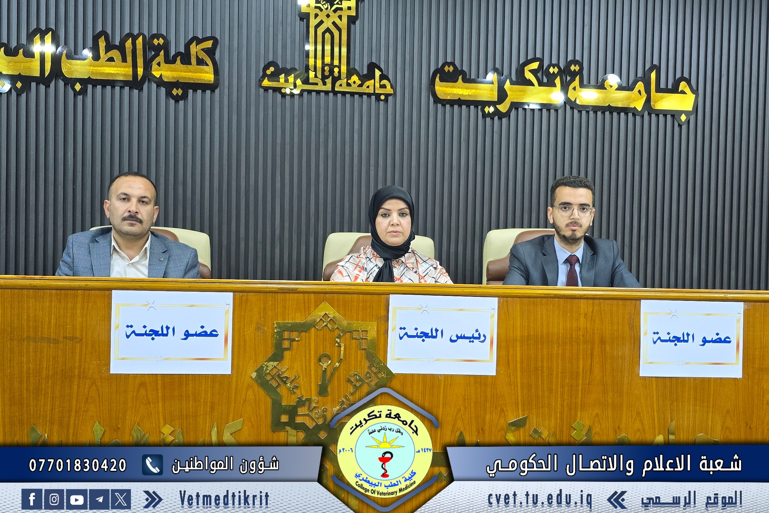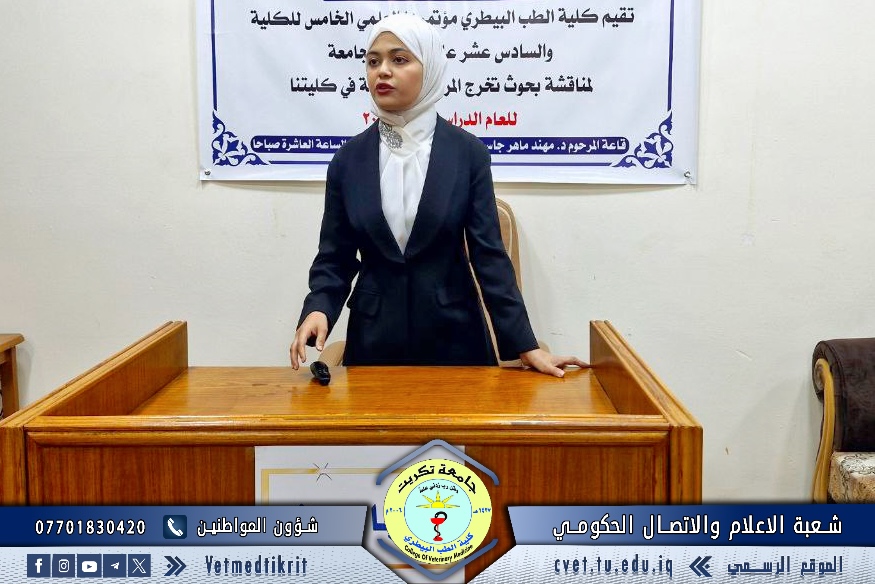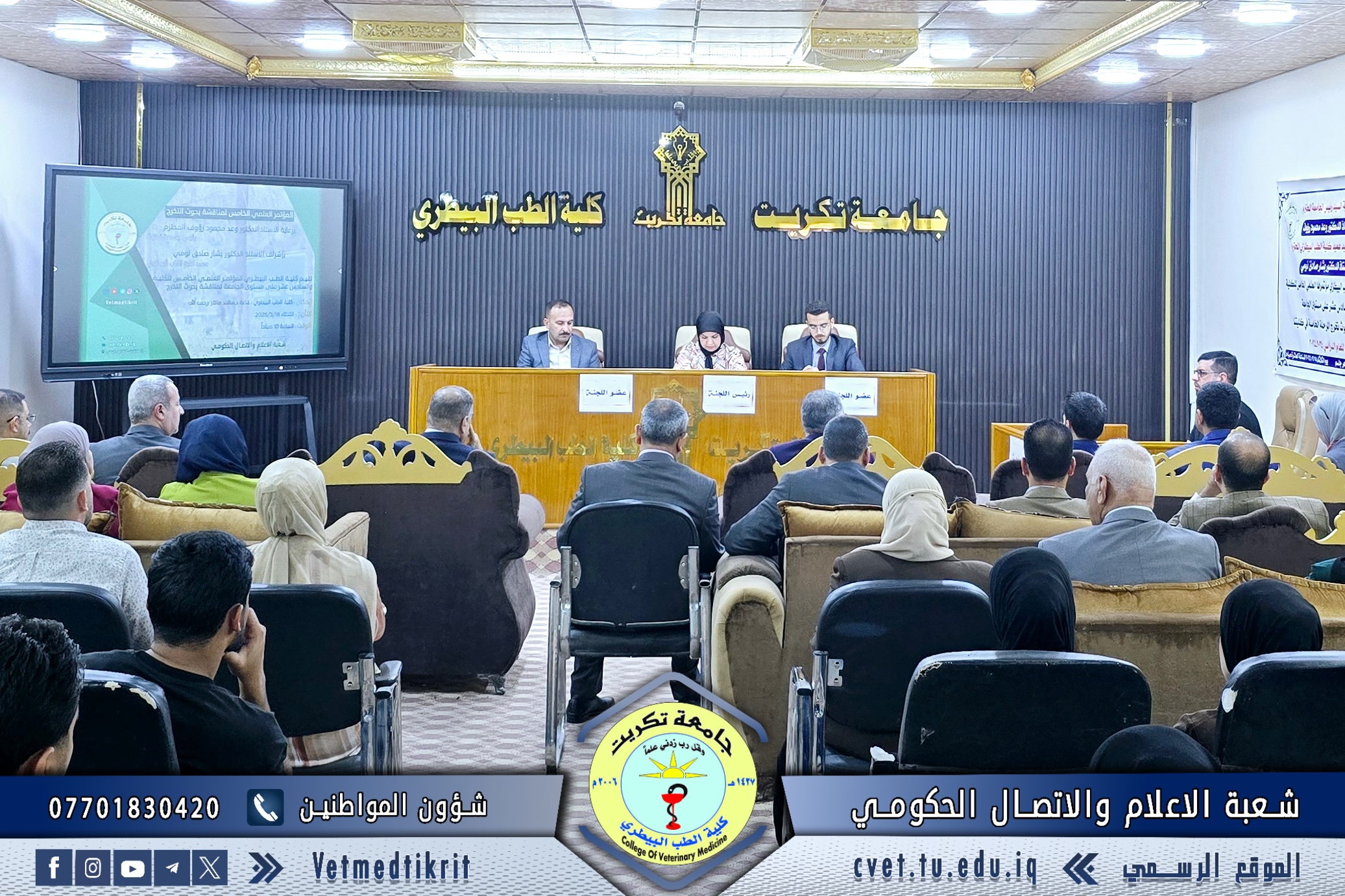 شهدت كلية الطب البيطري في جامعة تكريت فعاليات المؤتمر العلمي الخامس للكلية والسادس عشر على مستوى الجامعة، والمخصص لمناقشة بحوث تخرج طلبة المرحلة الخامسة، بحضور كل من مساعد رئيس الجامعة أ.د. حسن حسين ابراهيم وعميد كلية الطب البيطري أ.د. بشار صادق نومي.