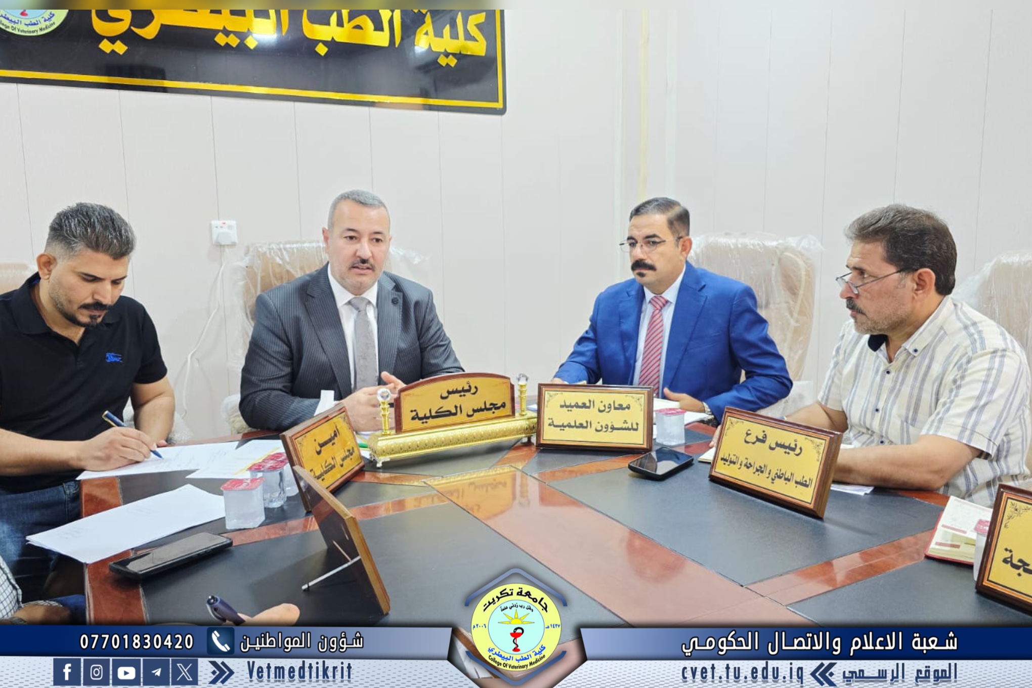 برئاسة الاستاذ الدكتور بشار صادق نومي عميد كلية الطب البيطري بجامعة تكريت، عقد مجلس الكلية جلسته الاعتيادية الثامنة ليوم الثلاثاء الموافق 20/5/2025 بحضور السادة معاوني العميد للشؤون العلمية والادارية والسيدات والسادة رؤساء الفروع العلمية والسيد امين المجلس واستضافة أ.م.د. احمد عبدالله سلطان مدير شعبة ضمان الجودة والاداء الجامعي، تم خلال الاجتماع مناقشة عدد من الامور من اهمها الاستعدادات لاستقبال اللجنة الجامعية المكلفة بتقييم مختبرات الكلية. حيث اكد رؤساء الفروع جاهزية الكلية بكافة مختبراتها لاستقبال اللجنة مؤكدين على التميز الذي وصلت اليه الكلية علميا واكاديميا مشيدين بجهود عمادة الكلية في الارتقاء الدائم بمستوى الكلية. كما تم خلال الجلسة مناقشة موضوع اعلان نتائج امتحانات نهاية الفصل الدراسي الاول للمراحل فرق الاولى، بالاضافة الى العديد من الامور التي تخص الكلية والطلبة بشكل عام.