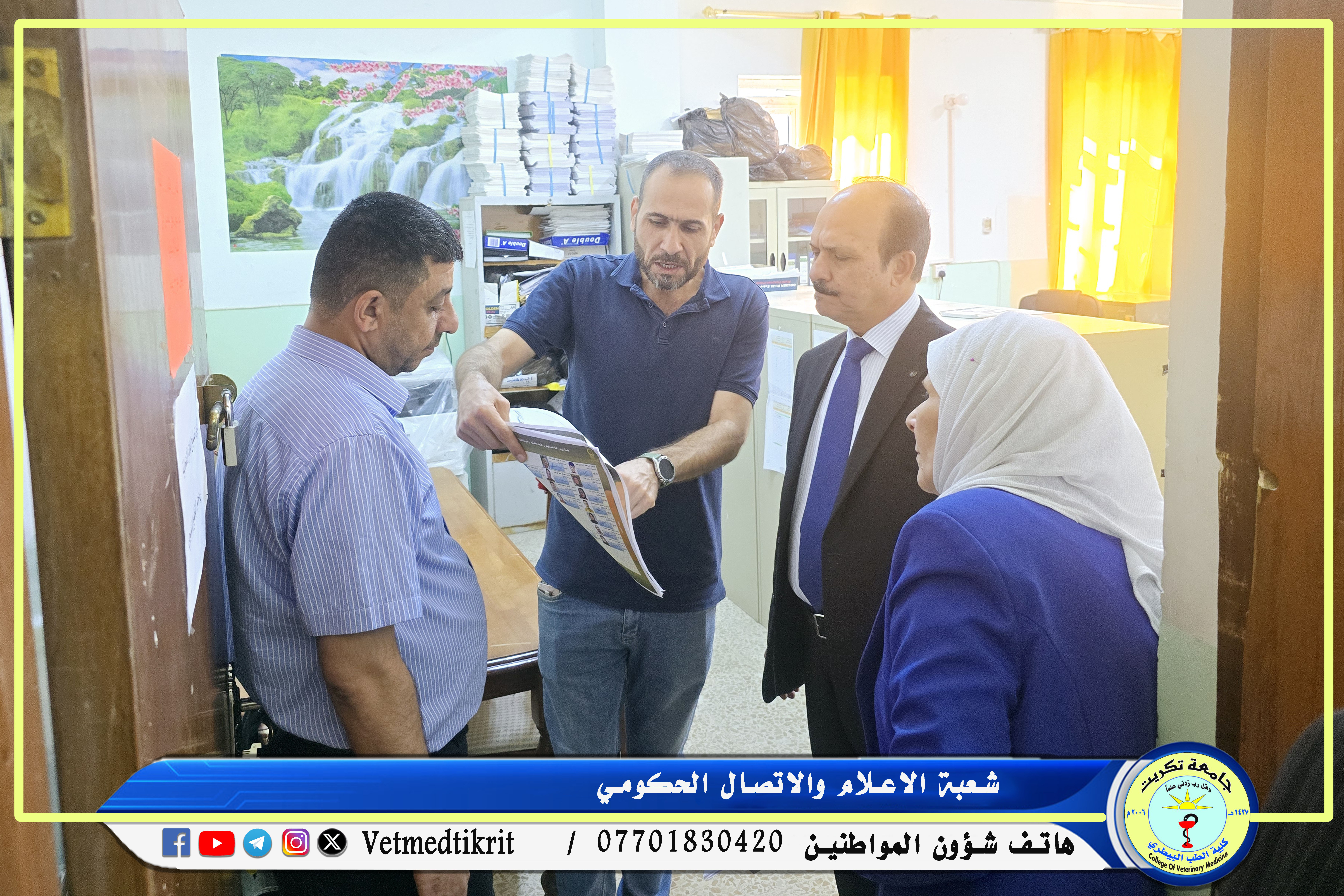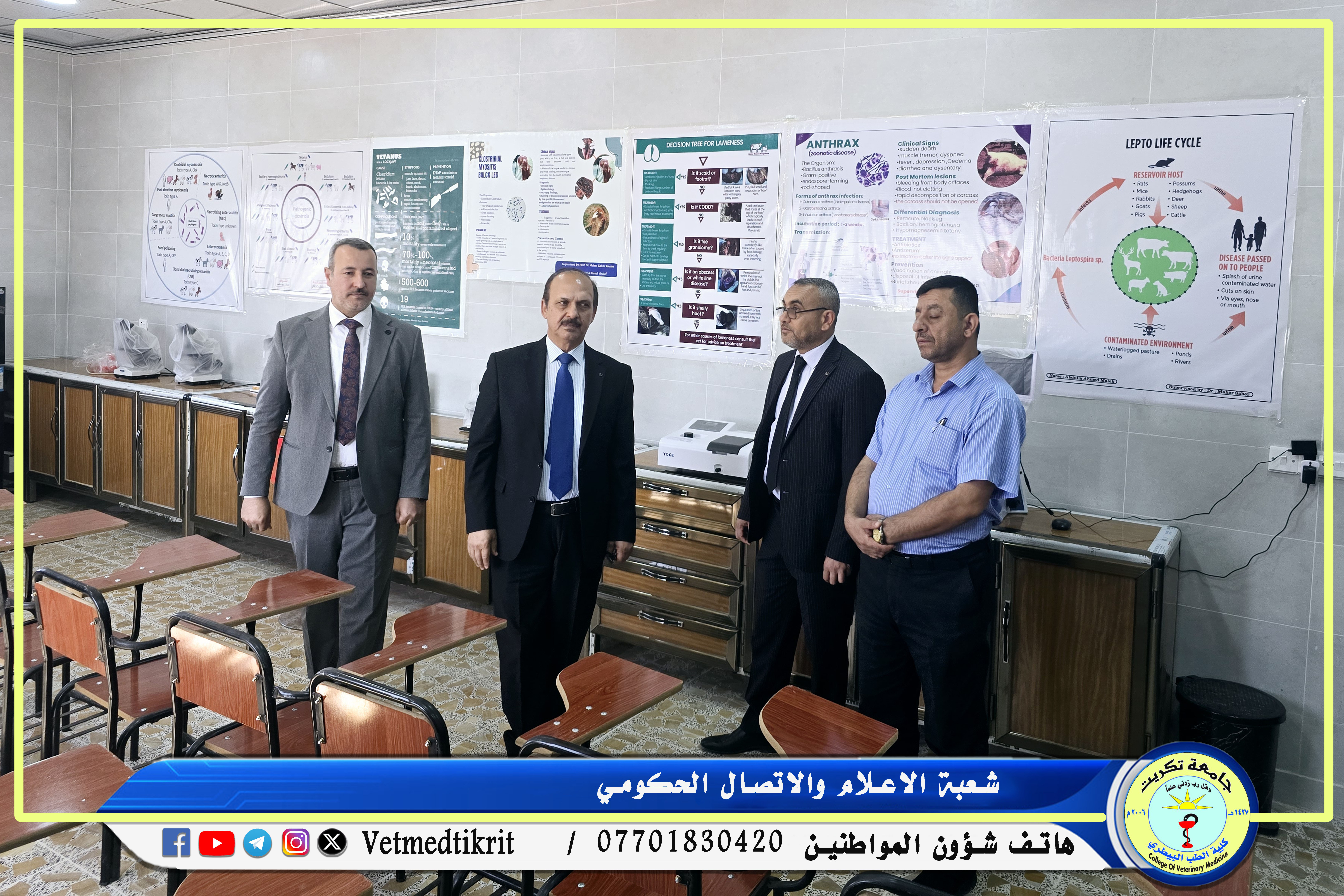 في إطار الزيارات الدورية التي تجريها وزارة التعليم العالي والبحث العلمي لتقييم واقع الكليات العراقية من الناحية الأكاديمية والبنية التحتية، استقبلت كلية الطب البيطري بجامعة تكريت اللجنة الوزارية المشكلة لمتابعة وتقييم الواقع العلمي والاكاديمي للكلية، كان في استقبال اللجنة الاستاذ الدكتور بشار صادق نومي عميد الكلية والذي رافق الوفد المؤلف من كل من: (الاستاذ الدكتورة عفاف عبدالرحمن يوسف والاستاذ الدكتور احمد حميد فتح الله) في جولته التي شملت القاعات الدراسية، المختبرات، اللجنة الامتحانية، مكتبة الكلية، البيت الحيواني، ووحدة العيادة الخارجية. حيث أكدت اللجنة أن الهدف من الزيارة هو الاطلاع وتقييم الواقع العلمي والتربوي في كلية الطب البيطري مشيرة الى حرص الوزارة على المتابعة المستمرة للمؤسسات التعليمية لضمان التميز الأكاديمي وتقديم أفضل الخدمات التعليمية للطلبة. وأشادت اللجنة بالجهود المبذولة من قبل الكلية في توفير بيئة تعليمية مناسبة تليق بالطلبة، وأكدت على أهمية الاستمرار في تطوير البنية التحتية لتحقيق مستوى عالٍ من الجودة الأكاديمية والبحثية.