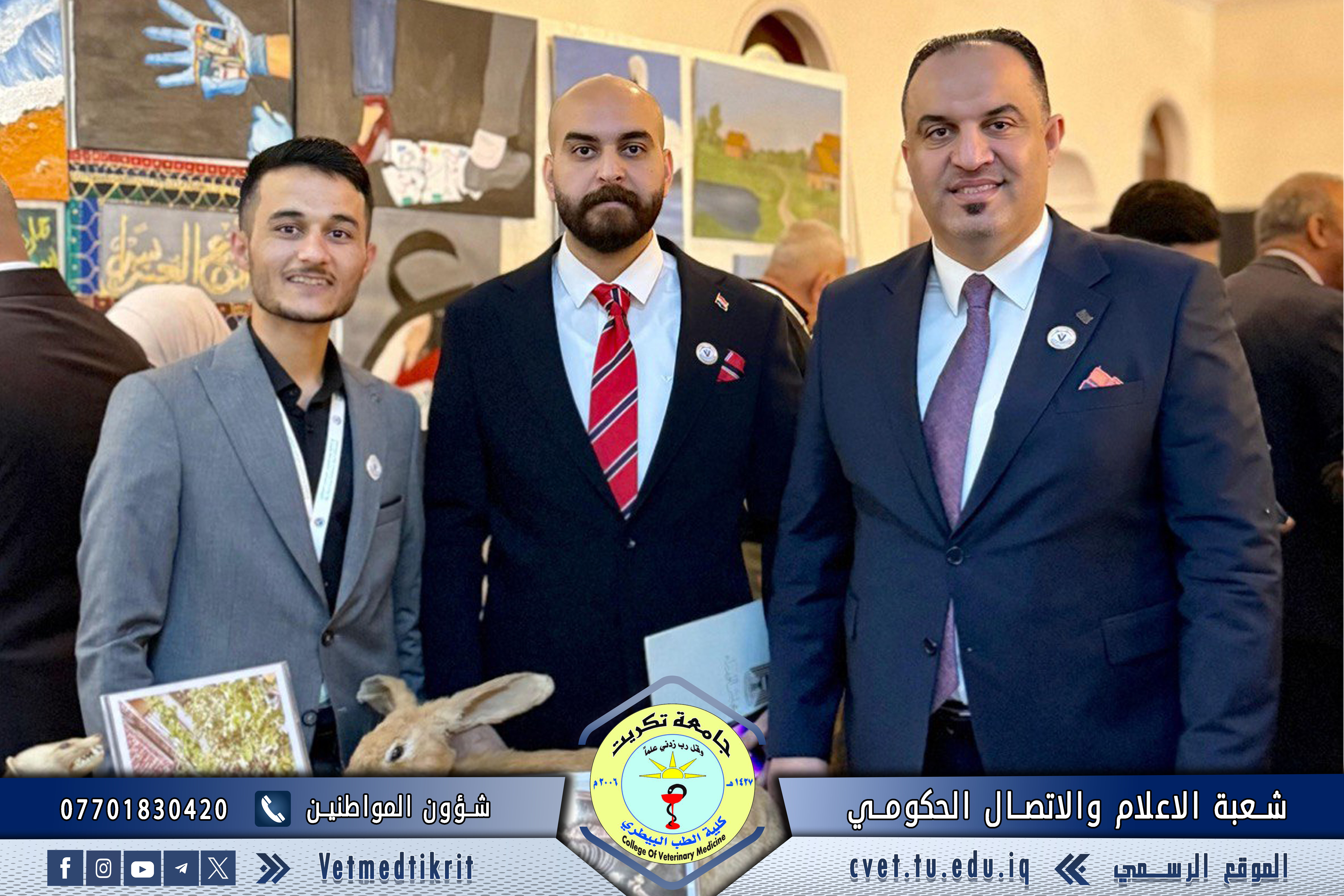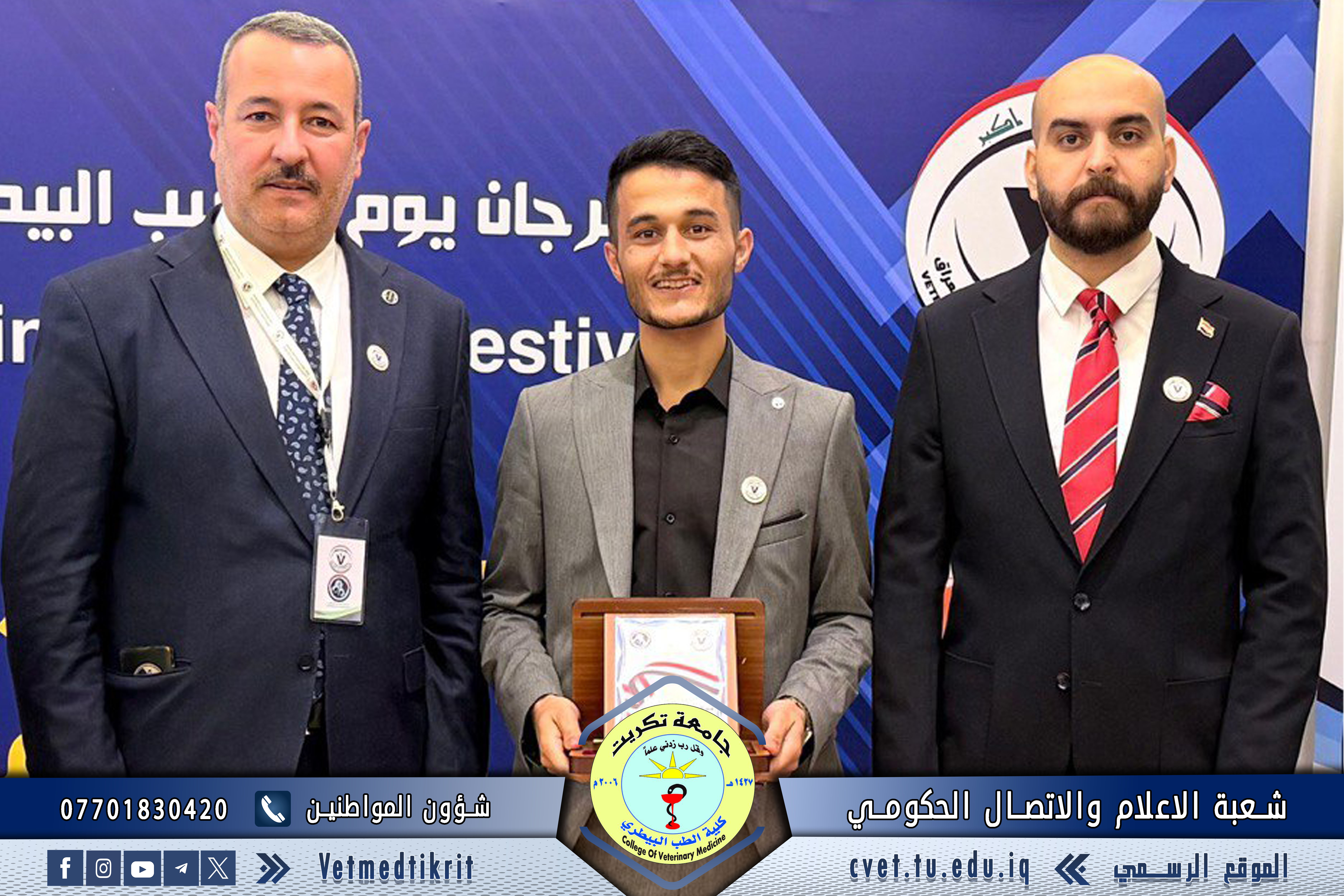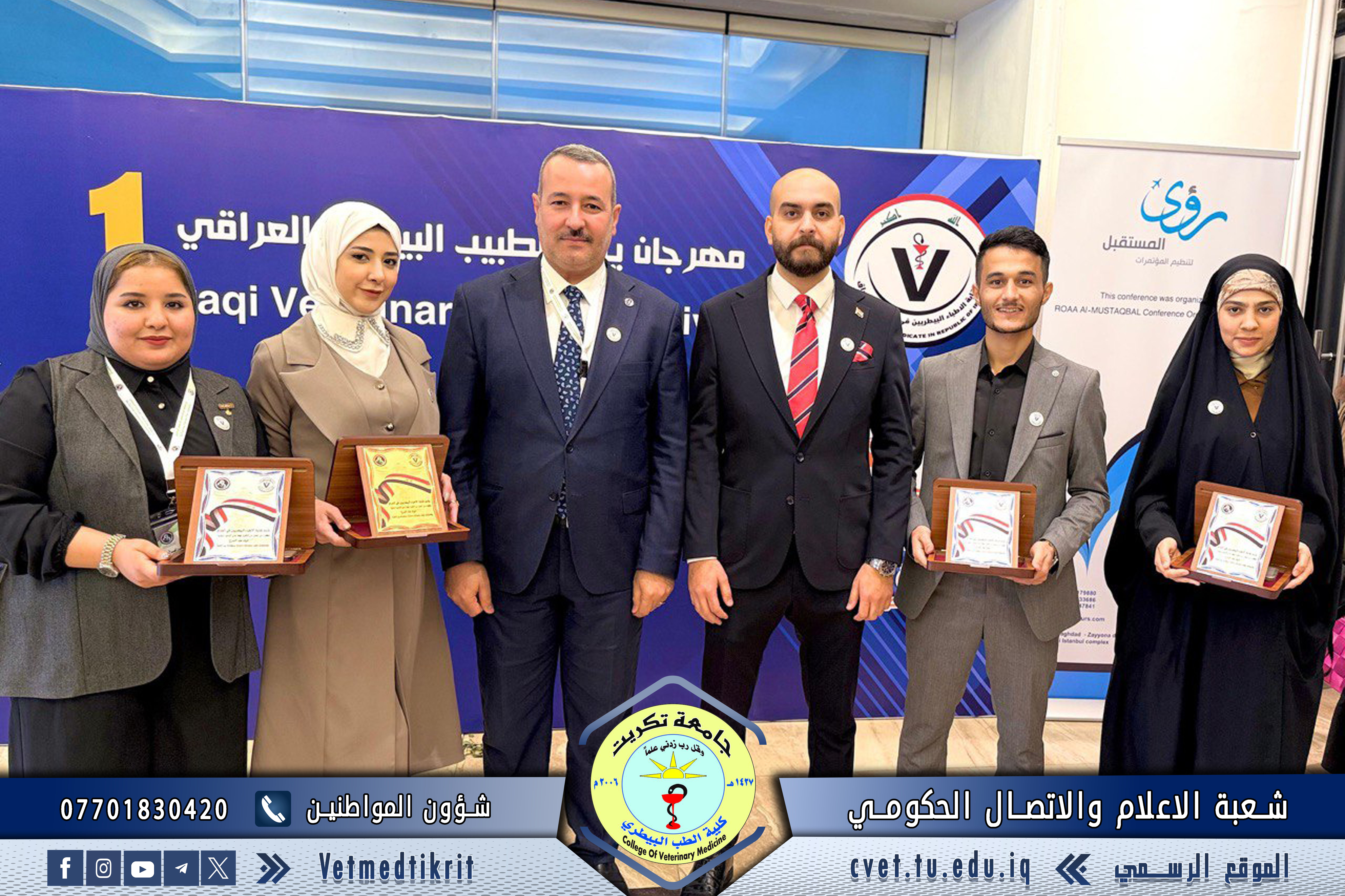 شارك وفد من كلية الطب البيطري بجامعة تكريت في احتفالية يوم الطبيب البيطري، التي أقيمت في نقابة الأكاديميين العراقيين بالعاصمة بغداد، بحضور عدد من الشخصيات الأكاديمية والمهنية في القطاع البيطري. وترأس الوفد الأستاذ الدكتور بشار صادق نومي، عميد الكلية، بحضور الدكتور نصار عبدربه، نقيب الأطباء البيطريين في محافظة صلاح الدين، وعدد من تدريسيي وخريجي الكلية. وقد شهدت الاحتفالية تكريم عدد من المتميزين من أبناء الكلية، حيث قام نقيب الأطباء البيطريين الدكتور علاء الحسناوي بتكريم كل من الدكتور علي غازي عطية والطبيب البيطري أثير إبراهيم مصطفى تقديرًا لجهودهم المتميزة وعطائهم العلمي والمهني في خدمة مهنة الطب البيطري. كما تم خلال الاحتفالية تكريم كل من الطبيبة البيطرية آية خالد إبراهيم، الطبيبة البيطرية هبة بلال كاظم، والطبيبة البيطرية نور الهدى وليد أحمد. وأكدت مشاركة الوفد عمق العلاقة بين الكلية ومؤسسات المهنة، وحرص الكلية على دعم خريجيها وتكريم المبدعين منهم، بما يعزز من مكانة الطبيب البيطري ودوره المحوري في حماية الصحة العامة وتعزيز الأمن الغذائي.