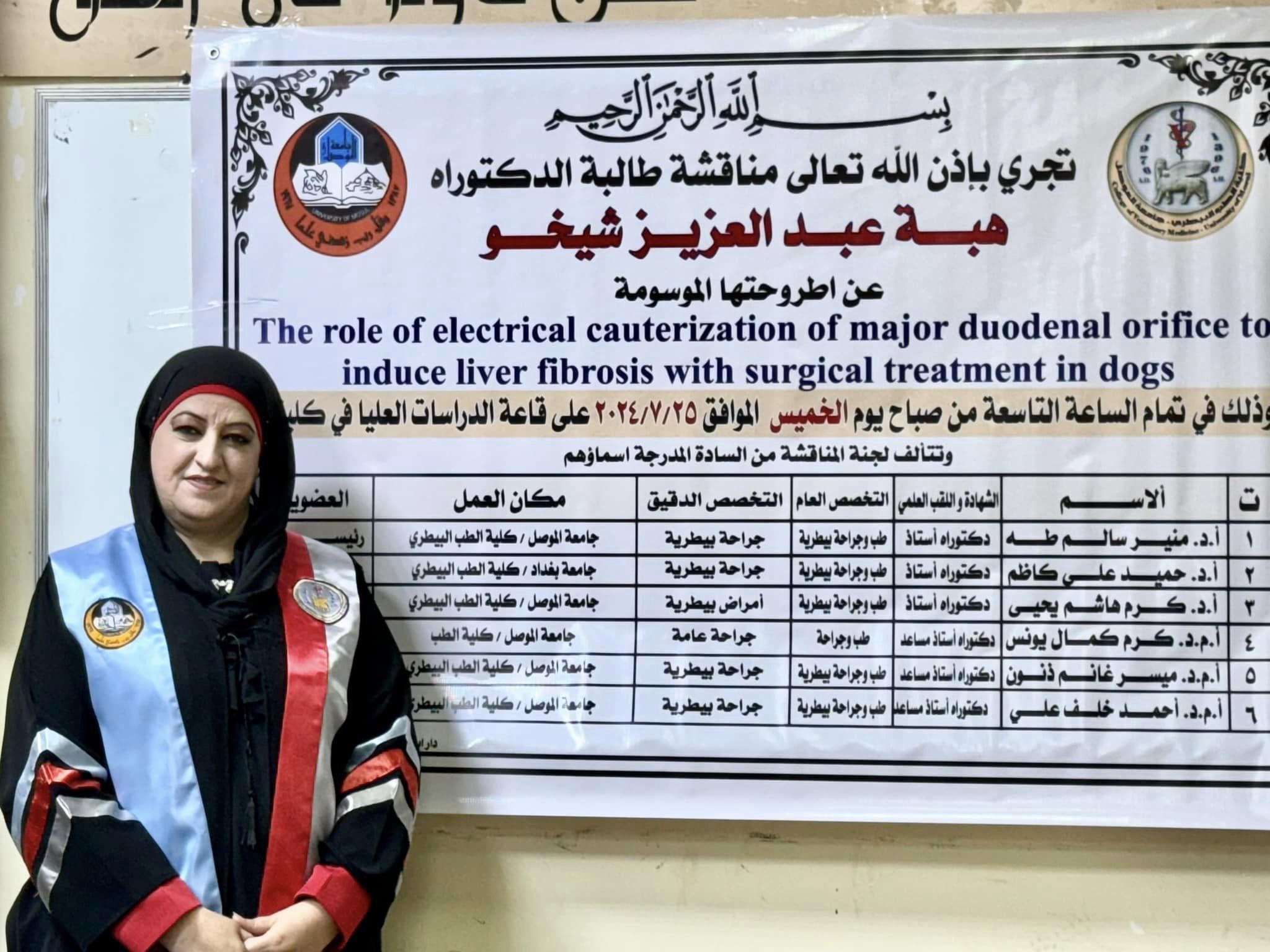 حصلت المدرس هبة عبدالعزيز شيخو التدريسية في كلية الطب البيطري بجامعة تكريت على شهادة الدكتوراه في تخصص (الجراحة البيطرية) من كلية الطب البيطري بجامعة الموصل وذلك عن اطروحتها الموسومة (دور الكّي الكهربائي لفتحة الاثني عشر الرئيسية لإحداث تليف الكبد وعلاجه جراحيا في الكلاب). حيث هدفت هذه الدراسة الى إحداث التليف الكبدي جراحيا عن طريق ربط القناة الصفراوية المشتركة بالمنظار والجراحة التقليدية باستخدام مواد جراحية جديدة وعلاج هذا التليف جراحيا عن طريق زرع وتثبيت المرارة في الصائم. وتم استنتاج ان الجراحة التقليدية باستخدام أسلاك الفولاذ المقاوم للصدأ لربط القناة الصفراوية المشتركة لإحداث تليف الكبد كانت متفوقة من حيث الكفاءة بالمقارنة مع الجراحة بالمنظار، بالاضافة الى ذلك كانت طريقة زرع المرارة في الصائم فعالة وأدت الى علاج التليف واستعادة وظيفة القناة الصفراوية في الكلاب مما يجعلها ذات قيمة لدراسة عملية التعافي من تليف الكبد الركودي خاصة في المراحل المبكرة من التليف.