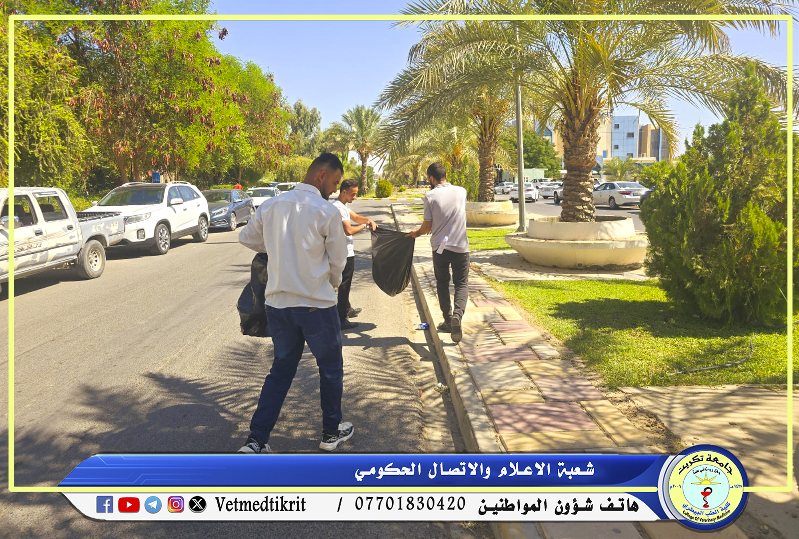 برعاية رئيس جامعة تكريت الاستاذ الدكتور وعد محمود رؤوف رئيس جامعة تكريت المحترم وبإشراف الاستاذ الدكتور بشار صادق نومي عميد كلية الطب البيطري ومن أجل تعزيز روح النشاط التطوعي وغرس القيم التعاونية بين الطلبة وضمن مفردات المنهاج السنوي للفصل الدراسي الاول نظمت شعبة النشاطات الطلابية في الكلية وبالتعاون مع قسم النشاطات الطلابية التابع لرئاسة الجامعة وقسم شؤون الديوان حملة تطوعية للحفاظ على البيئة من خلال حملة تنظيف واسعة شملت أروقة الجامعة فضلا عن مبنى رئاسة الجامعة. وأوضحت الدكتورة ابتسام حيدر مسؤولة قسم النشاطات الطلابية في الجامعة أن الحملة تمت بمشاركة شعب النشاطات الطلابية في كليات الجامعة من اجل بيئة جامعية نظيفة، حيث عبر المشاركون عن استعدادهم الكامل لإقامة مثل هذه النشاطات التي تهدف إلى الحفاظ على البيئة بشكل عام وعلى نظافة الجامعة بشكل خاص، وتعكس صورة ناصعة عن اخلاقيات والتزام الطلبة في الحفاظ على بيئتهم الجامعية.
