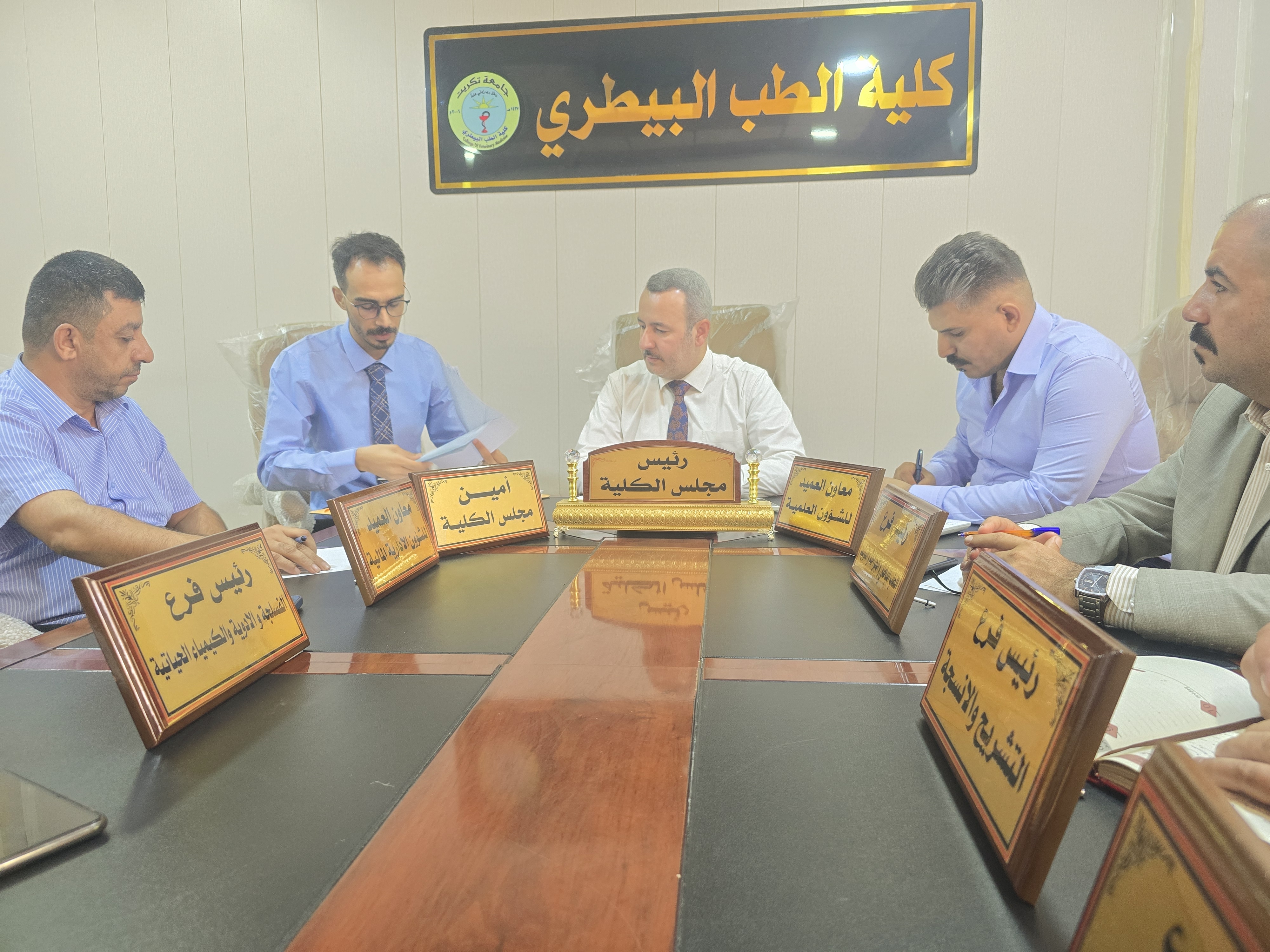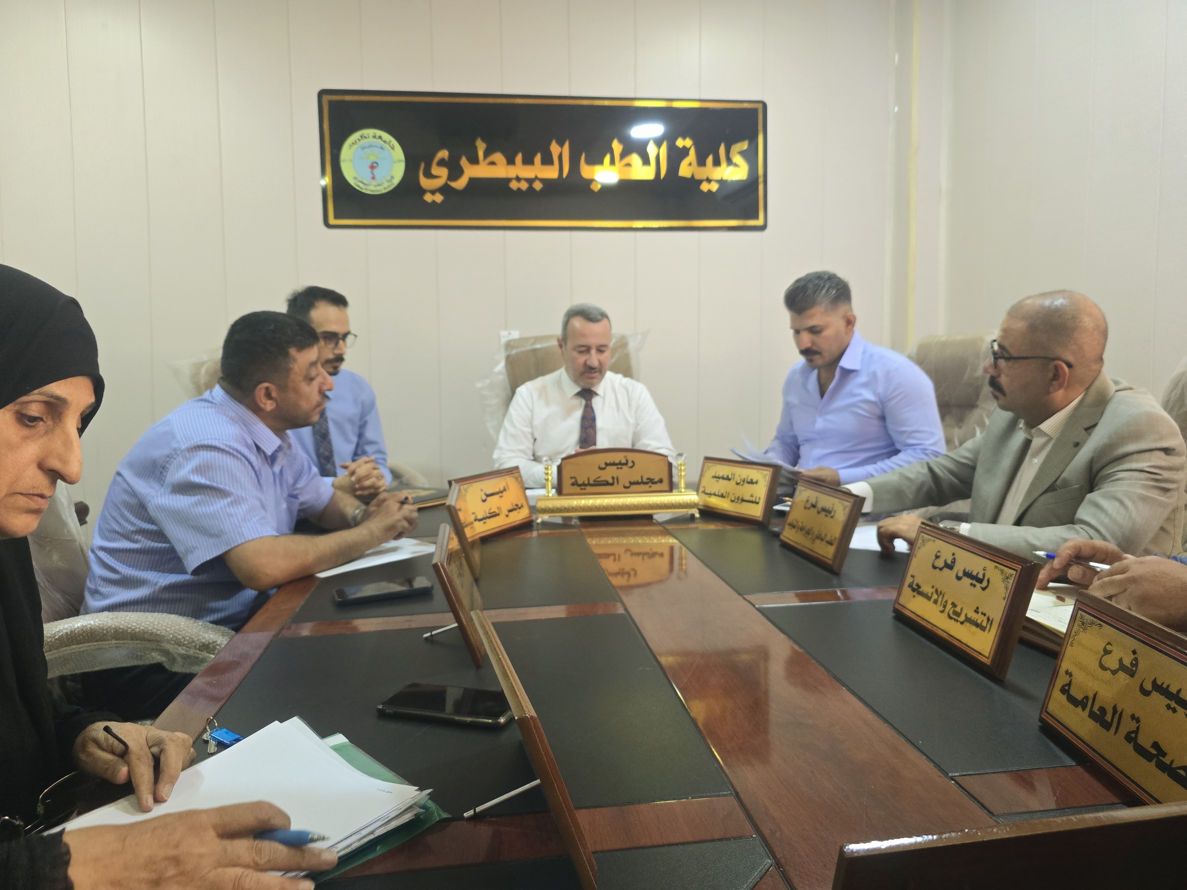 بحضور الاستاذ الدكتور بشار صادق نومي عميد كلية الطب البيطري بجامعة تكريت عقد مجلس الكلية جلسته الاعتيادية الثانية بحضور السيدات والسادة رؤساء الفروع العلمية في الكلية، حيث ناقش اعضاء المجلس خلال الجلسة عددا من المواضيع والنقاط المدرجة على جدول اعماله واتخذ القرارات اللازمة بشأنها.