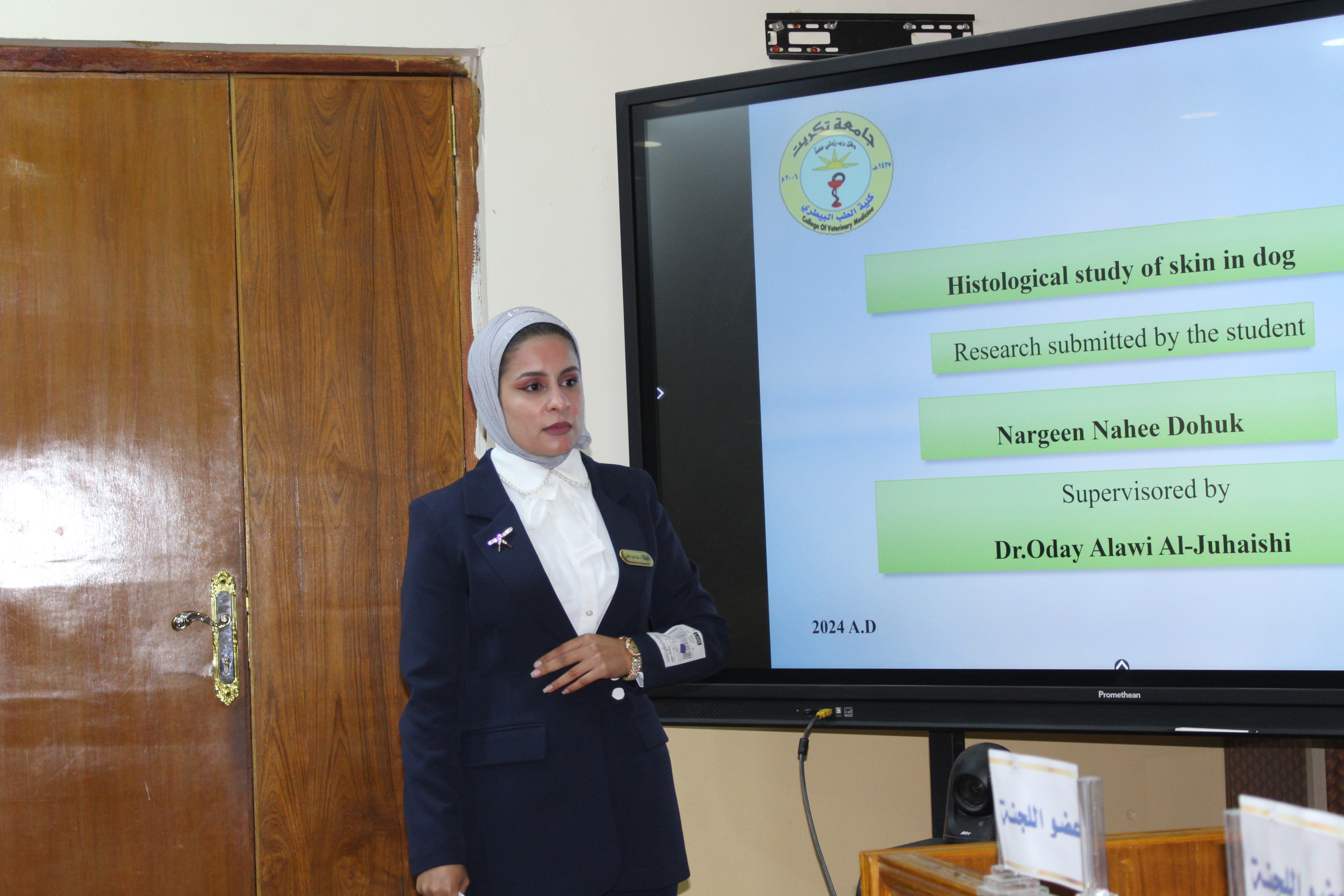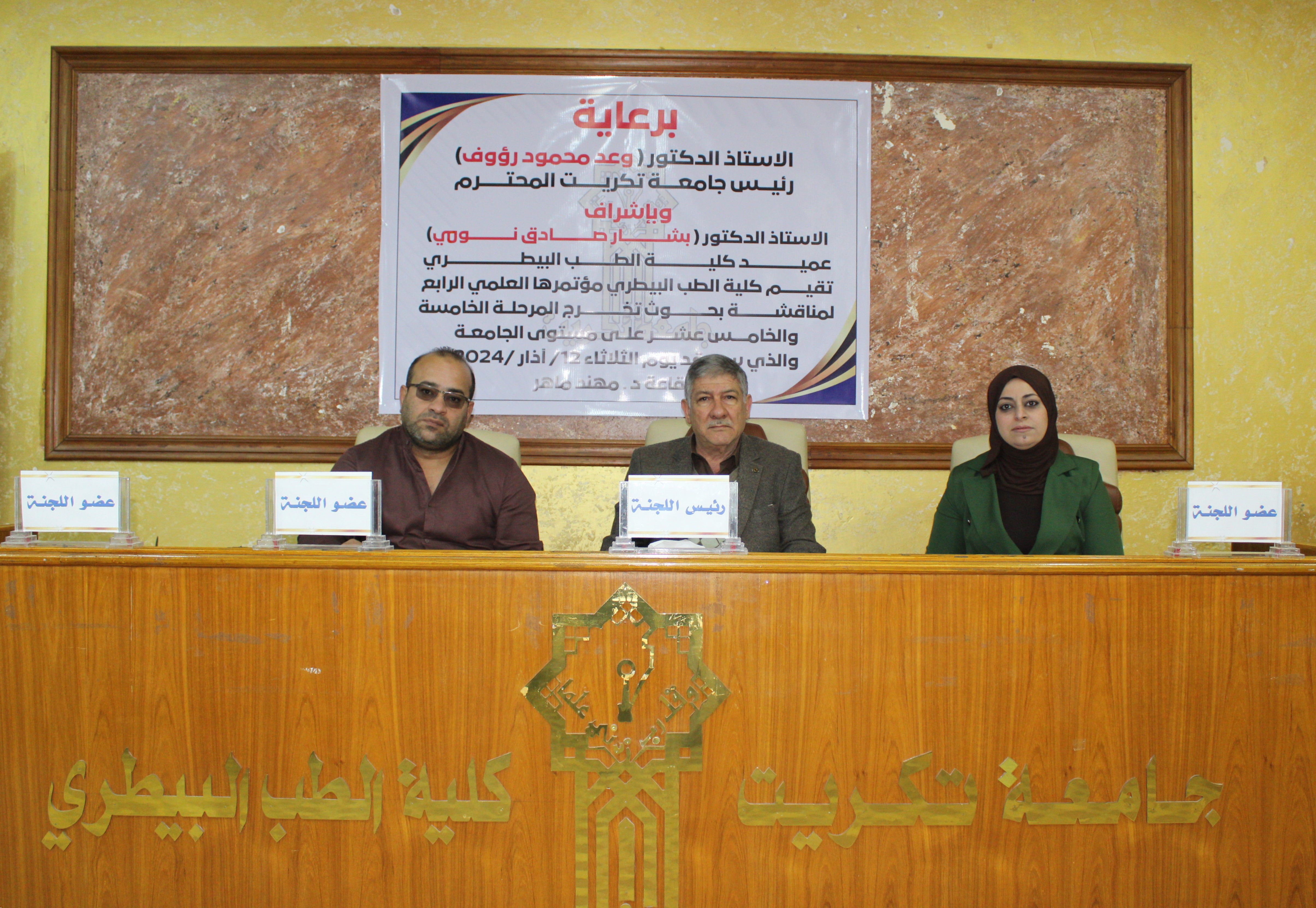 باشراف الاستاذ الدكتور بشار صادق نومي عميد كلية الطب البيطري بجامعة تكريت وضمن فعاليات المؤتمر العلمي الرابع لمناقشة بحوث التخرج لطلبة المرحلة الخامسة تم بتاريخ 2024/3/26 مناقشة بحوث التخرج لطلبة المرحلة الخامسة في تخصص التشريح. حيث تم مناقشة 10 بحوث تم مناقشتها من اللجنتين المؤلفتين من كل من أ.د. اياد حميد ابراهيم، ا.م.د. بدر ختلان حميد، م.د. فراس عباس حسين، م.د. عدي علاوي جاسم، م. نور عدنان عزاوي، وم. مروة عادل حميد. وتنوعت موضوعات بحوث التخرج في تخصصات التشريح والانسجة والاجنة وغيرها من التخصصات المتعلقة بعلم التشريح.