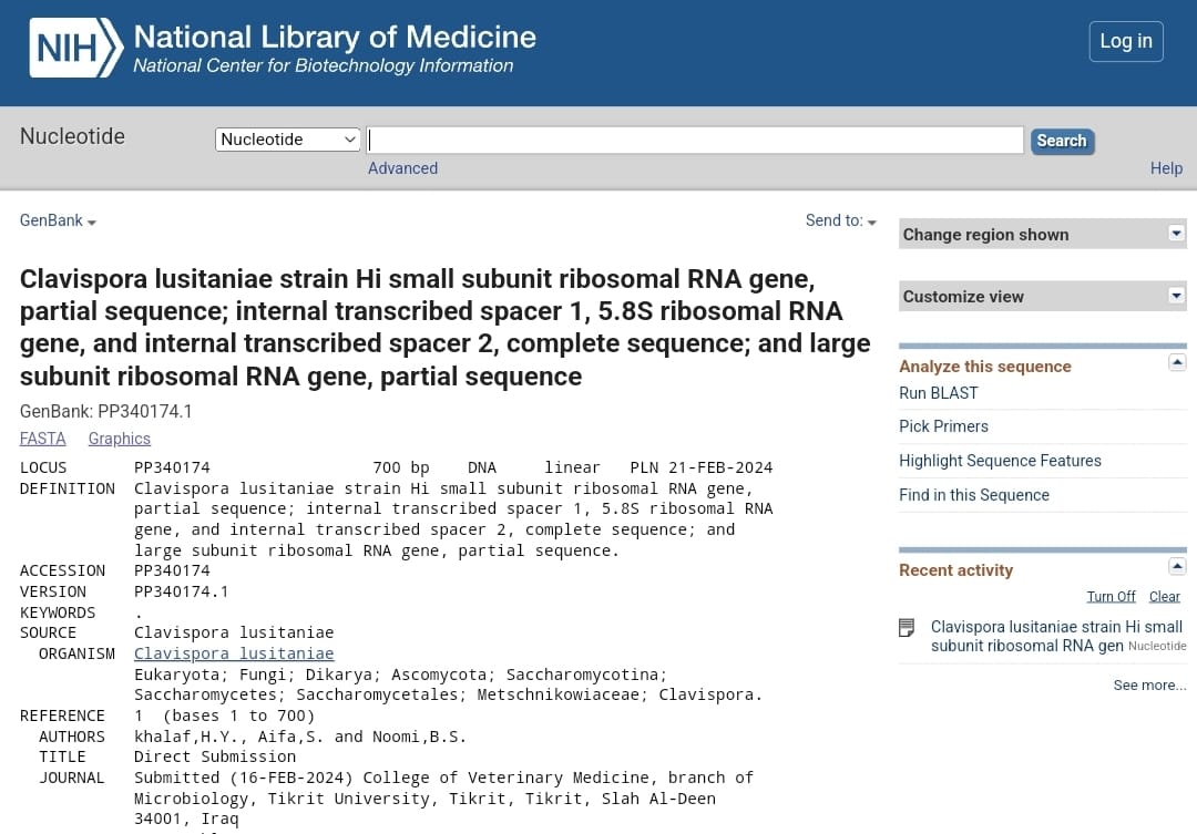 كما تمكن الفريق البحثي المؤلف من كل من الاستاذ الدكتور بشار صادق نومي والاستاذة طالبة الدكتوراه هبة يونس خلف والاستاذ الدكتور سامي عيفا من جامعة صفاقس في تونس من تسجيل عزلة للفطر Clavispora Lusitaniae في بنك الجينات العالمي تحت المسمى PP340174.